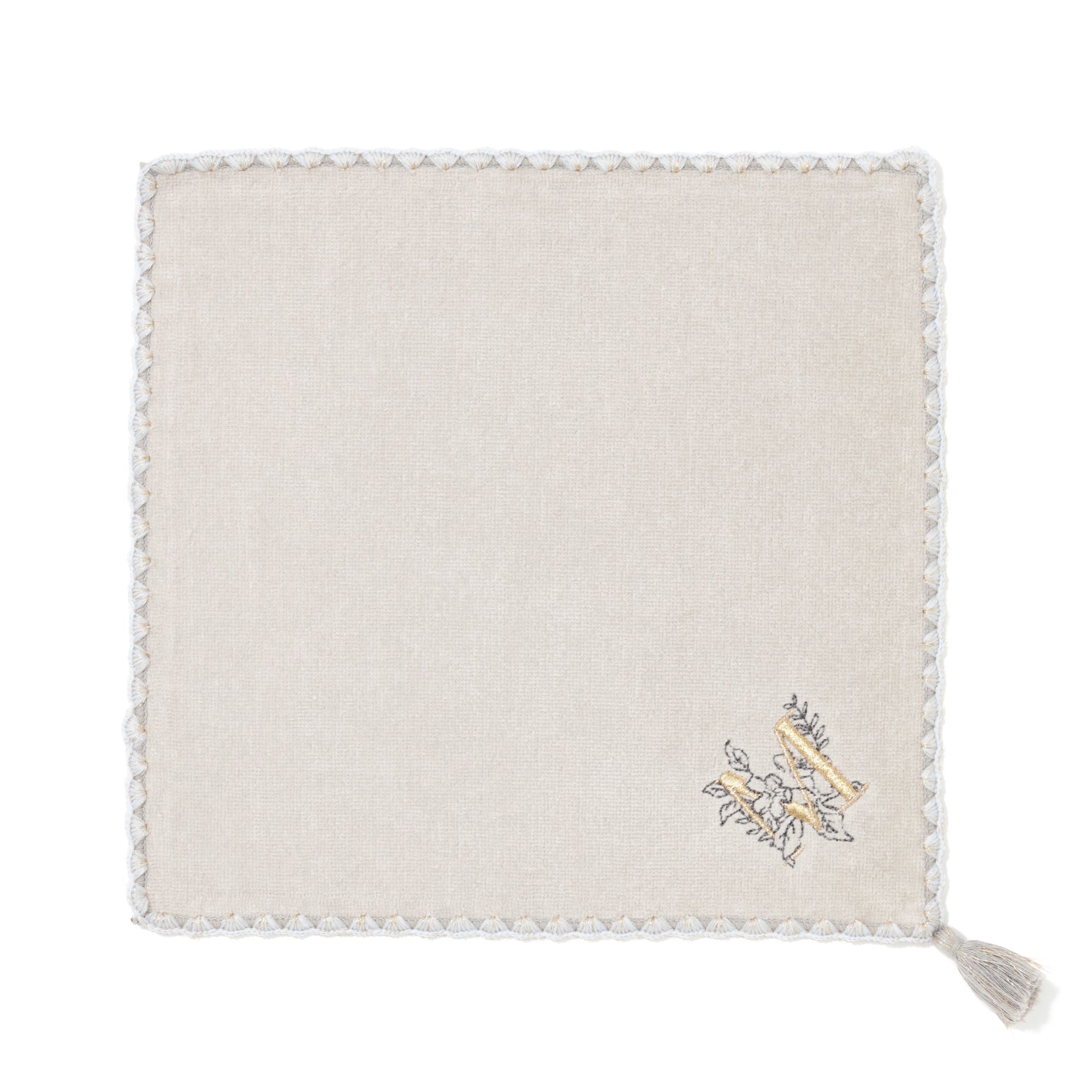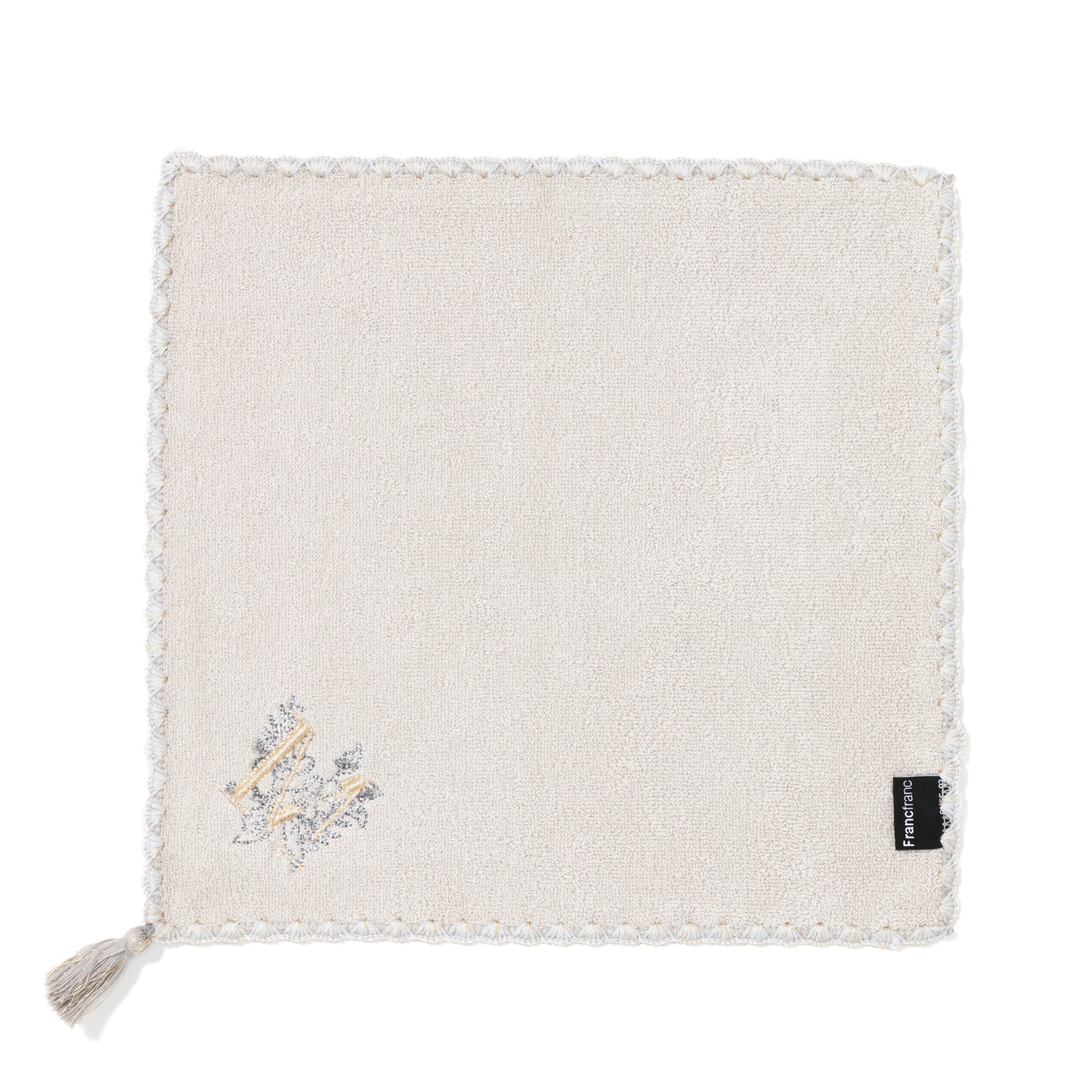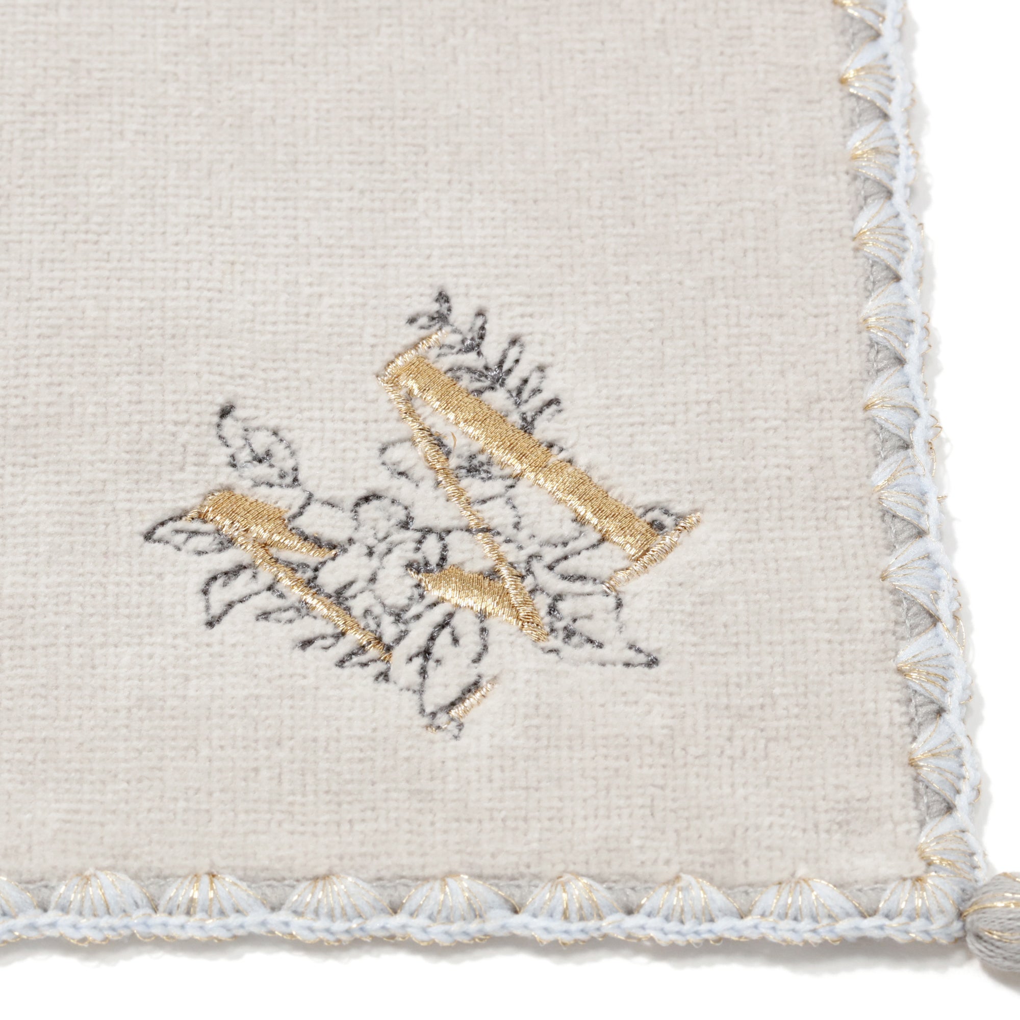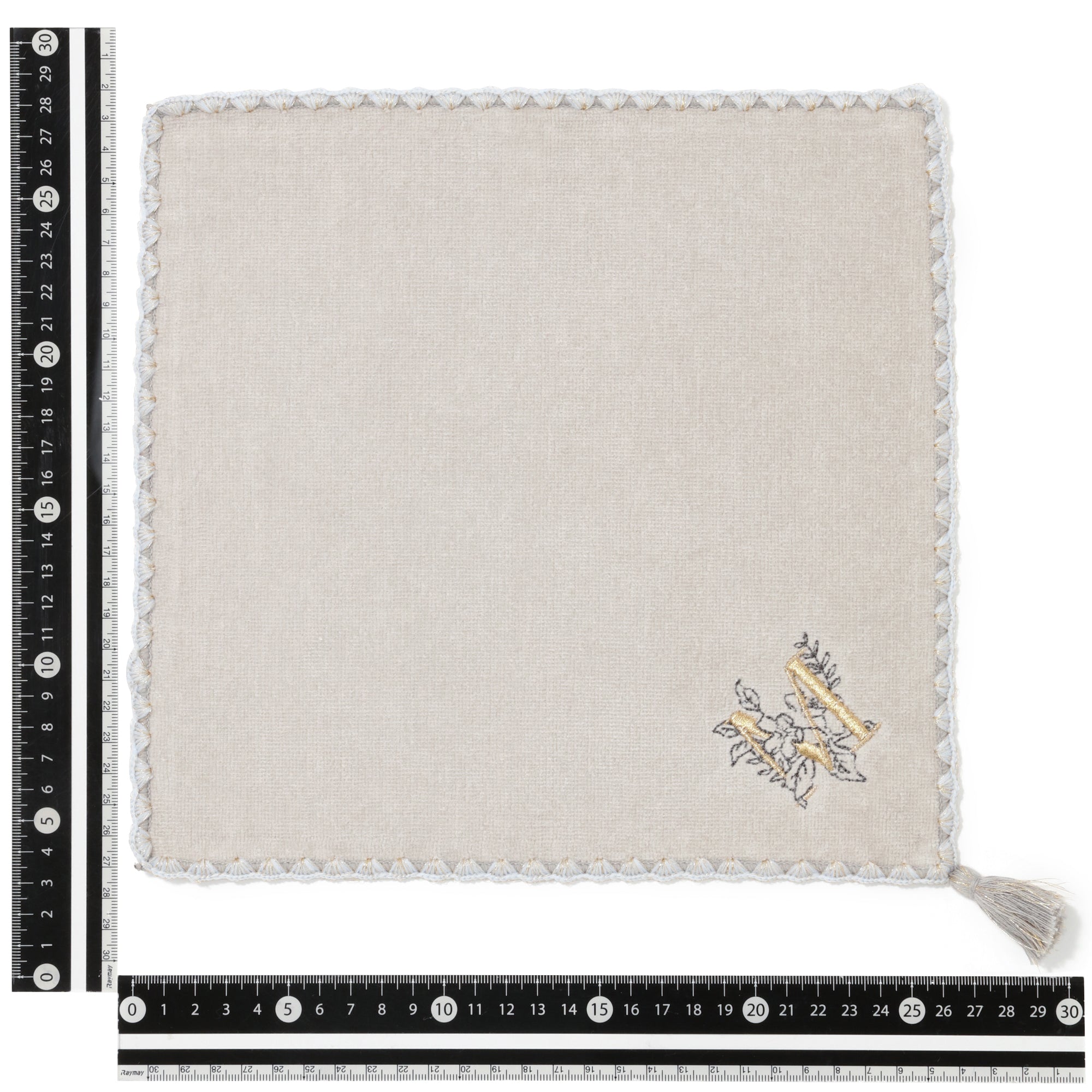 イニシャルに関連する花の刺繍をあしらった上品なハンカチタオルです。シェルメローを施した上品なデザインはギフトにも最適です。