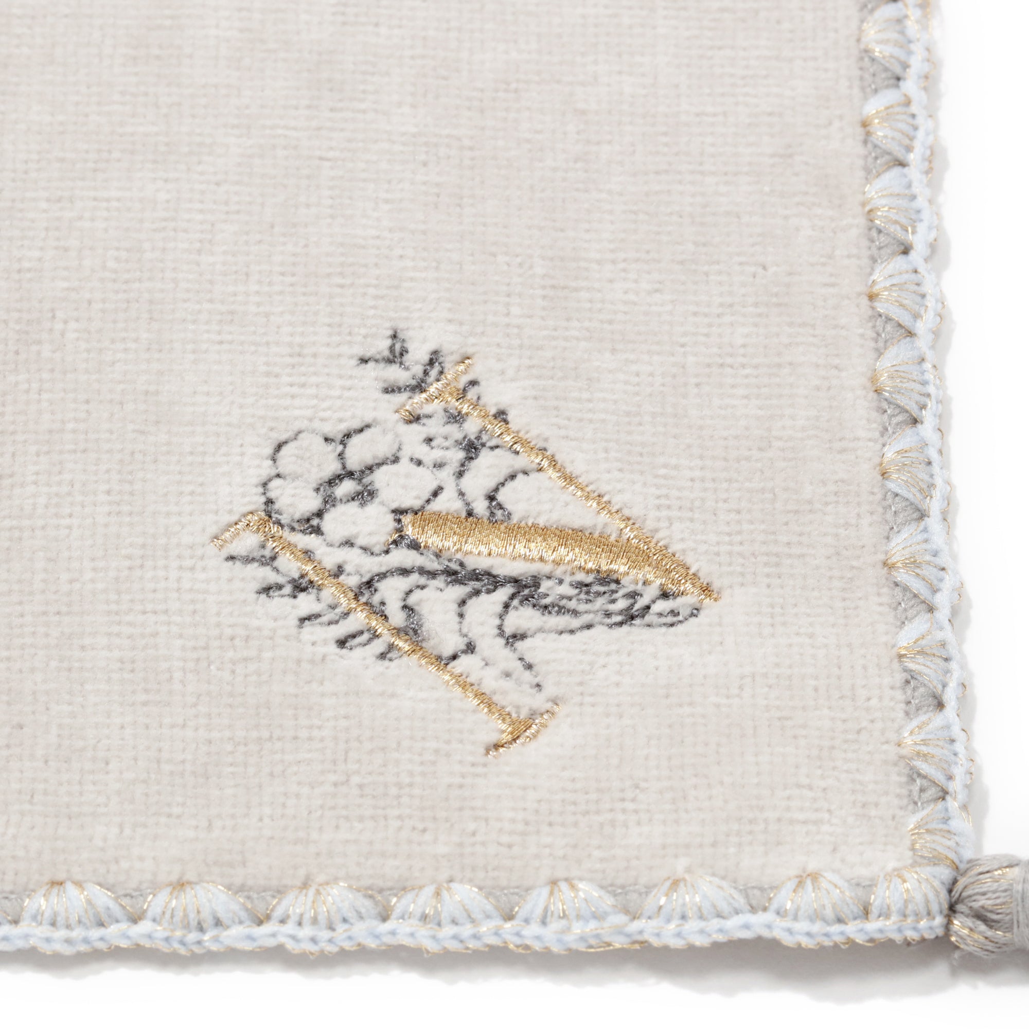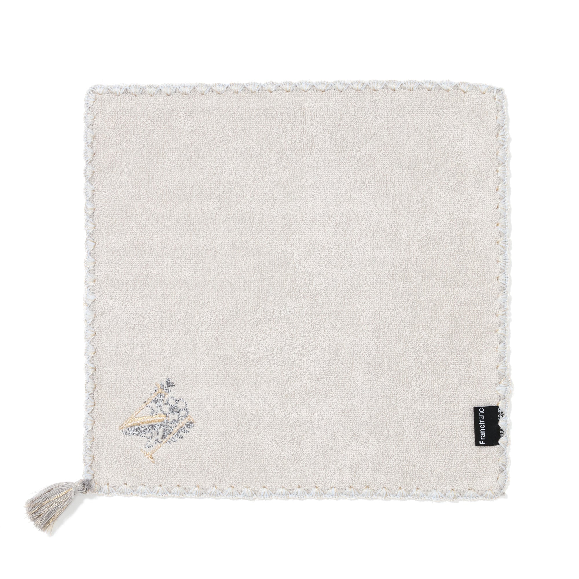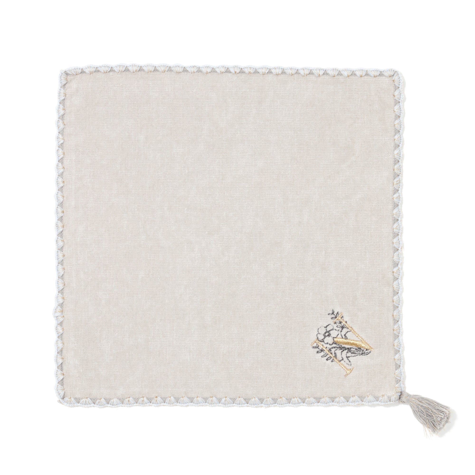 イニシャルに関連する花の刺繍をあしらった上品なハンカチタオルです。シェルメローを施した上品なデザインはギフトにも最適です。