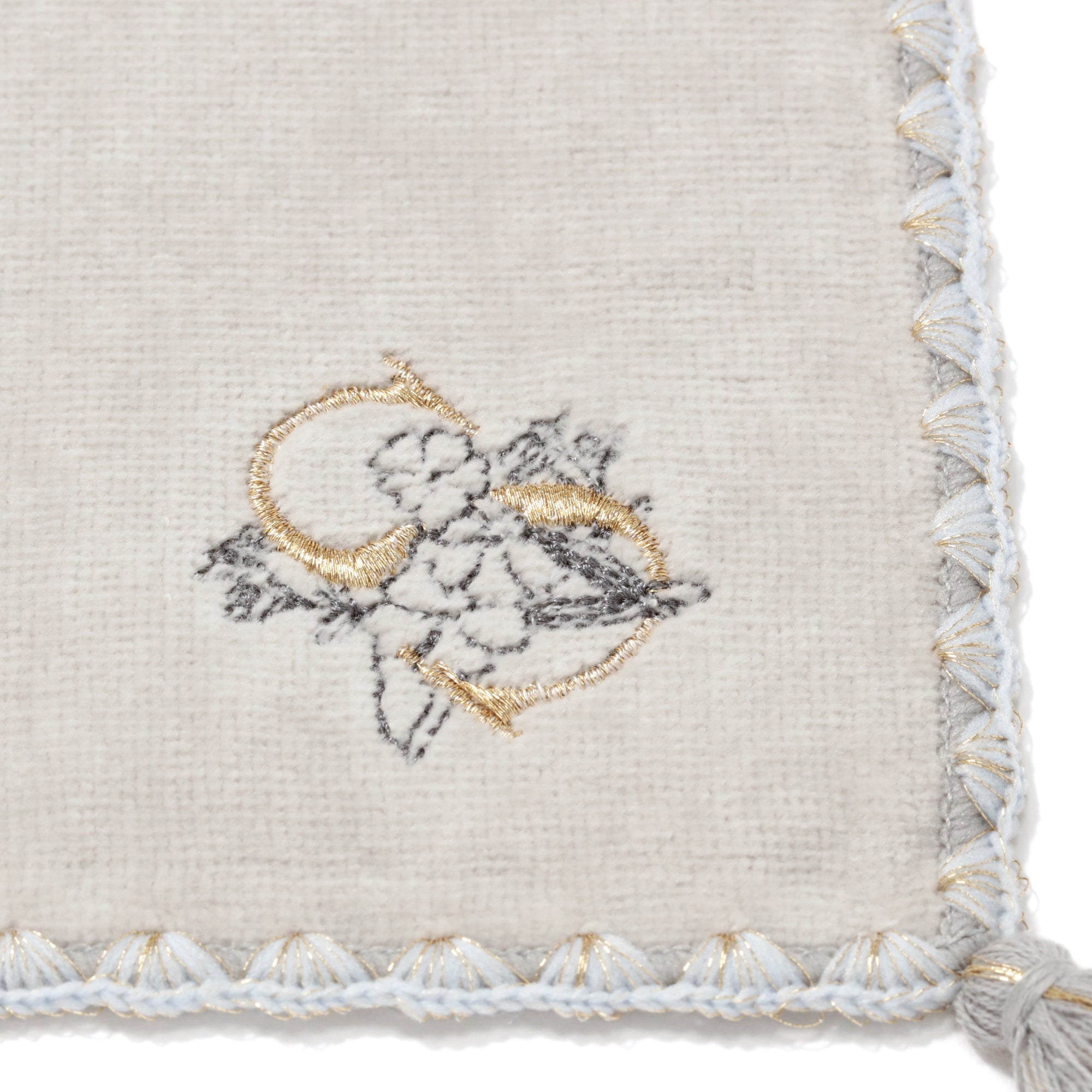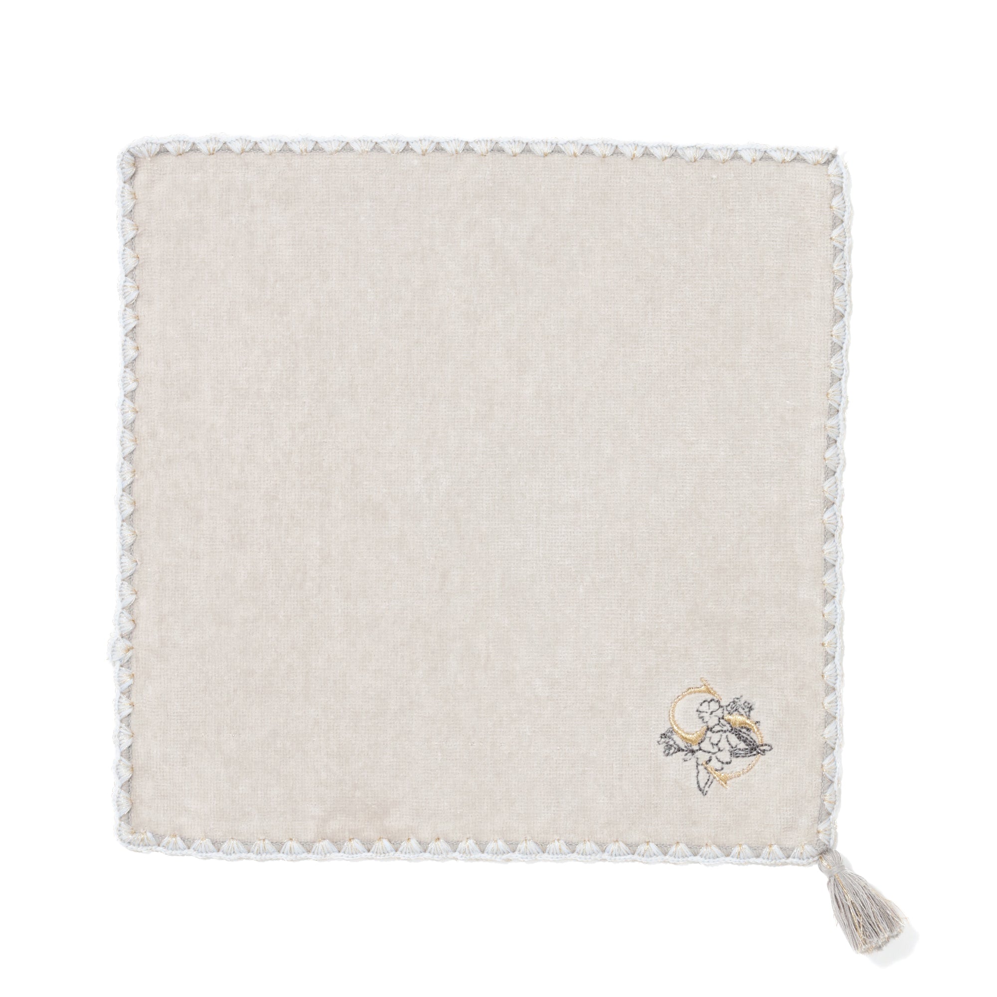 イニシャルに関連する花の刺繍をあしらった上品なハンカチタオルです。シェルメローを施した上品なデザインはギフトにも最適です。