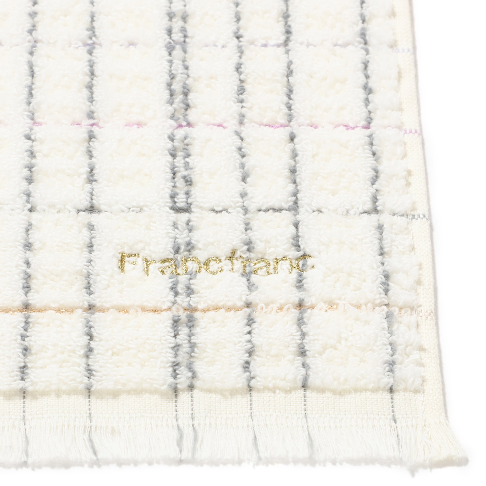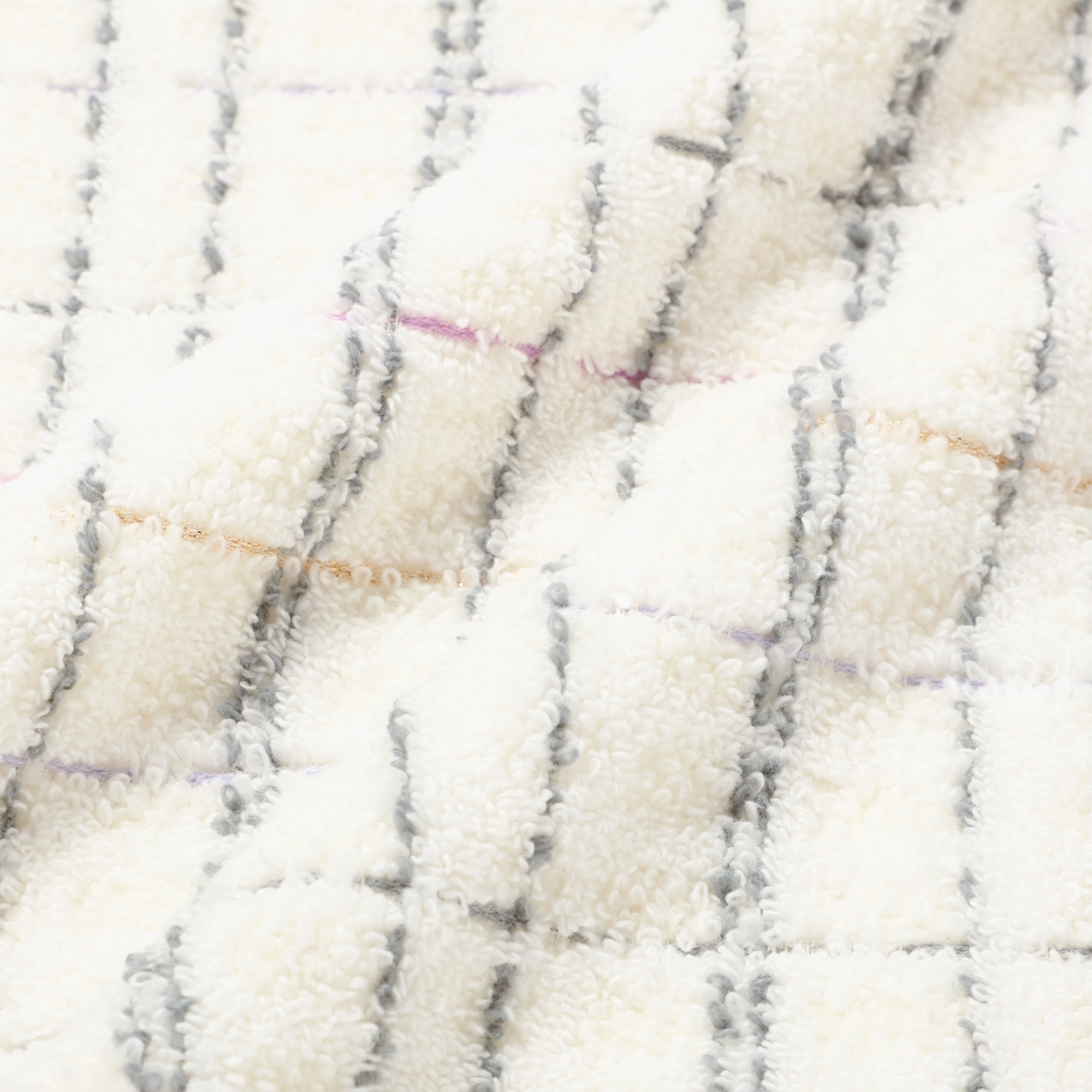 織物のツイードのようなデザインのフェイスタオルです。 無撚糸のパイルとシャーリングの組み合わせで肌触りよくお使いいただけます。