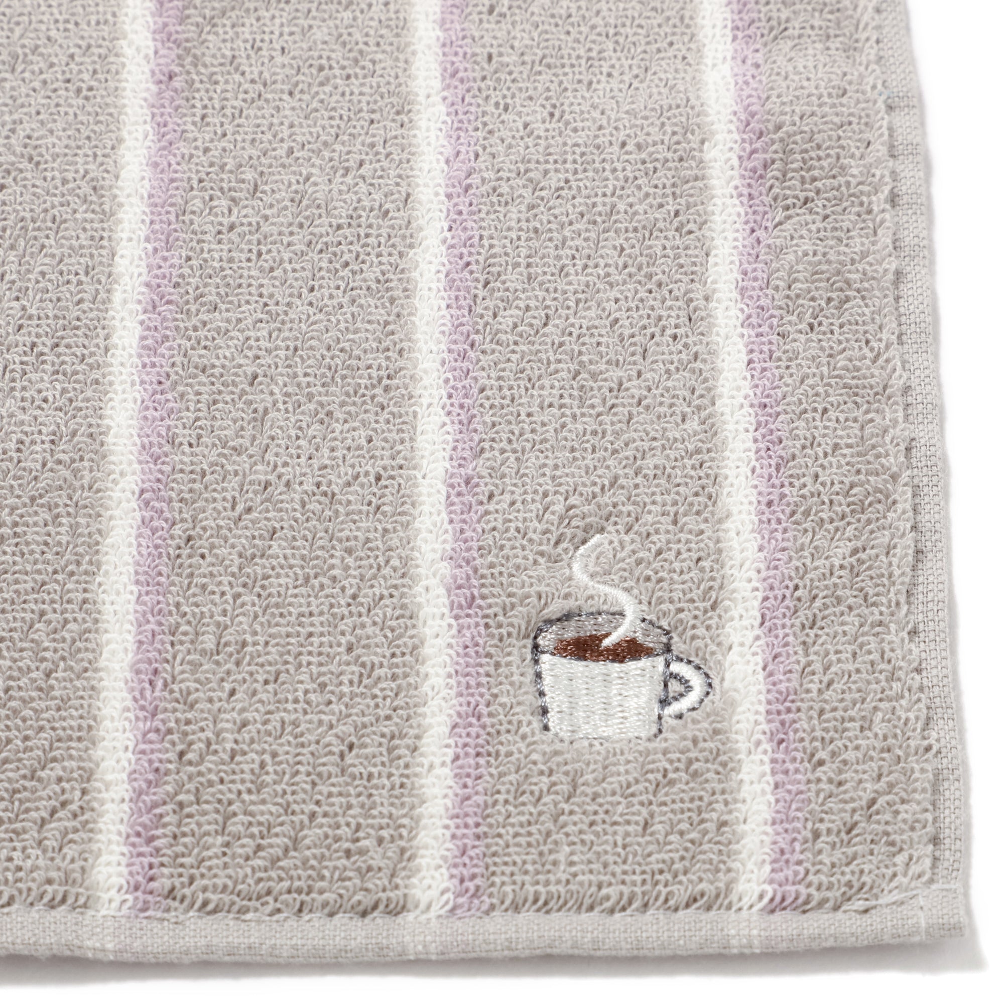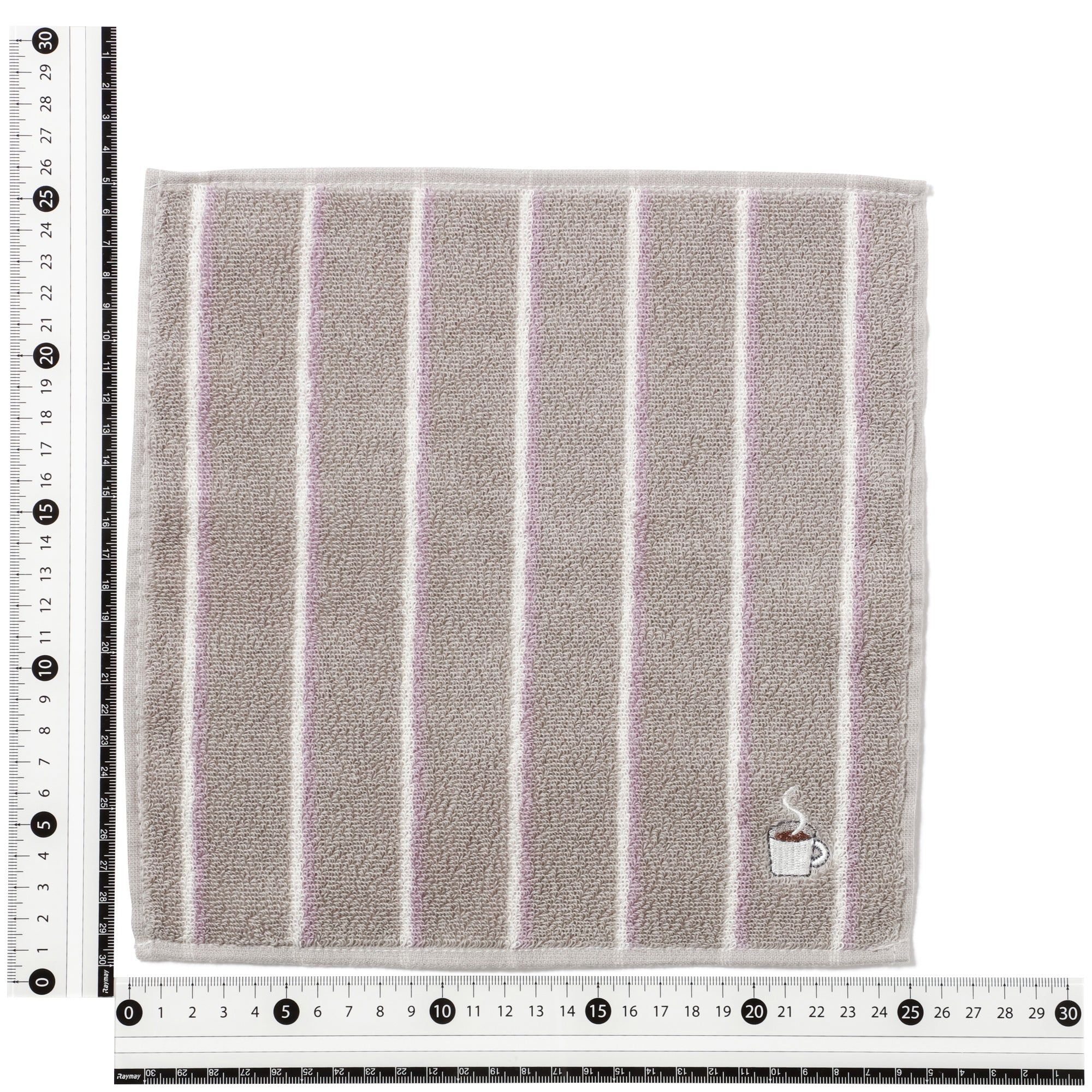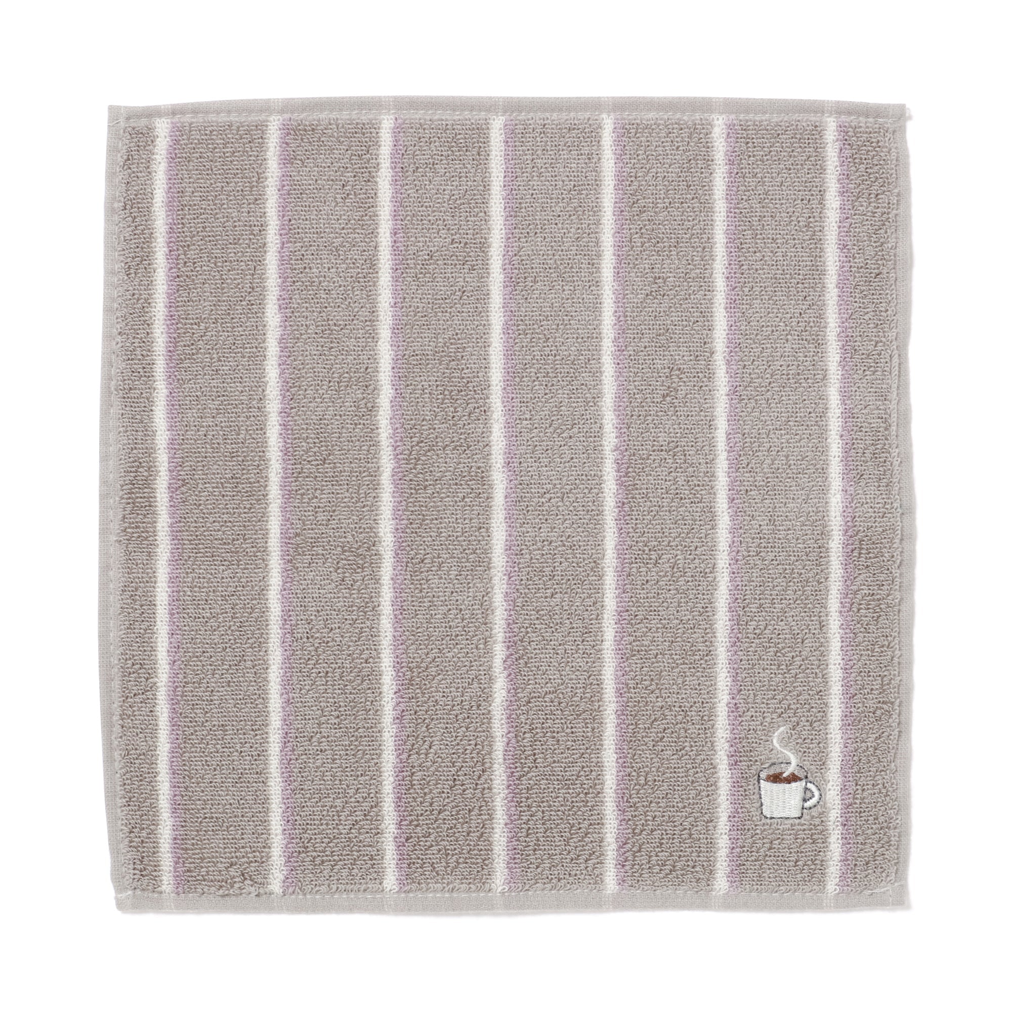 ストライプにコーヒーカップの刺繍が入ったハンカチタオルです。 薄手のパイル地なので、パンツの後ろポケットにも入れ易く、男女問わずお使いいただきやすいデザイン。 抗菌防臭機能つきで衛生面も安心してご使用いただけます。