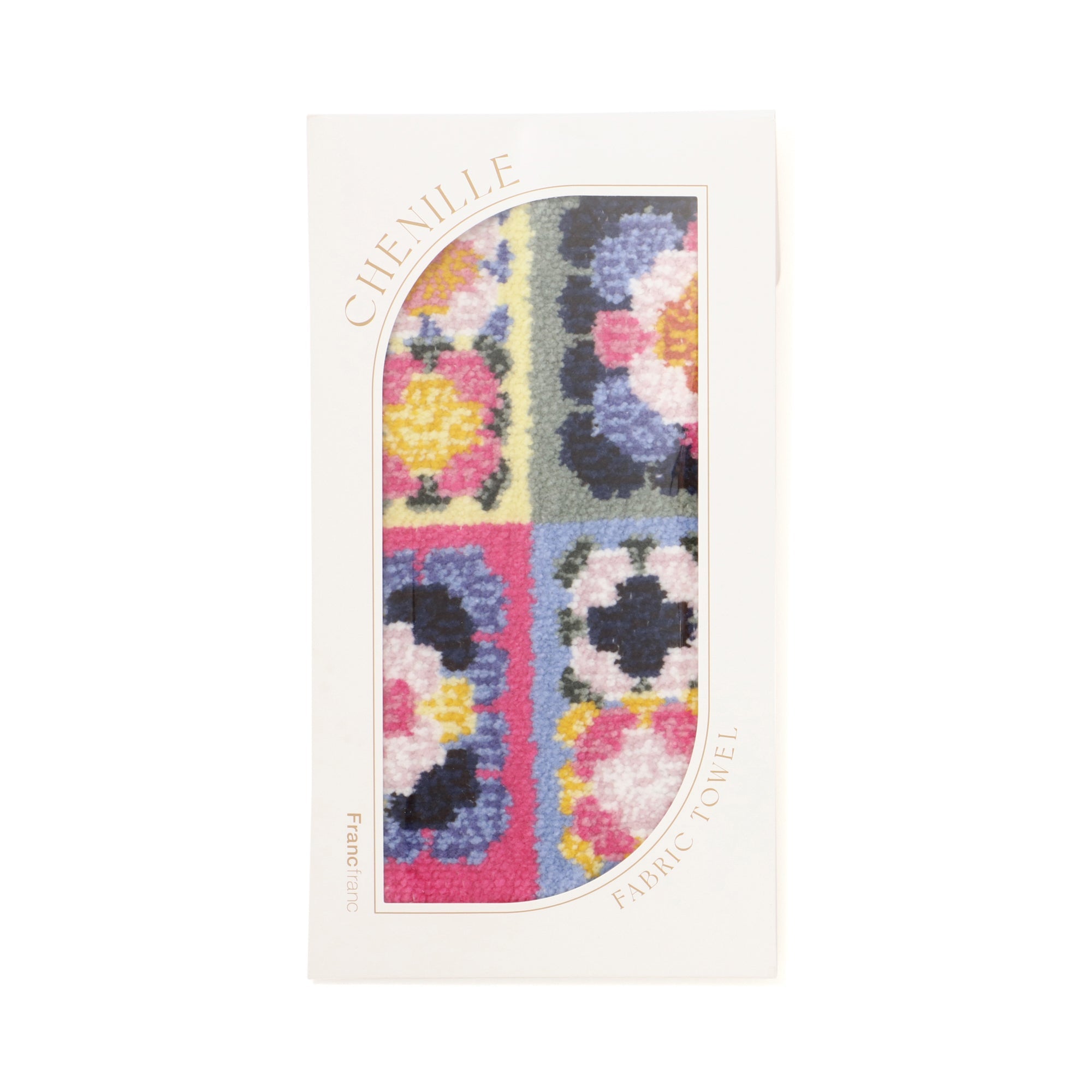 Francfrancらしいお花柄のハンカチタオルです。 滑らかな手触りのシェニール織は両面に同じ柄がデザインされ、毛羽だった生地が非常に柔らかく、丈夫で吸水性も抜群です。 ギフトにもおすすめです。