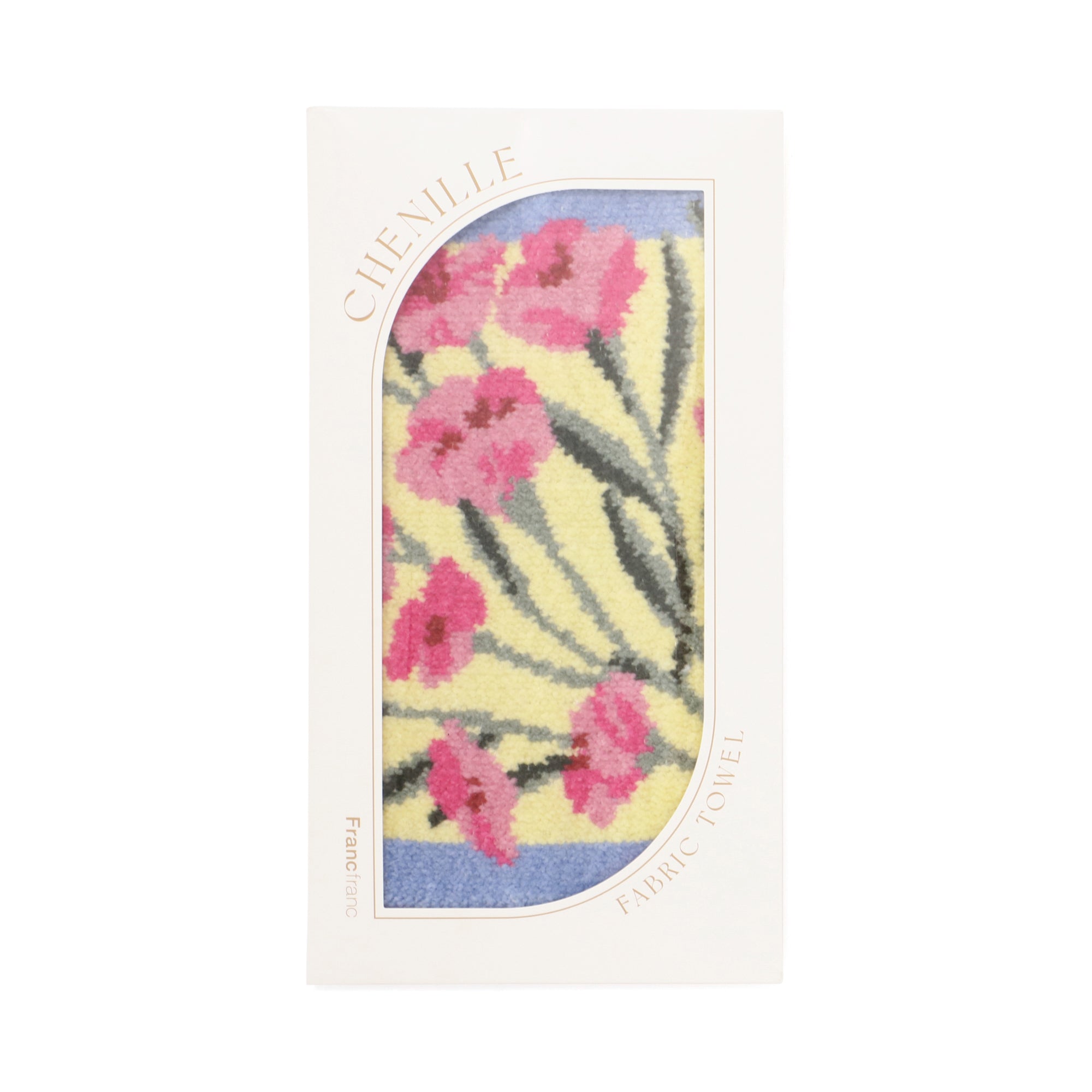 Francfrancらしいお花柄のハンカチタオルです。 滑らかな手触りのシェニール織は両面に同じ柄がデザインされ、毛羽だった生地が非常に柔らかく、丈夫で吸水性も抜群です。 ギフトにもおすすめです。