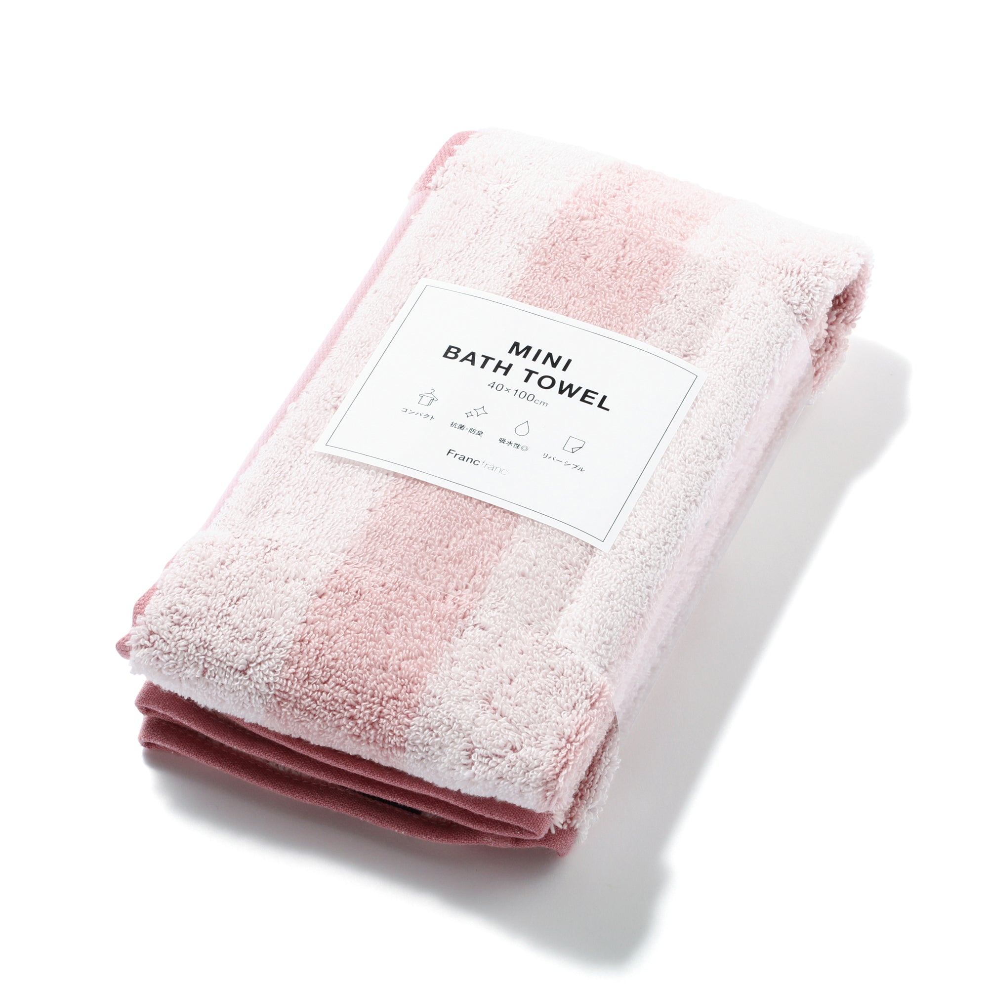 お洗濯が楽でかさばらずに収納できるミニバスタオルです。髪とからだをきっちり拭き取れるコンパクトなサイズだから、バスタオルでは大きすぎフェイスタオルでは小さすぎるという方におすすめです。無撚糸で吸水性に優れ、ふんわりとしたボリュームが楽しめます。気分によって使い分けできるリバーシブルデザインも嬉しいポイント。お好みに合わせて選べるカラー・柄を豊富にご用意しました。部屋干しでも安心の抗菌防臭機能付き。サイズW400×D1000×H5mm素材コットン100%重量0.145 kgカラーPK品番 1105170078718 全国一律550円(税込)です。雑貨の商品金額合計が5,000円(税込)以上の場合、送料無料で配送いたします。※手数料、ラッピング料、付帯サービス料は含みません。※新生活期・年末年始は出荷や配送の繁忙期となるため、日時指定をいただいてもご希望日時通りお届け出来ないことがございます。■洗濯機:可■ドライクリーニング:不可■タンブル乾燥:不可■アイロン:不可■はっ水加工:無■直射日光やライトに長時間照らされると変色することがあります。■素材の特性上、毛羽立ち、毛羽落ち、パイル抜けが生じます。■初め数回のお洗濯には柔軟剤の使用はお避けください。■摩擦やお洗濯により色落ちや色移りが生じることがあります。濡れた状態で長時間放置 しないでください。■くず取りネットと洗濯ネットを併用し単独洗いをし てください。■お洗濯により多少縮みます。■漂白の際は酸素系漂白剤を使用してください。■タンブル乾燥は避け形を整えて陰干ししてください。■特性上、糸が飛び出したりしますので引っ張ったり、引っ掛けたりしないでください。抗菌・防臭作用は、永続的な効果ではありません。■原産国:中国