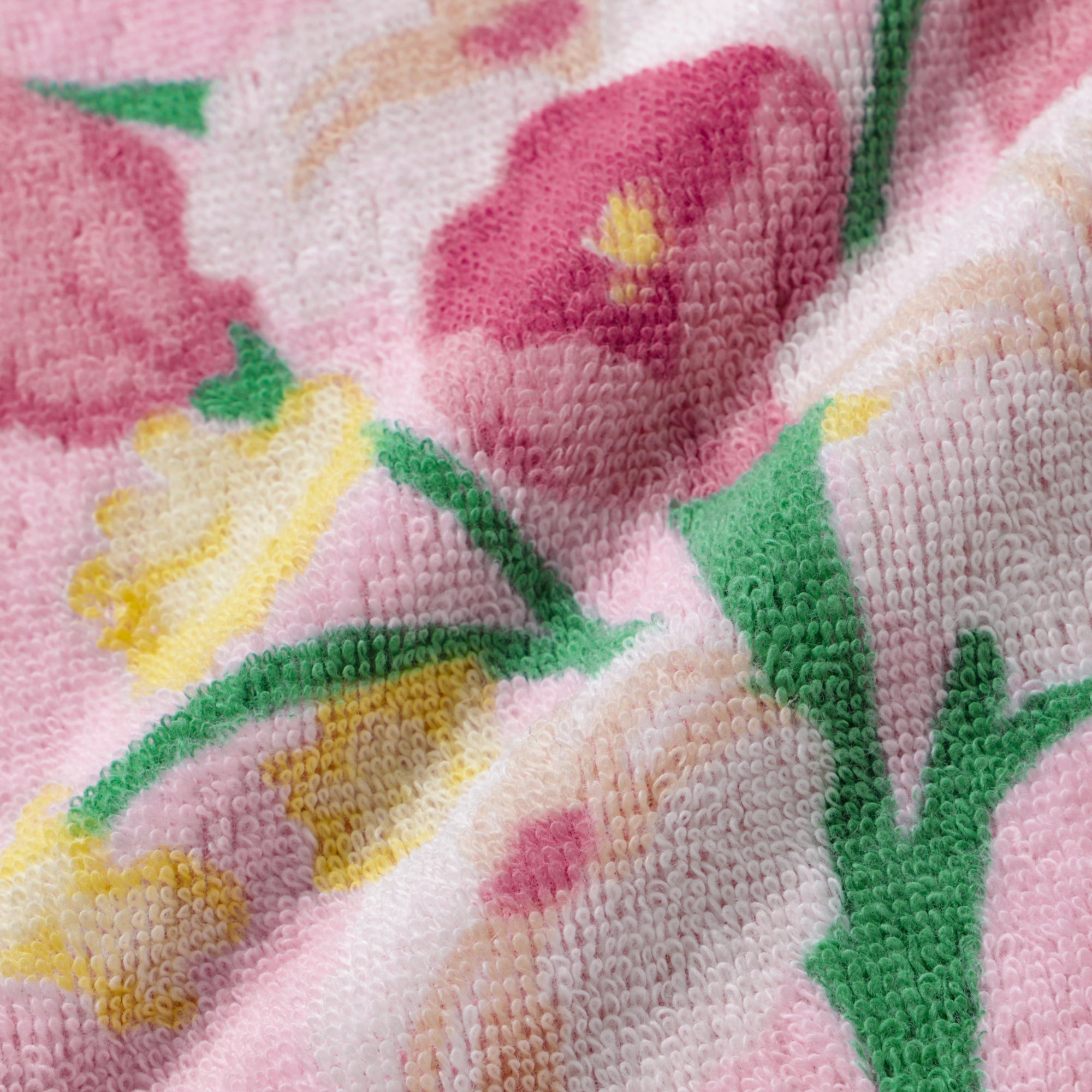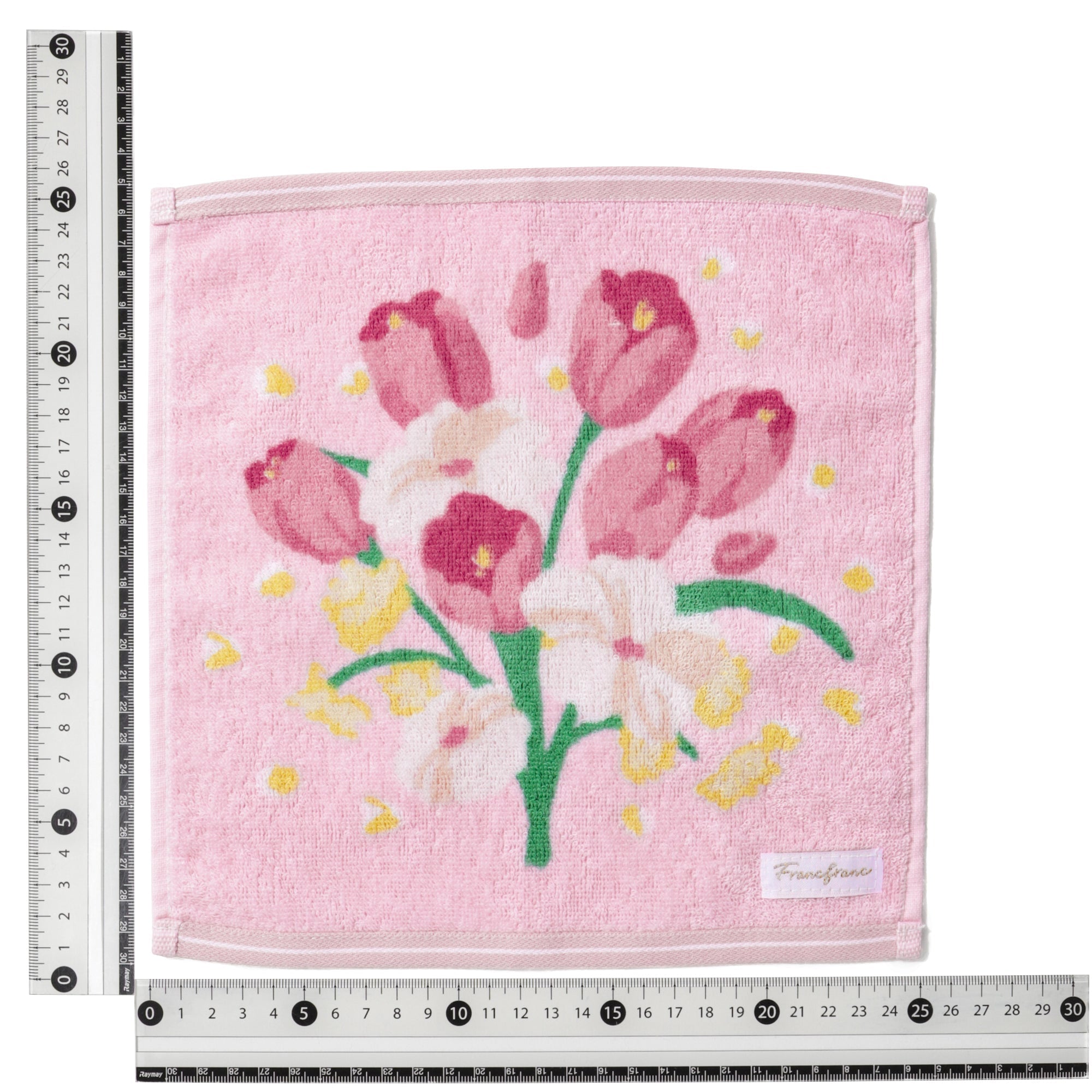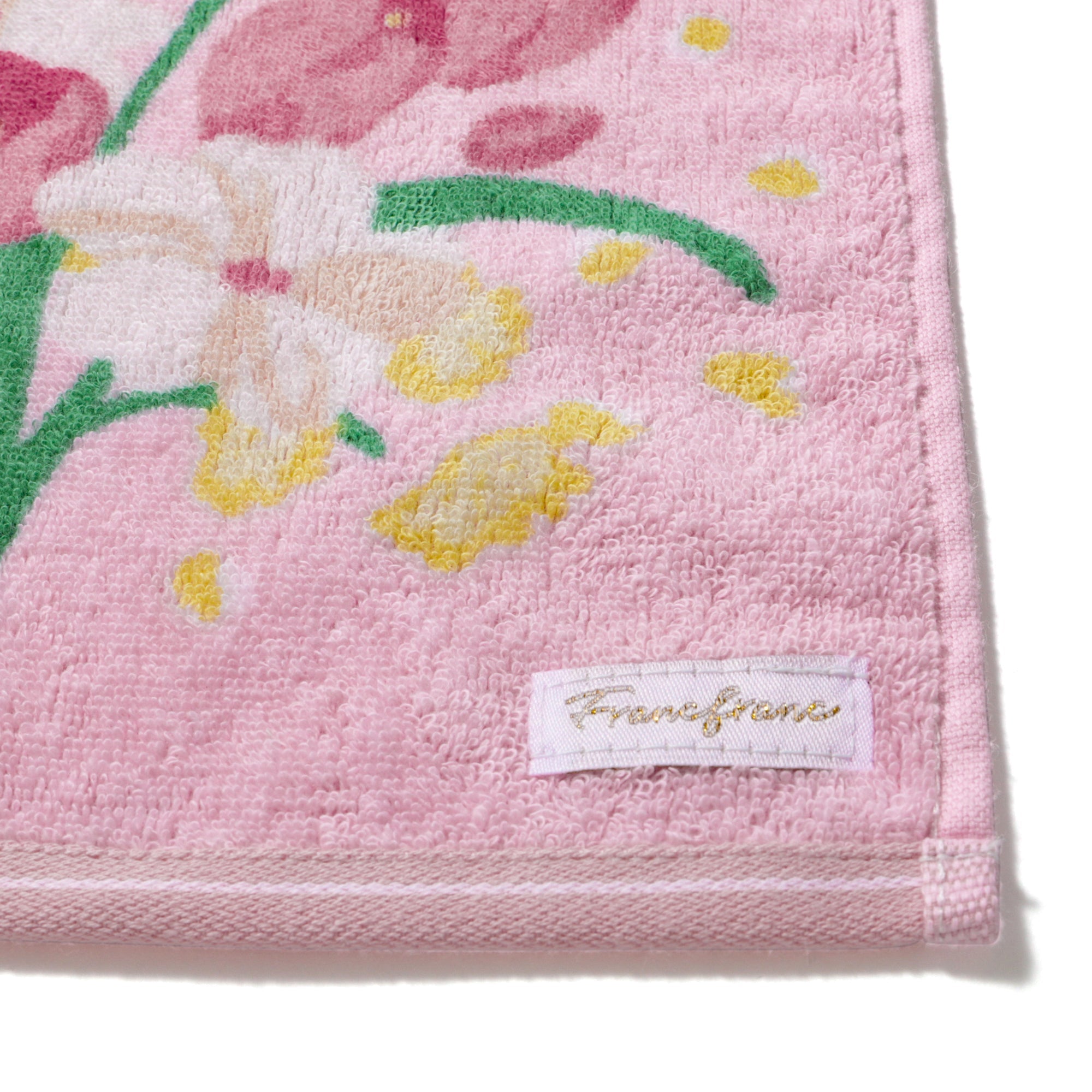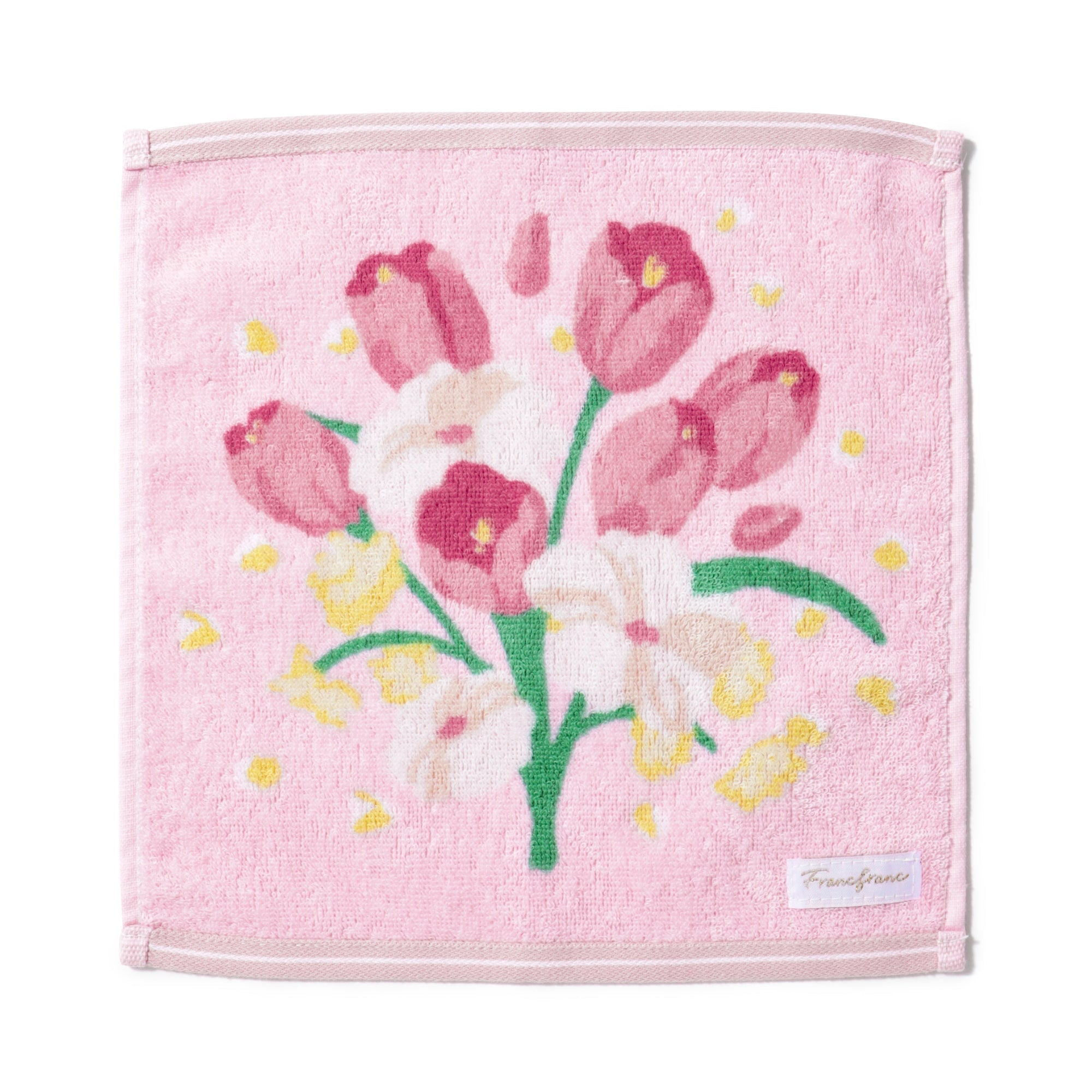 花束デザインにカラーが持つメッセージを込めたハンカチタオルです。ピンクの色言葉は「優しさ」。いつも優しいあの人への感謝をこめたプチギフトにおすすめです。抗菌防臭機能つきで衛生面も安心してご使用いただけます。