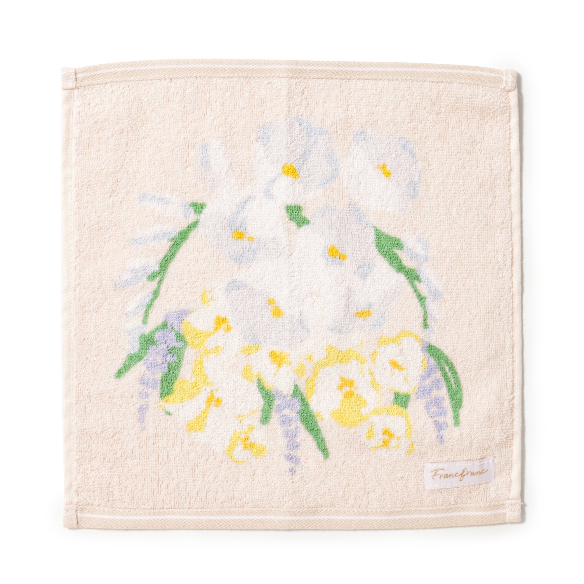 花束デザインにカラーが持つメッセージを込めたハンカチタオルです。ホワイトの色言葉は「純粋」。ピュアなあの人への感謝をこめたプチギフトにおすすめです。抗菌防臭機能つきで衛生面も安心してご使用いただけます。