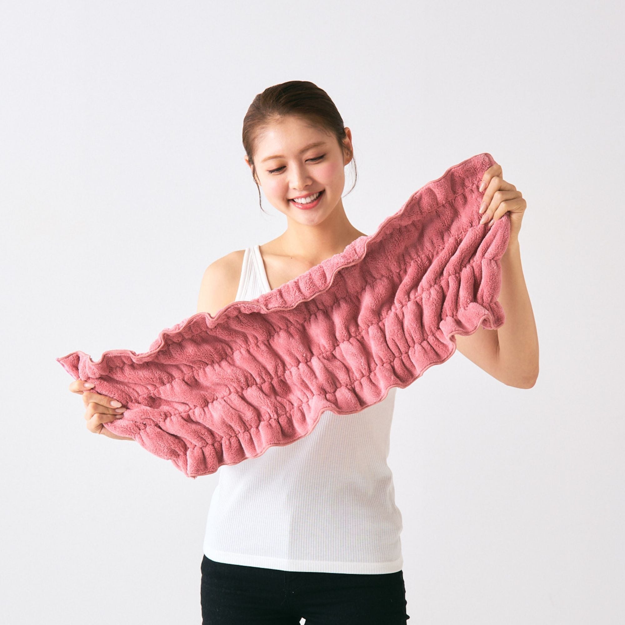 お風呂上りの髪をふんわりと包み込み、髪への摩擦を少なく過ごすことができるヘアタオルです。くしゅくしゅっと伸び縮みするので、頭に巻くだけでふんわりフィット。たっぷり吸水できる素材で、ドライヤーの時間を短くし、摩擦や熱ダメージを軽減します。