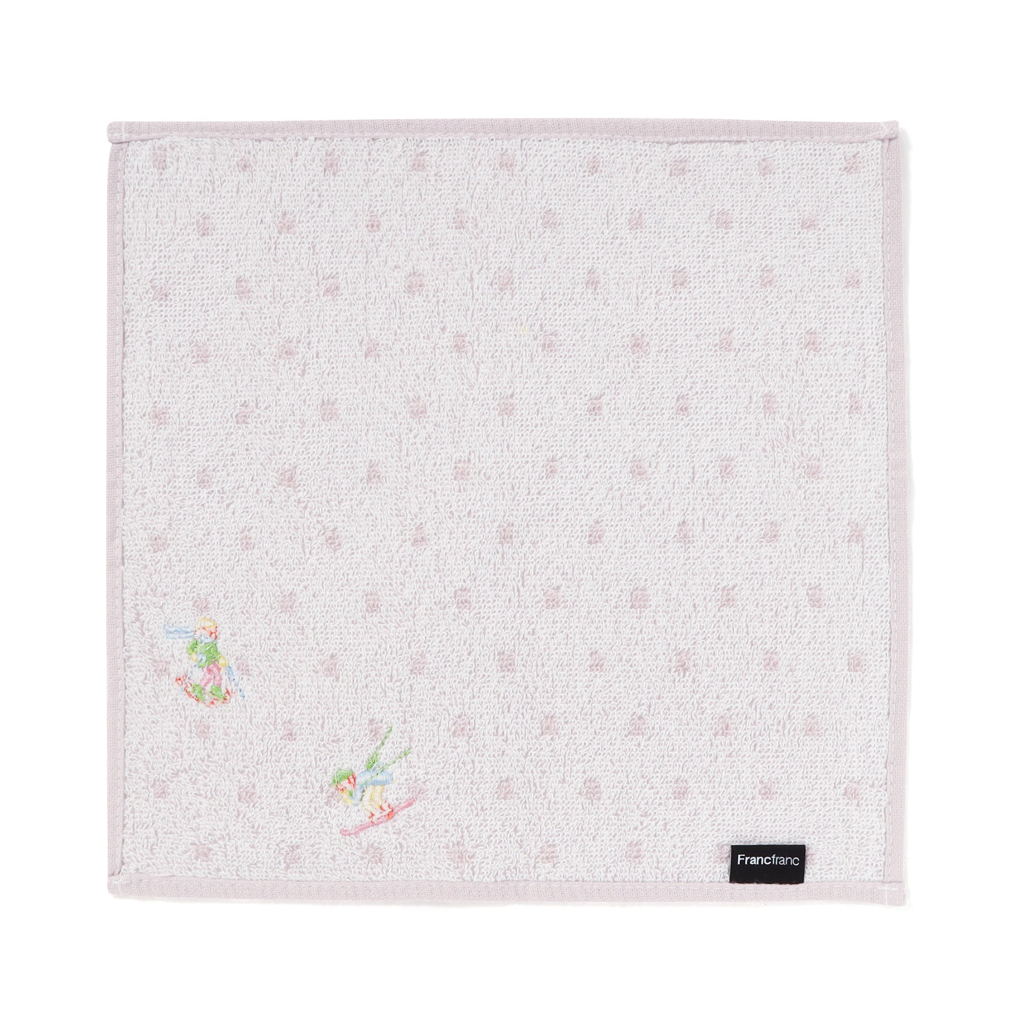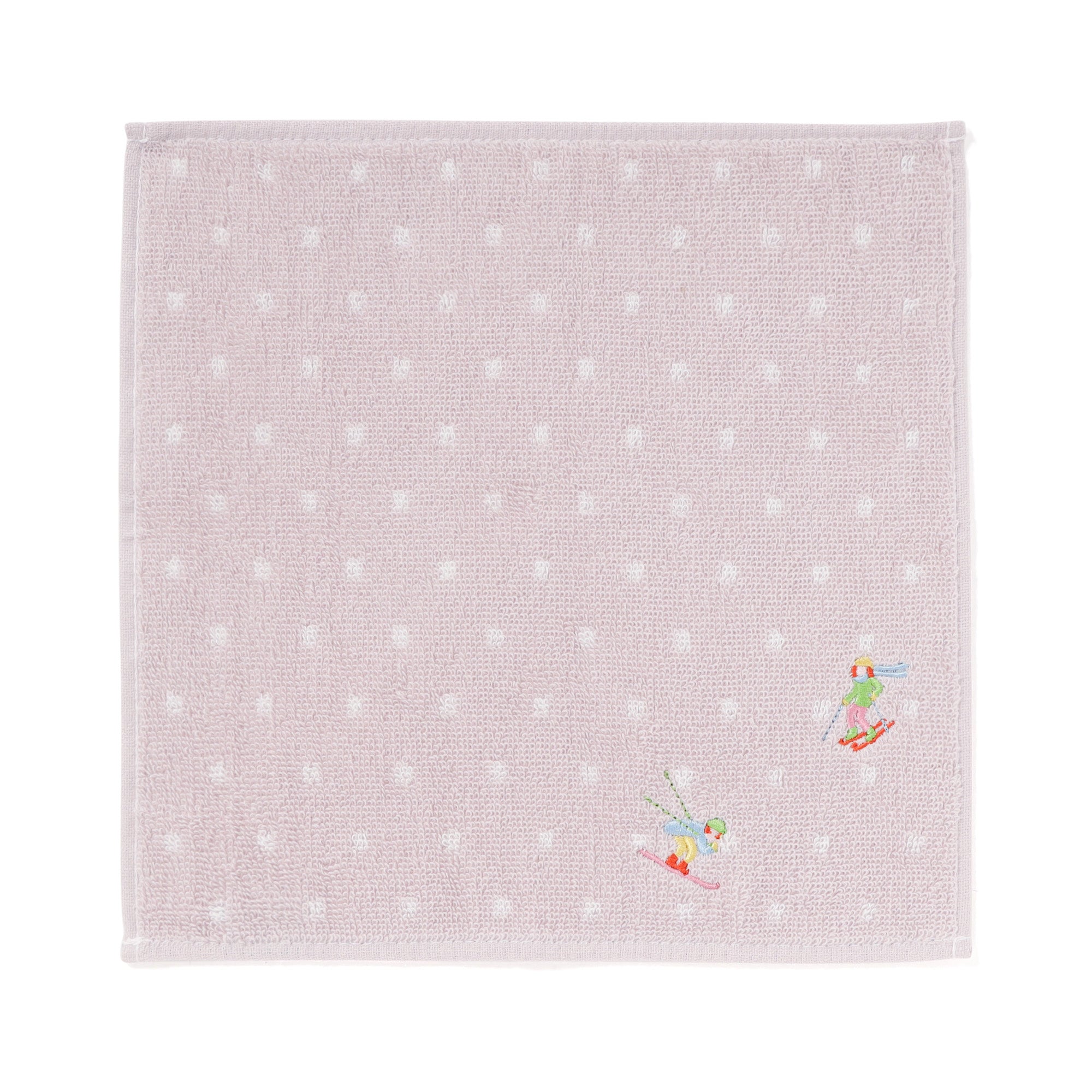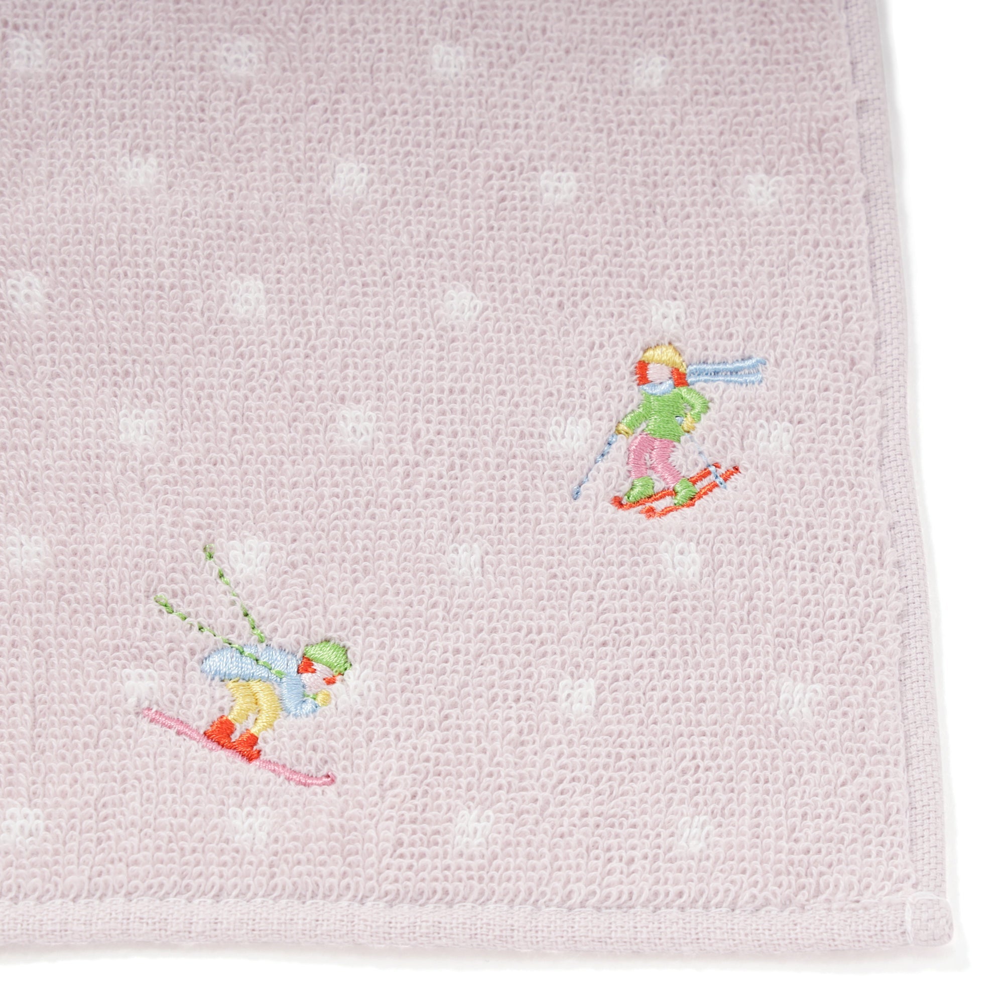 抗菌防臭機能を施したハンカチタオルです。雪が舞う背景にスキーを楽しむ人の姿を鮮やかなカラーの刺繍で表現しました。スキーを滑っている場面を切り取ったデザインで、冬の日の楽しい記憶を思い出させてくれます。