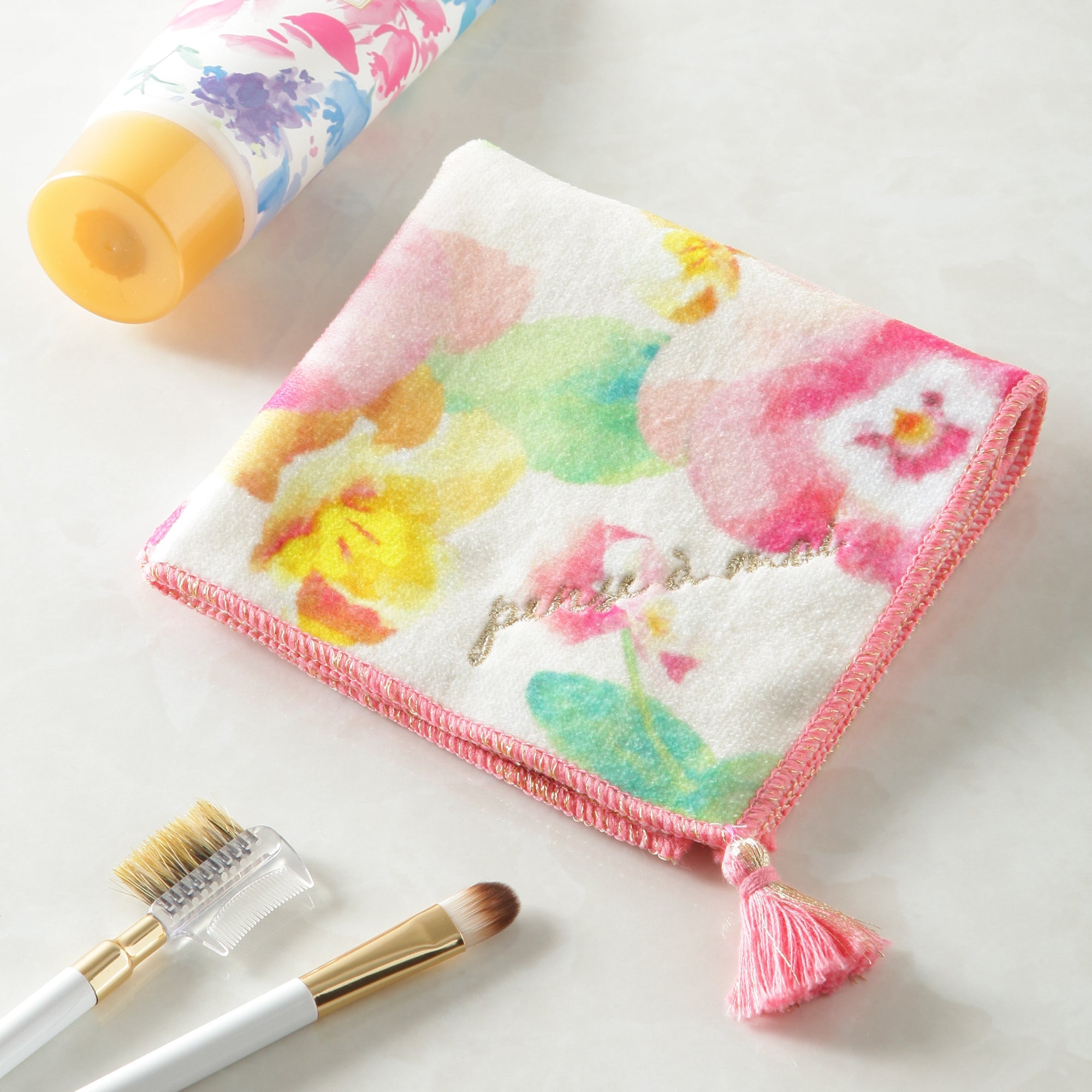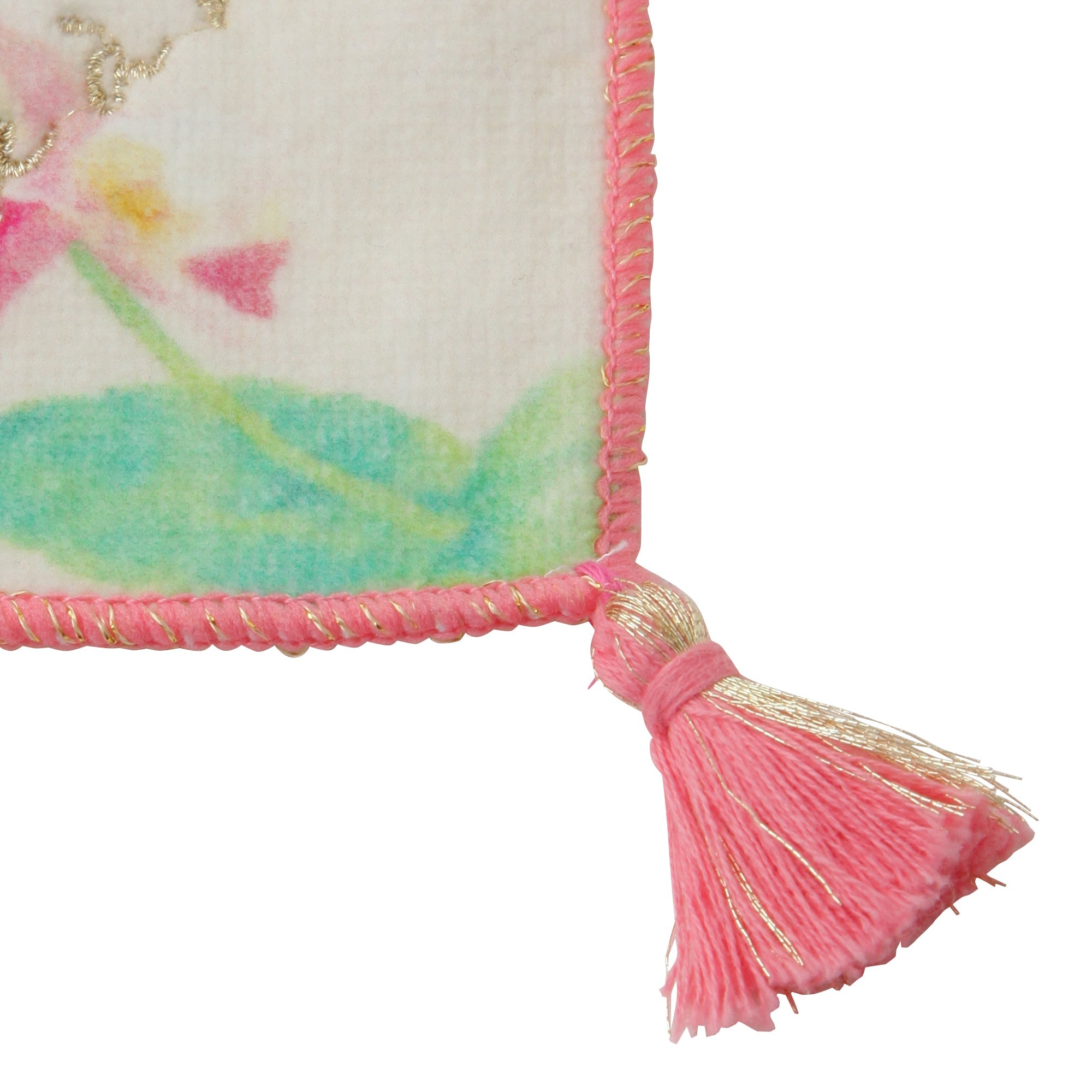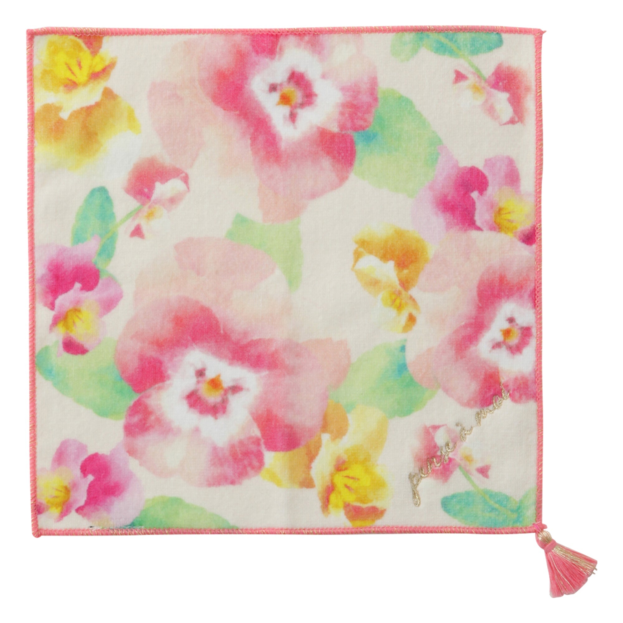 一面に花柄プリントが広がるハンカチタオルシリーズです。ゴールド糸のメローロックとタッセルでより華やかに仕上げました。パンジーの花言葉「pense a moi(私を想って)」の刺繍がさりげないポイントです。大切な方へのギフトにおすすめです。