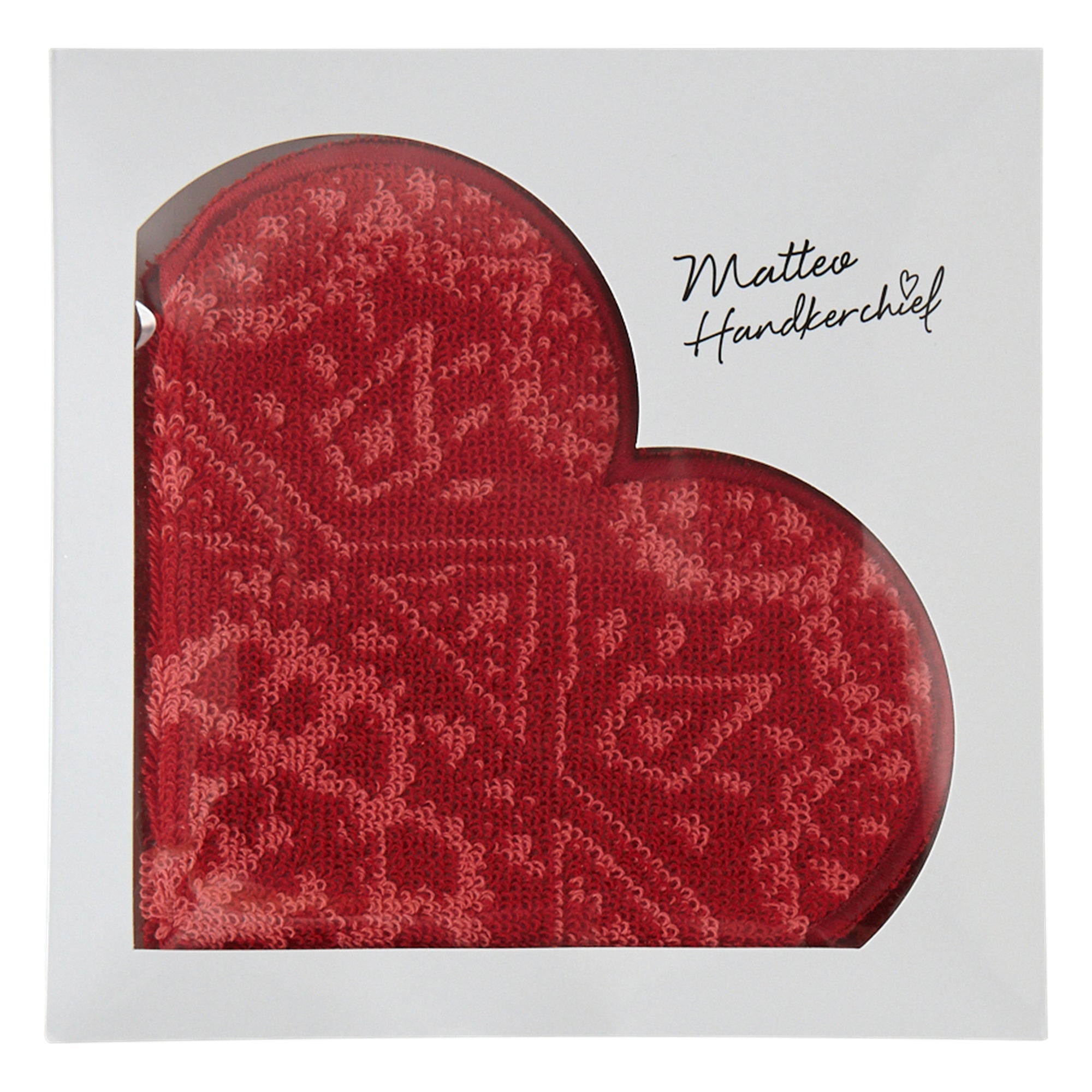 レースデザインで4つ折りにするとハートになる形状のハンカチタオルです。アイキャッチで可愛らしいダイカット型で、さらにパッケージ入りなのでギフトにおすすめです。ざっくりとしたジャガード織仕様で、厚みがありふかふかとした触り心地と吸水性にも優れています。品名の「マッテオ:MATTEO」はイタリア語で「神様の賜物」という意味。