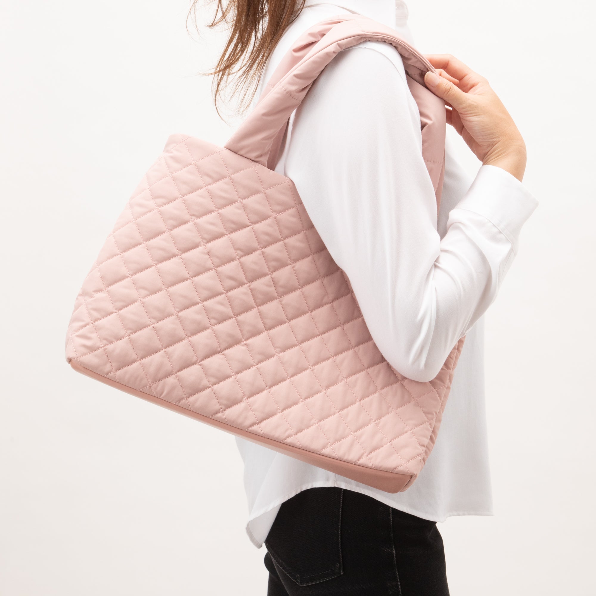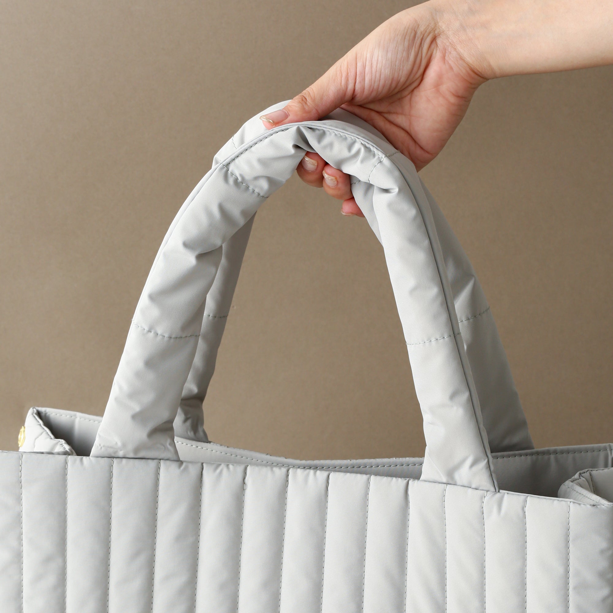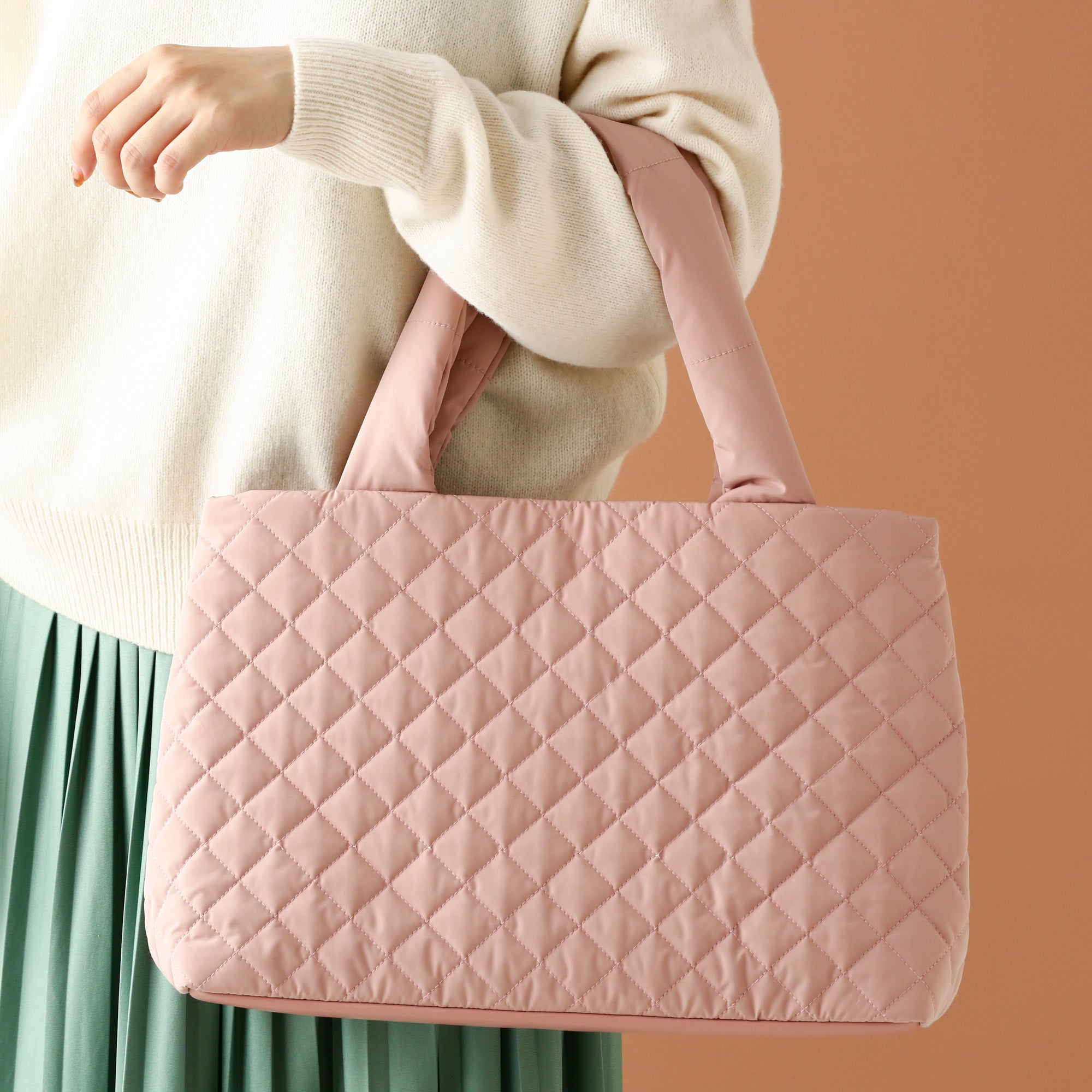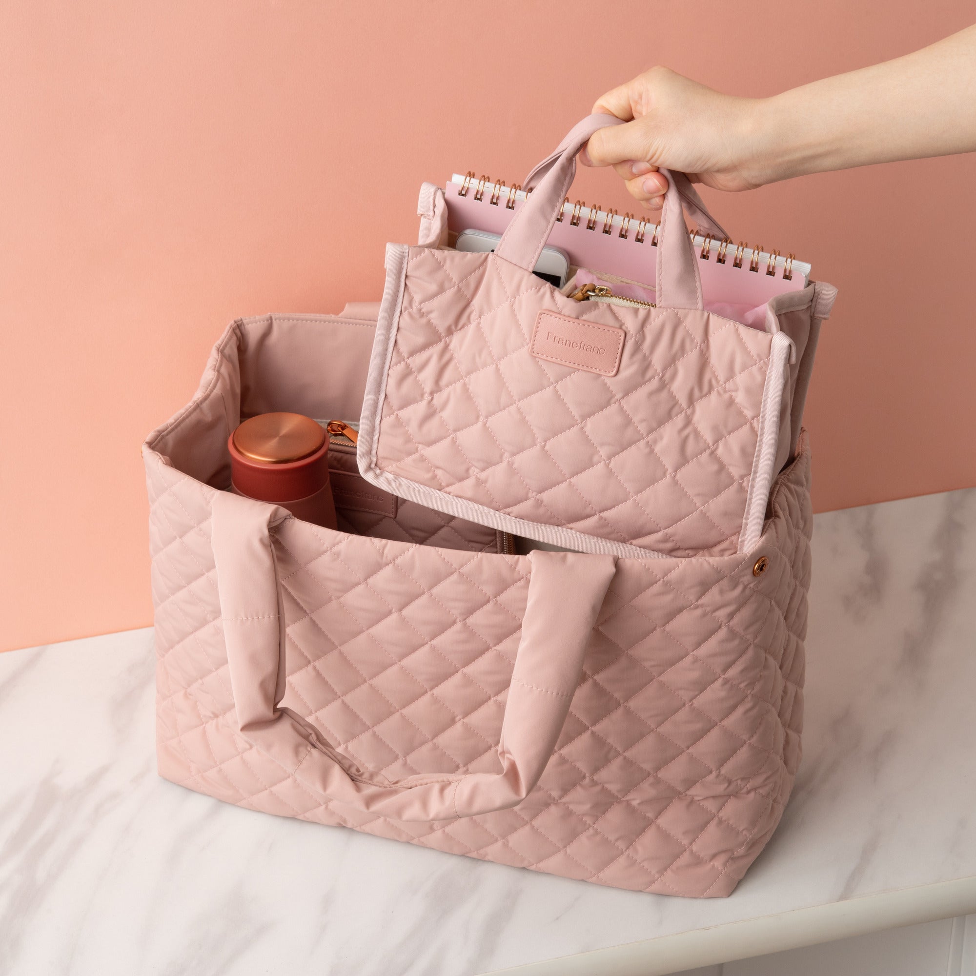 テレワーク生活に便利なツールバッグです。 そのままお部屋に置いておいてもインテリアになじむナチュラルなデザイン。綿が入ったキルティング素材が大切なアイテムをしっかり守ります。 A4ファイルが収納できるサイズ さっと出し入れできるフタなしタイプなので必要な仕事道具がすぐに取り出せます。しっかり自立するのもうれしいポイント。 内側には取り外し可能なインナーポーチ付き 仕事に必要な道具をまとめて収納できるから、オフィス勤務の日はこのままバッグインバッグとして通勤バッグに入れて持ち出してもOK。ボタンで簡単に取り外しできます。 肩掛けできる長めのハンドル 長めのハンドルで肩に掛けられるので持ち運びも楽々です。