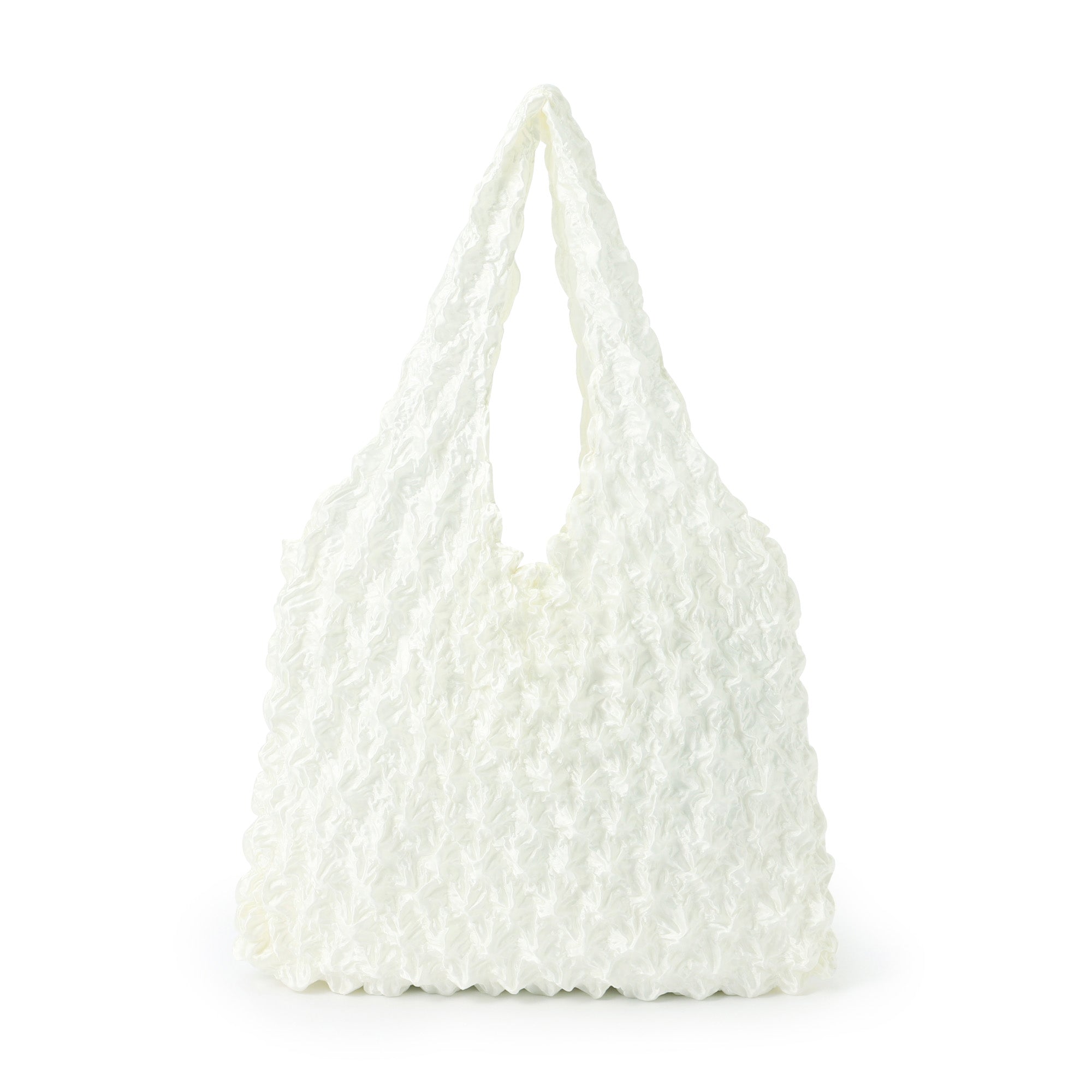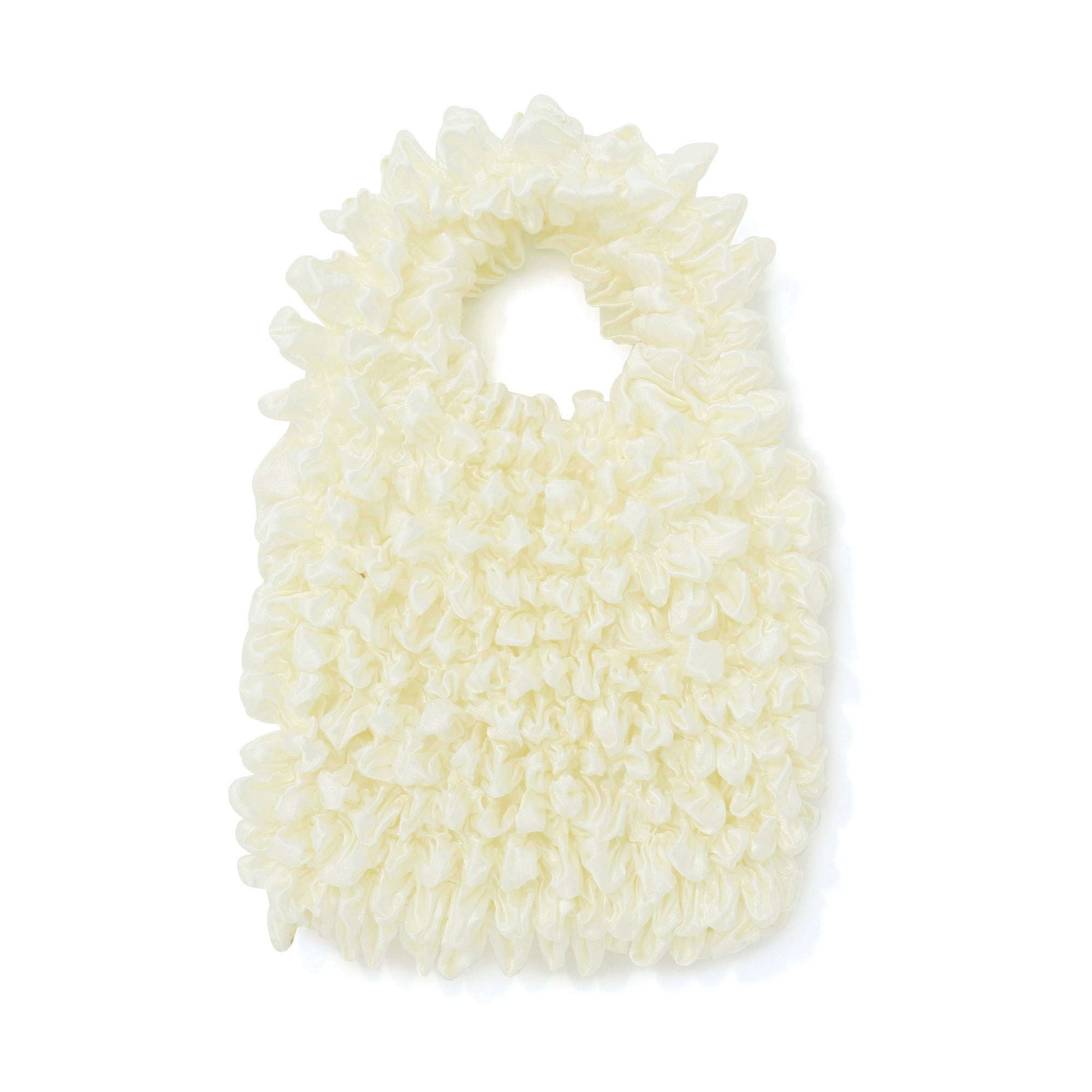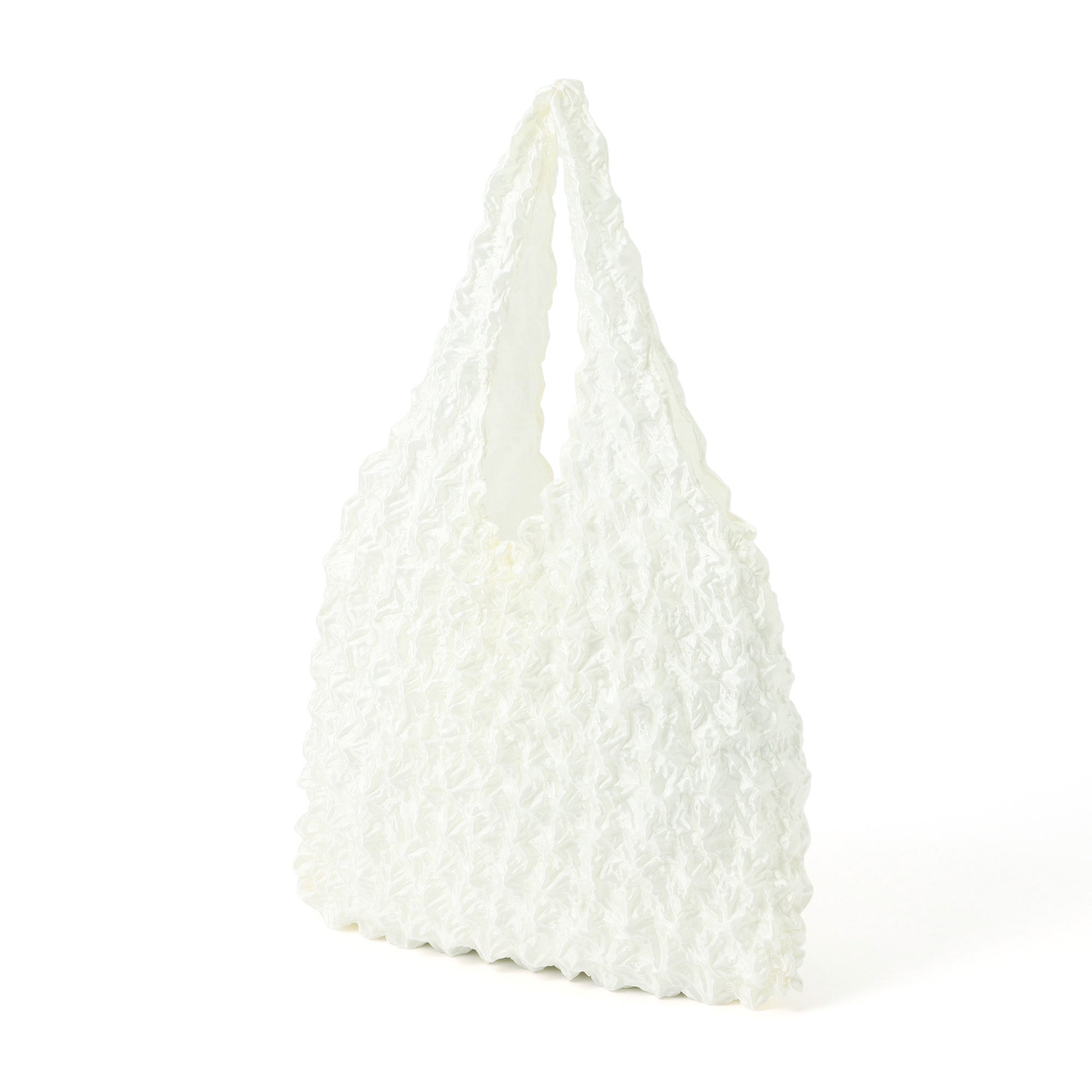 くしゅくしゅとした生地の風合いがユニークなエコバッグです。 伸縮性のある生地なので荷物を入れると生地が伸び、A4サイズ相当の大きさになります。 たたまずに小さくなるので、バッグの中に忍ばせておくのに便利です。