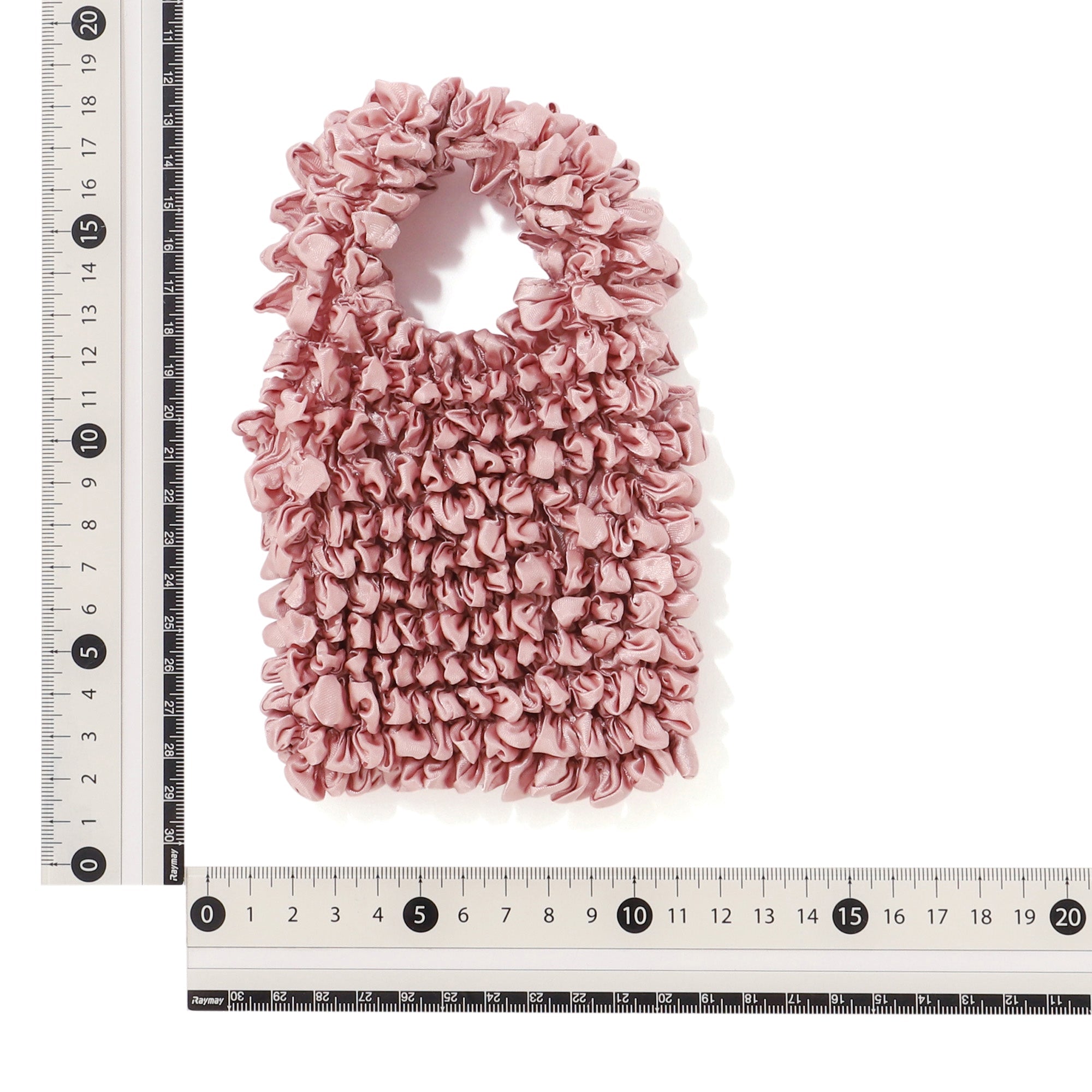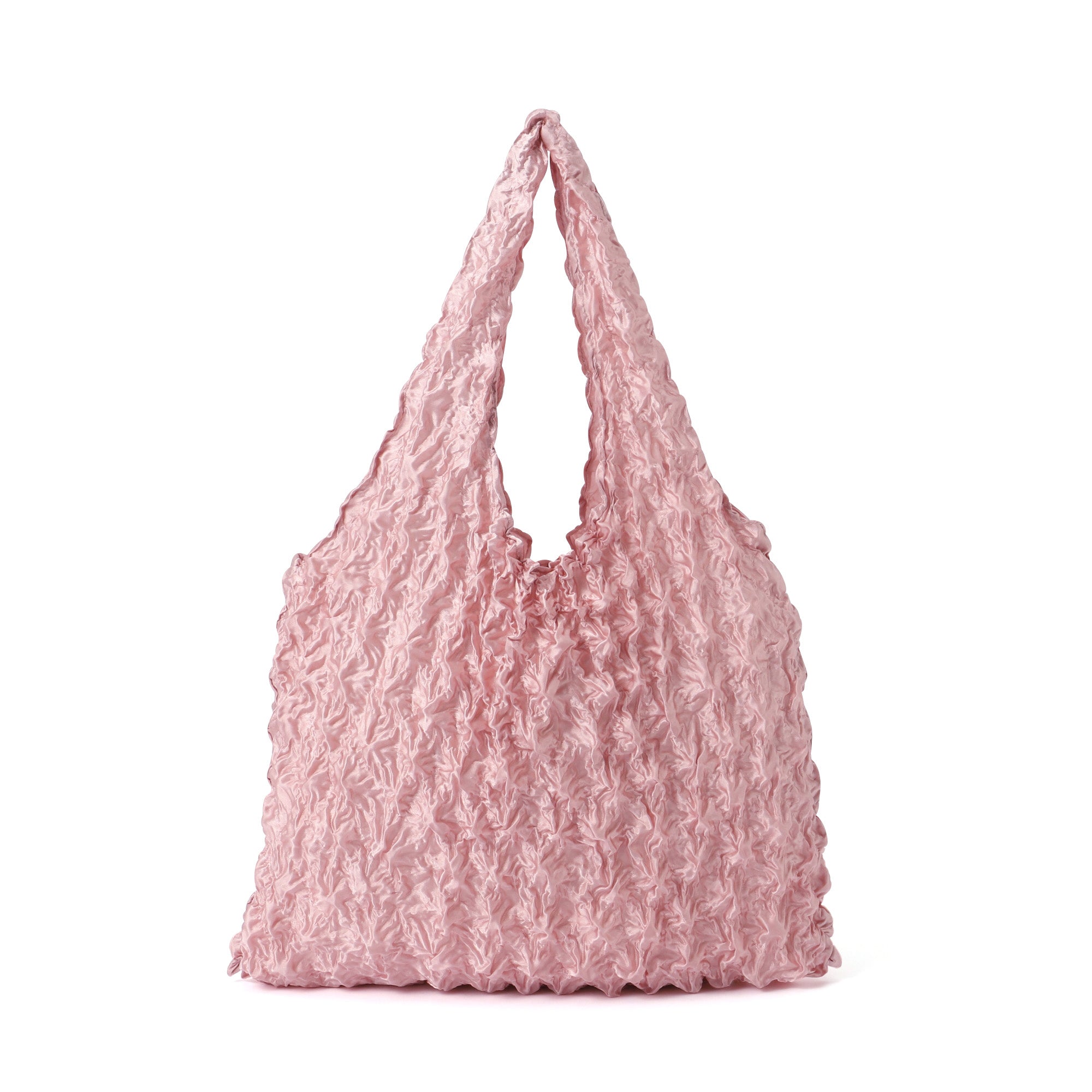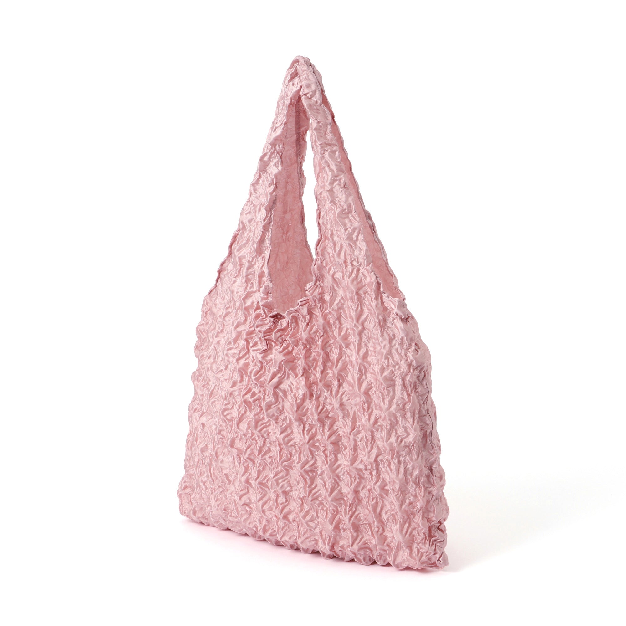 くしゅくしゅとした生地の風合いがユニークなエコバッグです。 伸縮性のある生地なので荷物を入れると生地が伸び、A4サイズ相当の大きさになります。 たたまずに小さくなるので、バッグの中に忍ばせておくのに便利です。