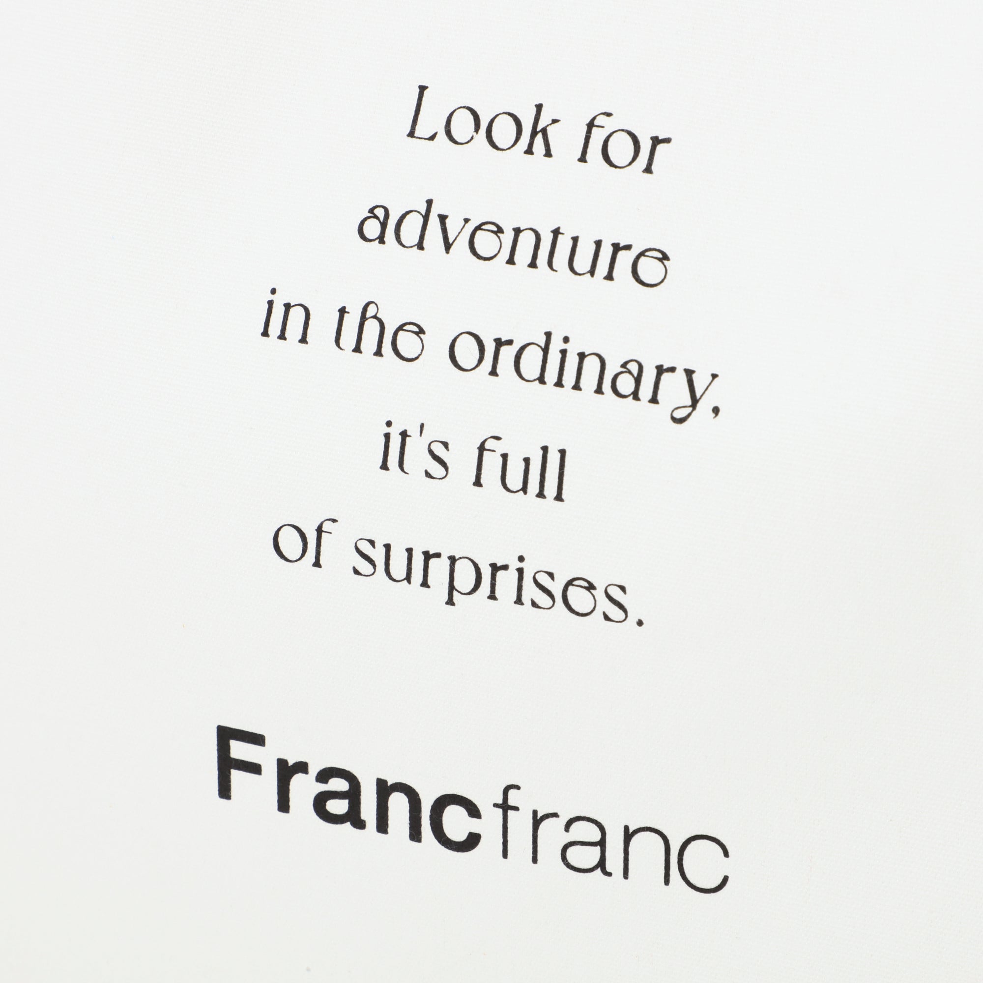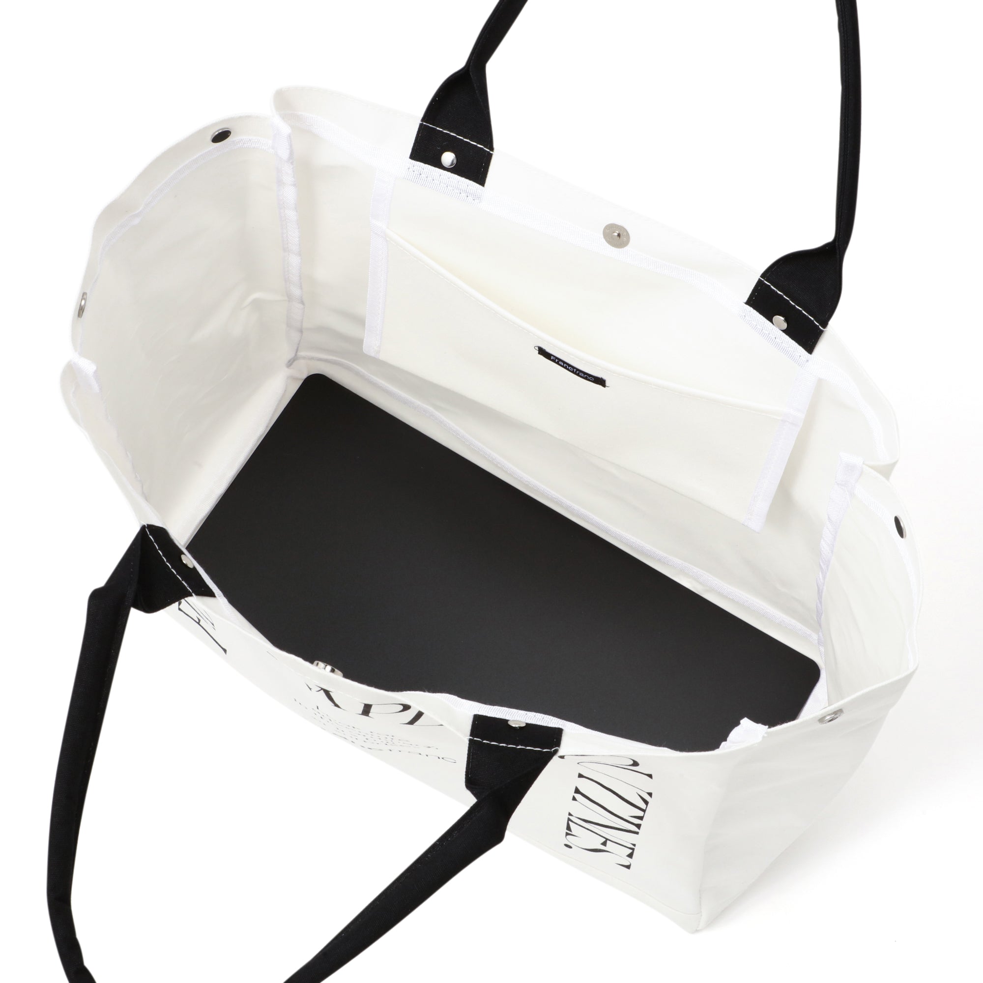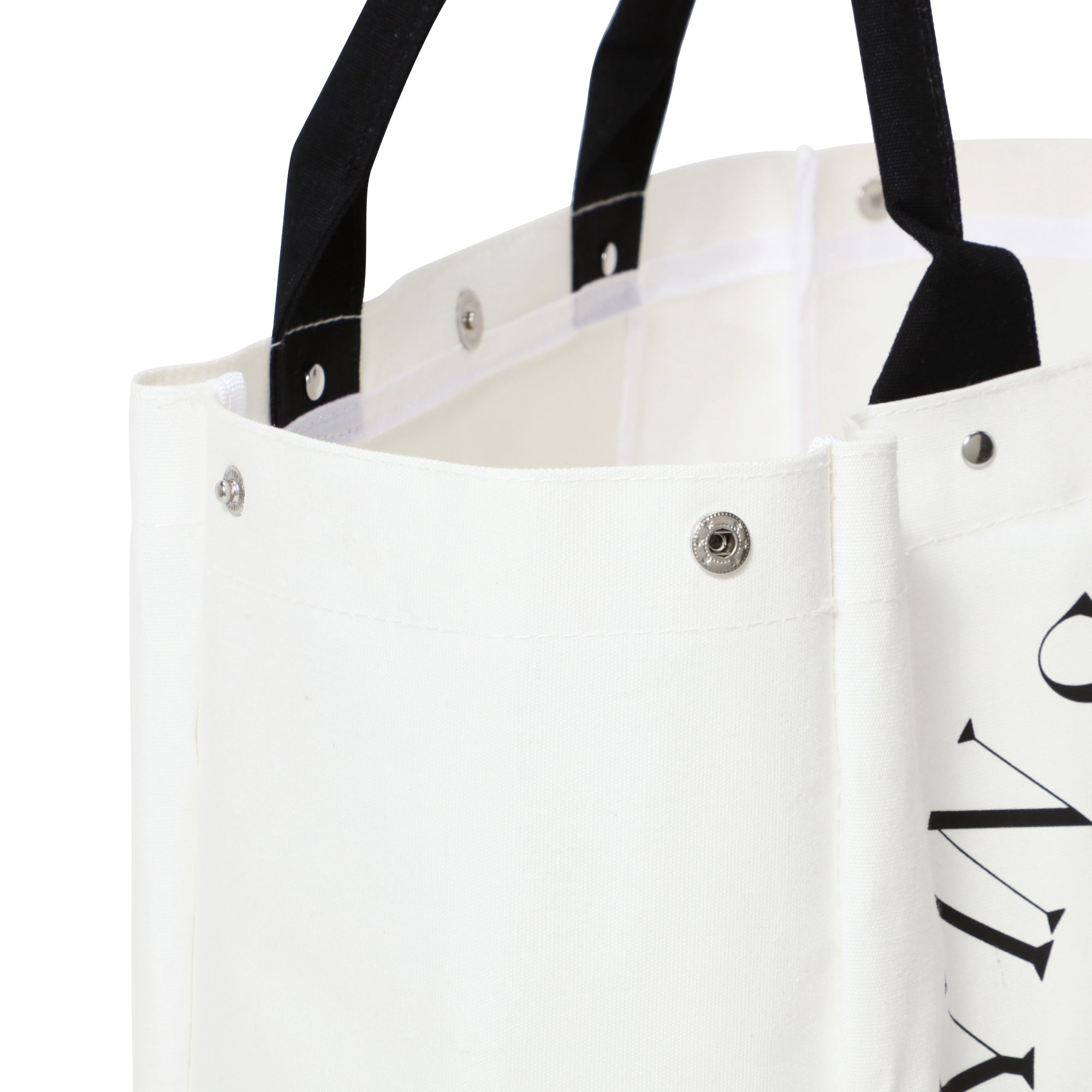 容量に合わせてマチをスナップで開け閉めできる大型のトートバッグです。トレンドを意識したタイポグラフィ柄を、モノトーンの締まりのあるデザインでプリントしました。エレガントにもナチュラルにもコーディネートしていただけます。内側にポケットが付いており、スマホや鍵など小さな物を収納するのに便利。底板付きなのでペットボトルなど重さのあるものを入れても安定感があります。生地の裏側にラミネートを施しており、バッグが自立する仕様です。