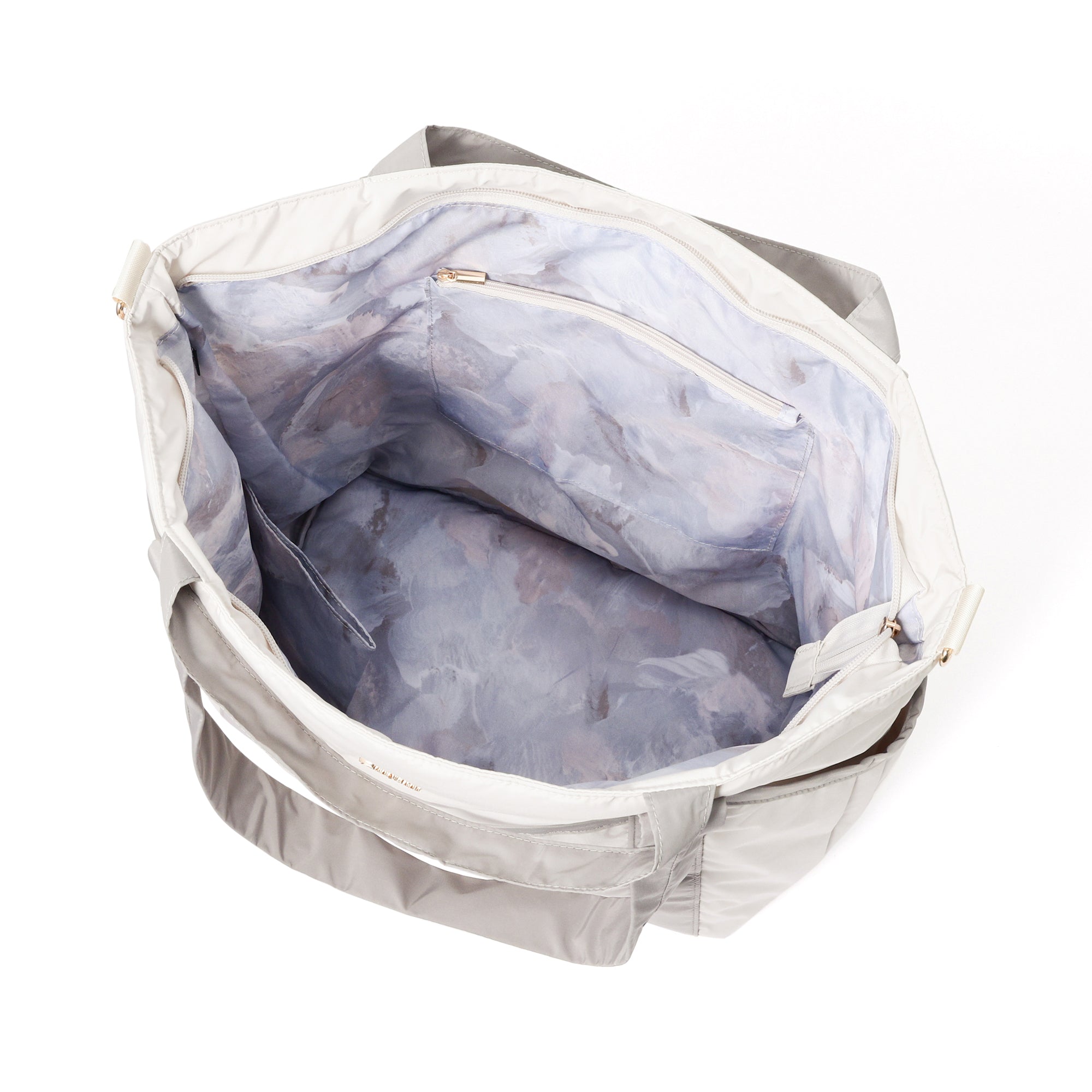 プリーツをあしらった大人かわいいトラベル用トートバッグです。荷物がたっぷり入って1泊2日程度の短期間の旅行に最適。スーツケースの取っ手に固定できるので移動に便利です。手持ちしやすい短めの持ち手と、肩にかけられる長めの持ち手、斜め掛けできるショルダーストラップの3WAYで使い勝手抜群。内側には細かいものを分けてしまえるポケットがたくさん付いています。ドリンクホルダーもあるので水筒を倒さず持ち運べます。バッグの内生地と収納用の巾着袋はモダンパレットシリーズのポーチとお揃いのペイント柄で、細部までこだわりが詰まった本命バッグです。