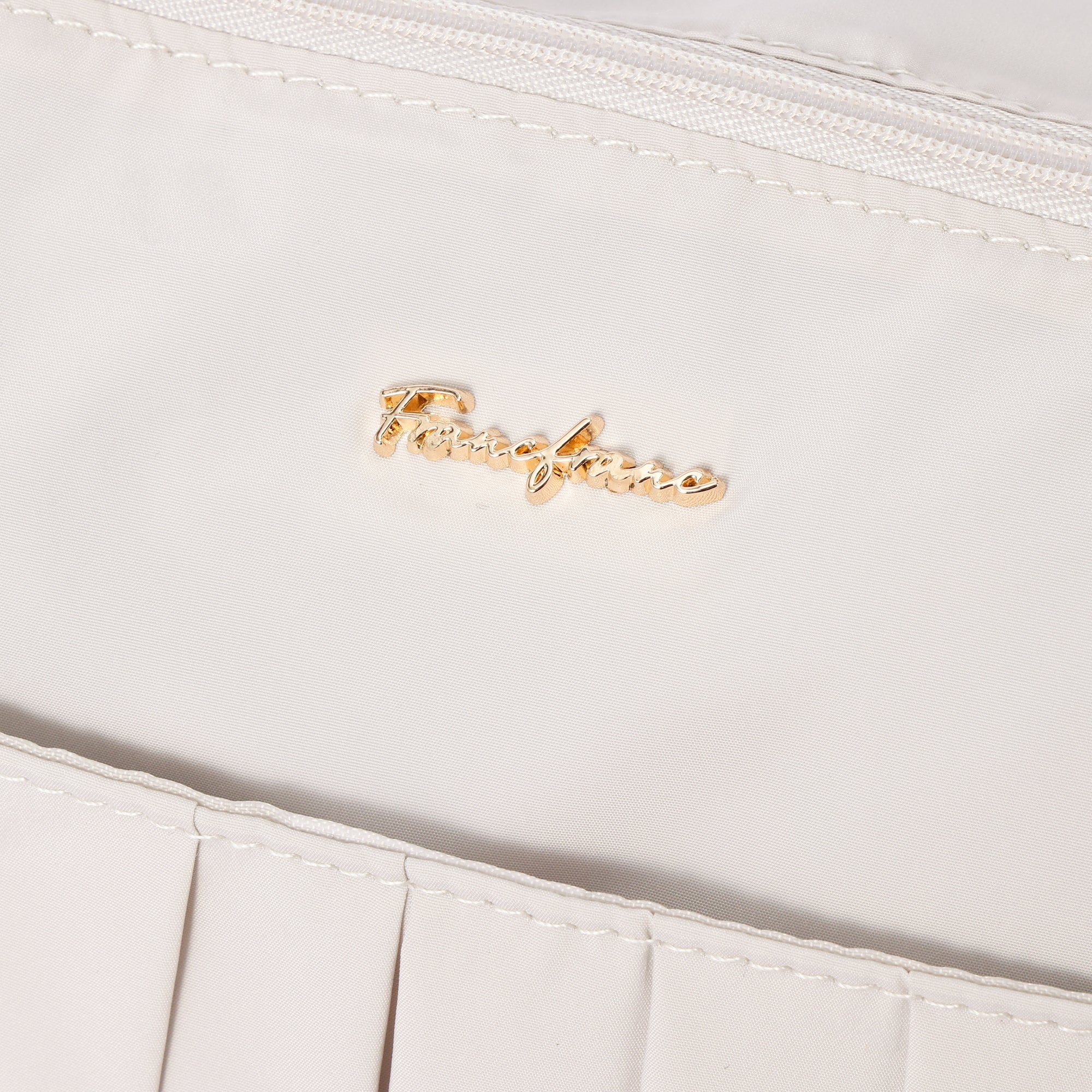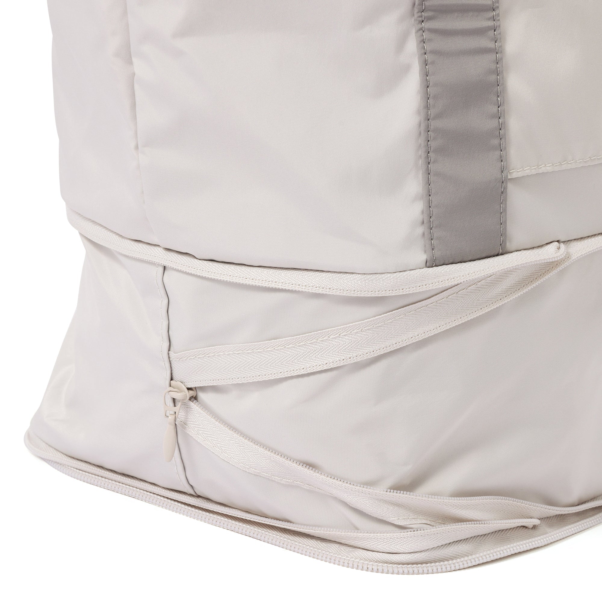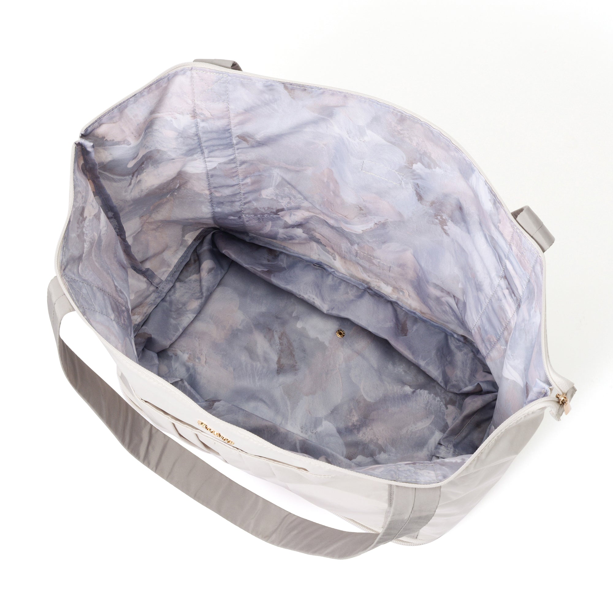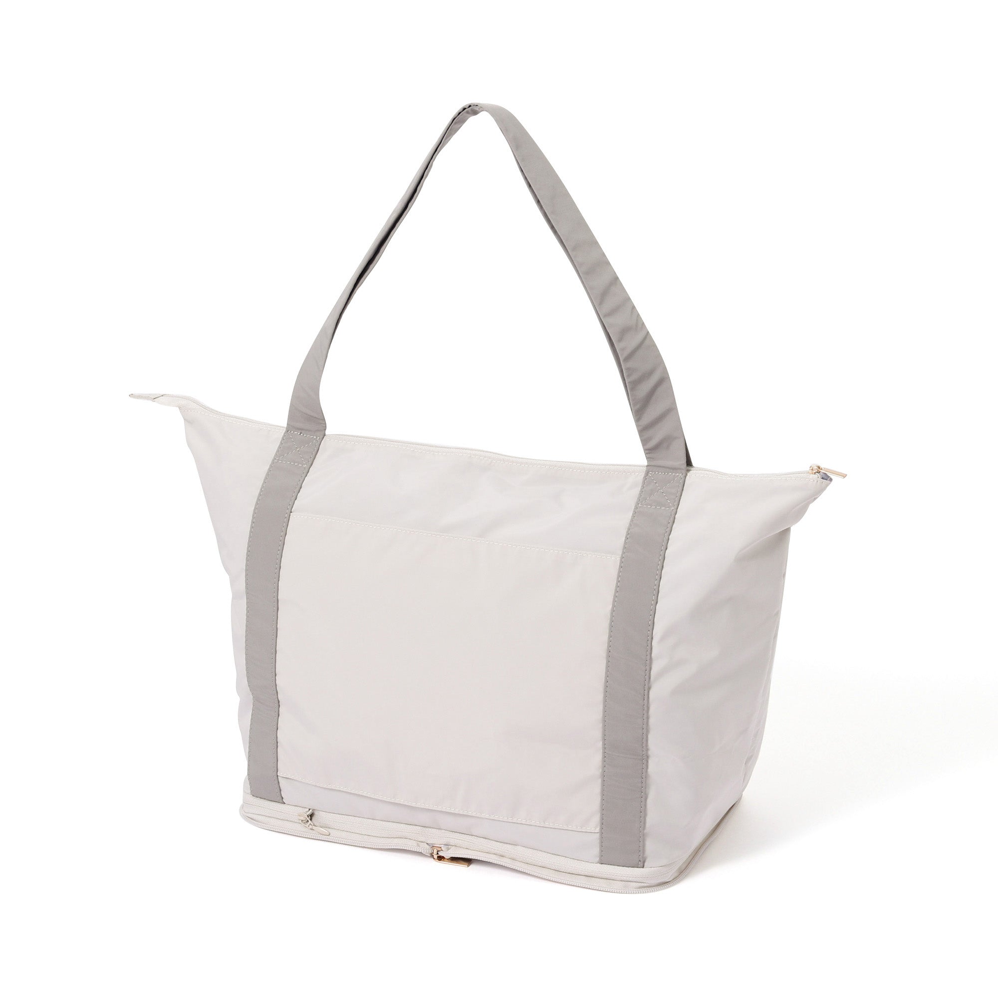 キャリーケースの持ち手にぴったりはまる、ポケット付きのキャリーオントートバッグです。使わない時はコンパクトに折りたためるので、キャリーケースに忍ばせておけば荷物が増えた際に活躍してくれます。底部分のファスナーを開くとさらに容量が増え、旅先でついついお土産を買いすぎてしまった時にも便利です。プリーツをあしらって大人かわいく仕上げました。