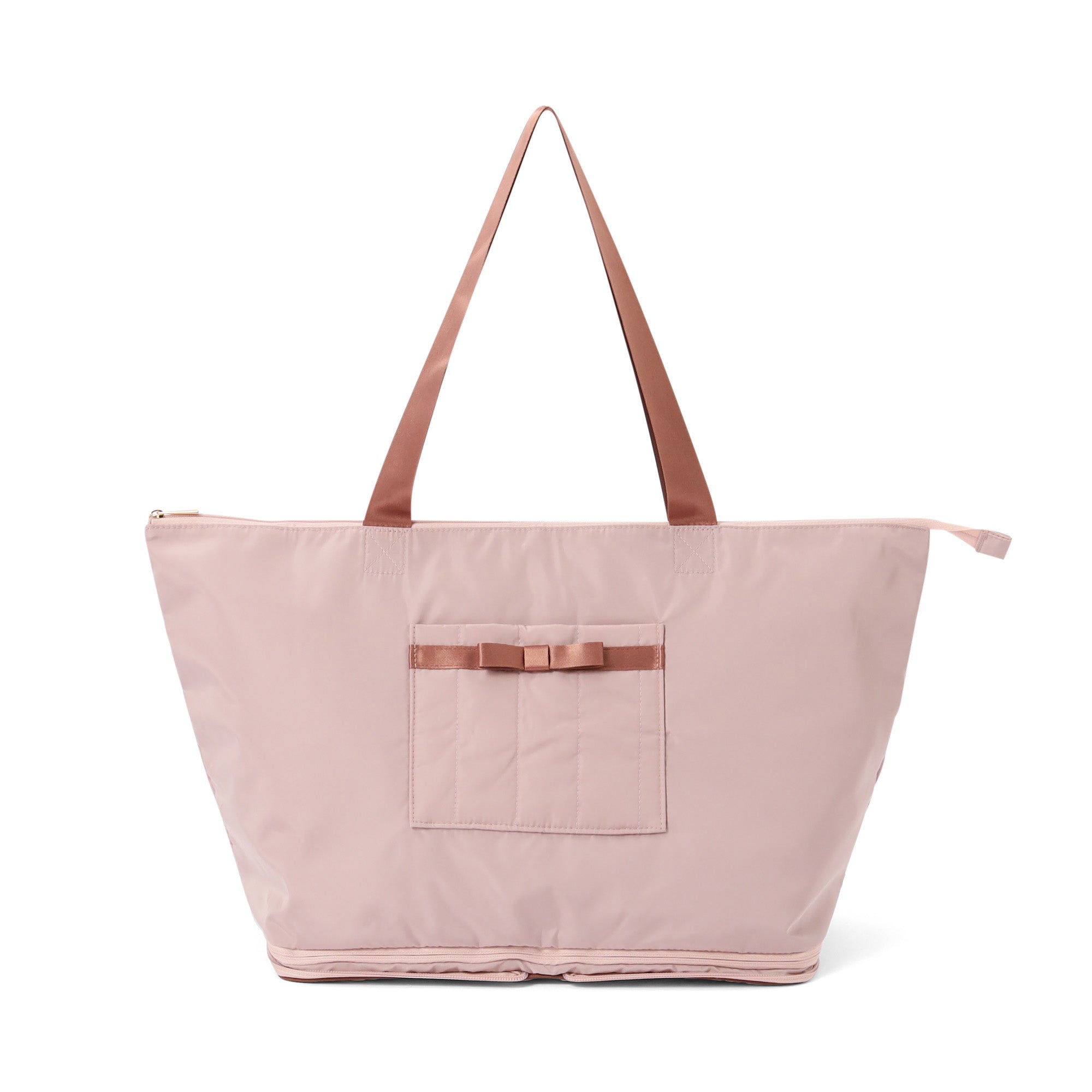 キャリーケースの持ち手にぴったりはまる、ポケット付きのキャリーオントートバッグです。使わない時はコンパクトに折りたためるので、キャリーケースに忍ばせておけば荷物が増えた際に活躍してくれます。底部分のファスナーを開くとさらに容量が増え、旅先でついついお土産を買いすぎてしまった時にも便利です。バイカラーの配色とリボンのアクセントでスイートな印象に仕上げました。