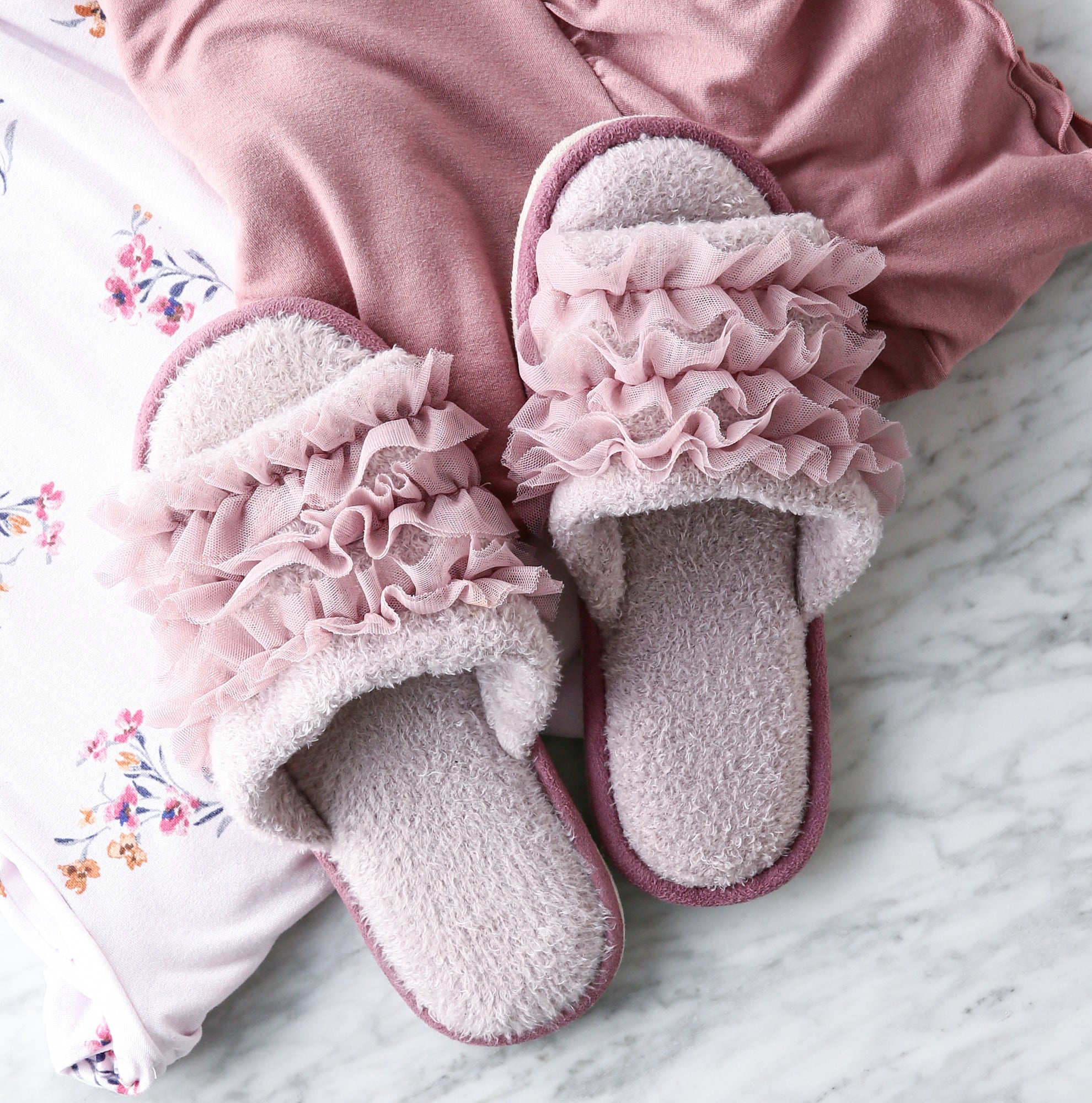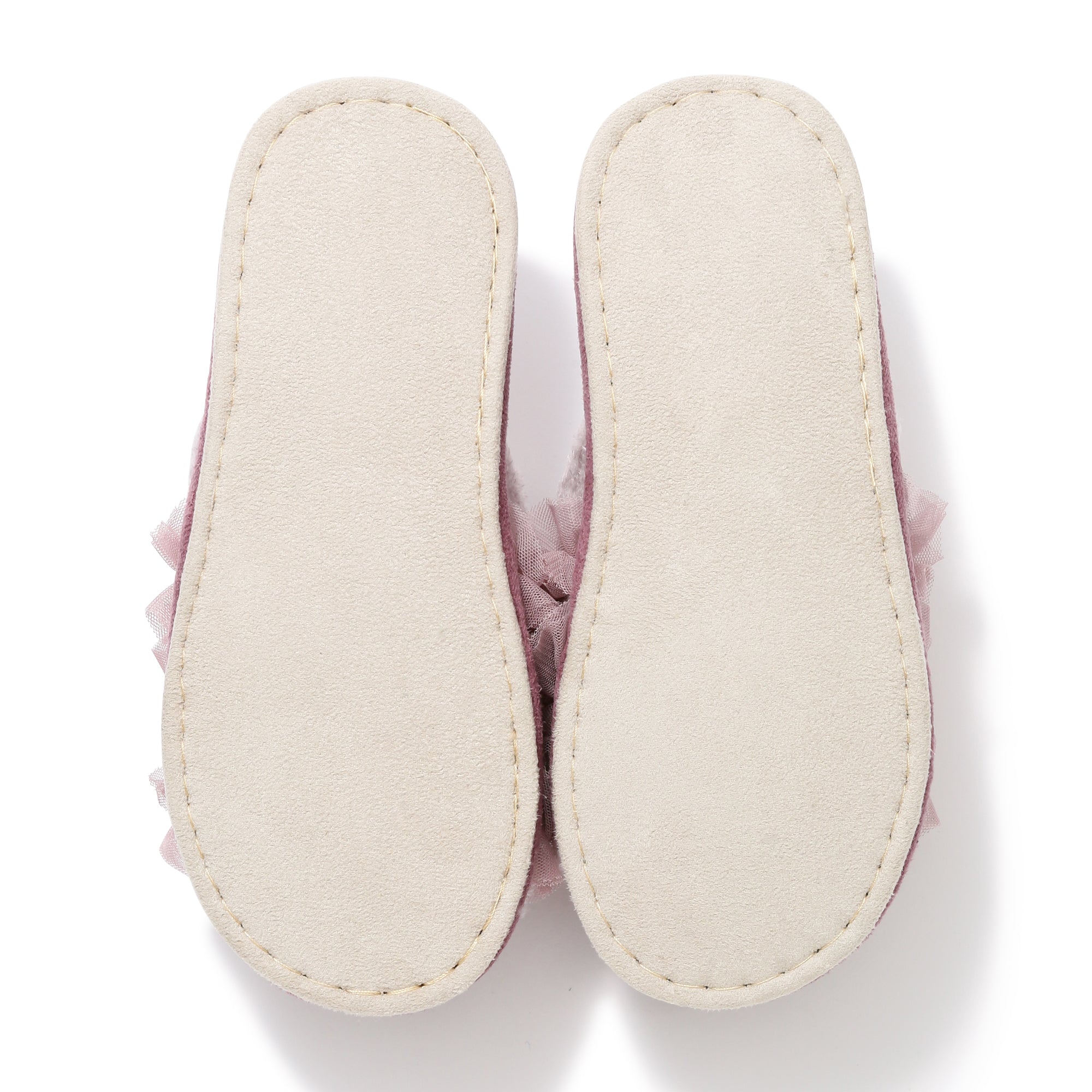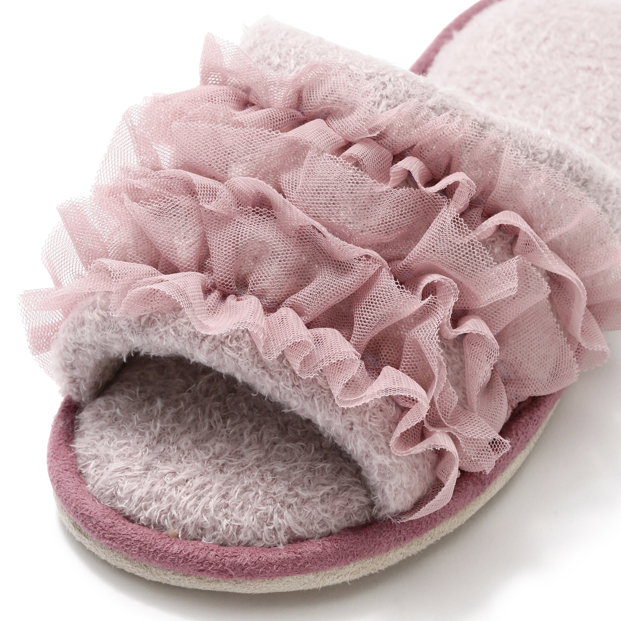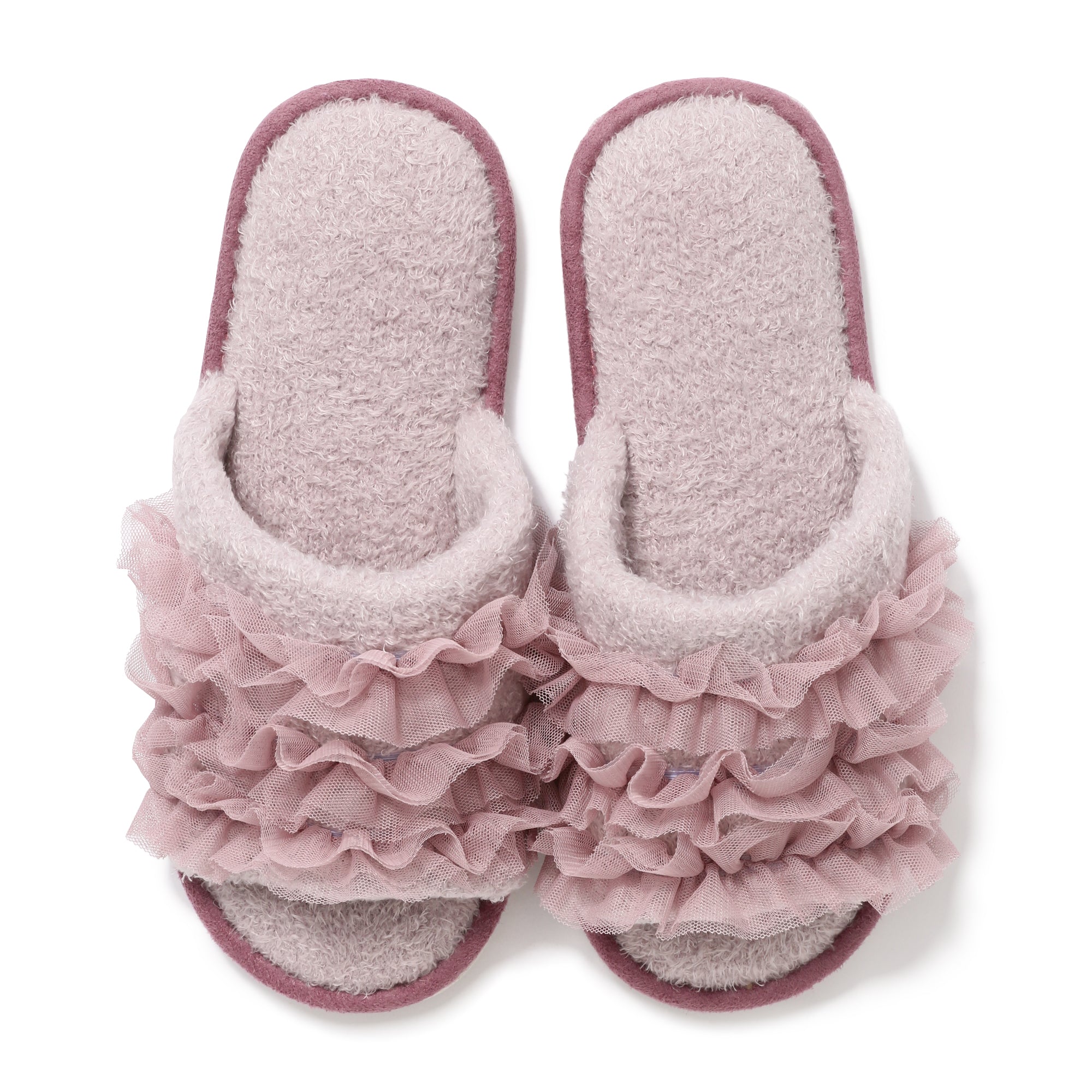 チュールのフリルが可愛らしいデザインのルームシューズです。 ナイロンニット生地でリラックスできる履き心地です。 前開きタイプのため通気性もよく、足にフィットします。 お部屋でのオフタイムもゆったり過ごせます。