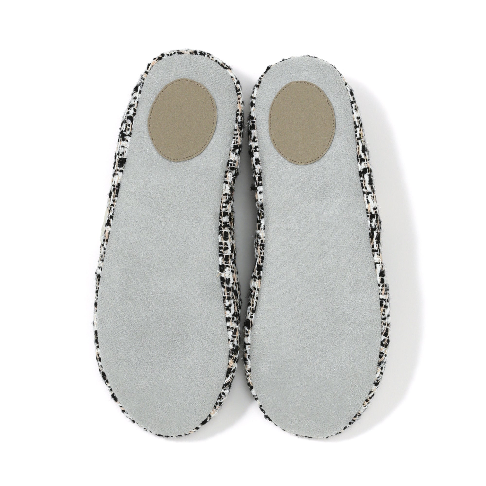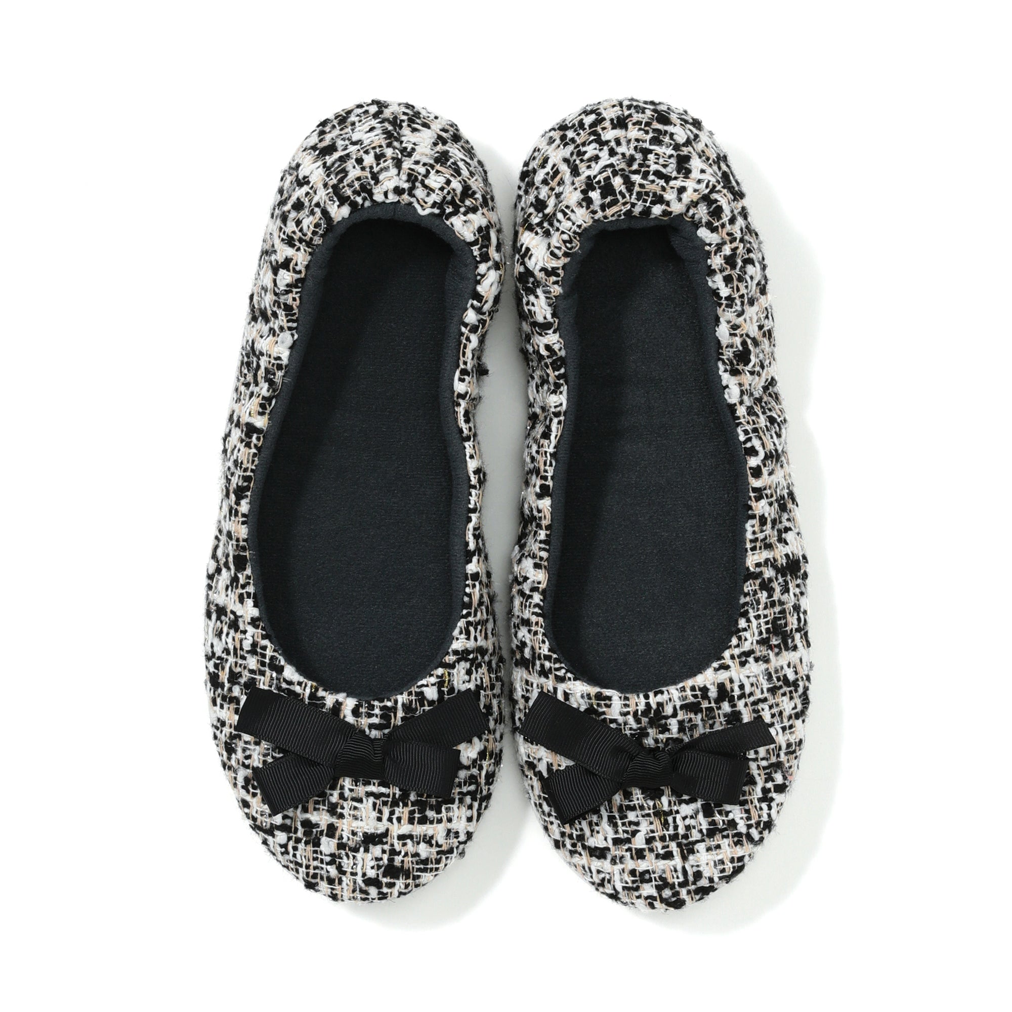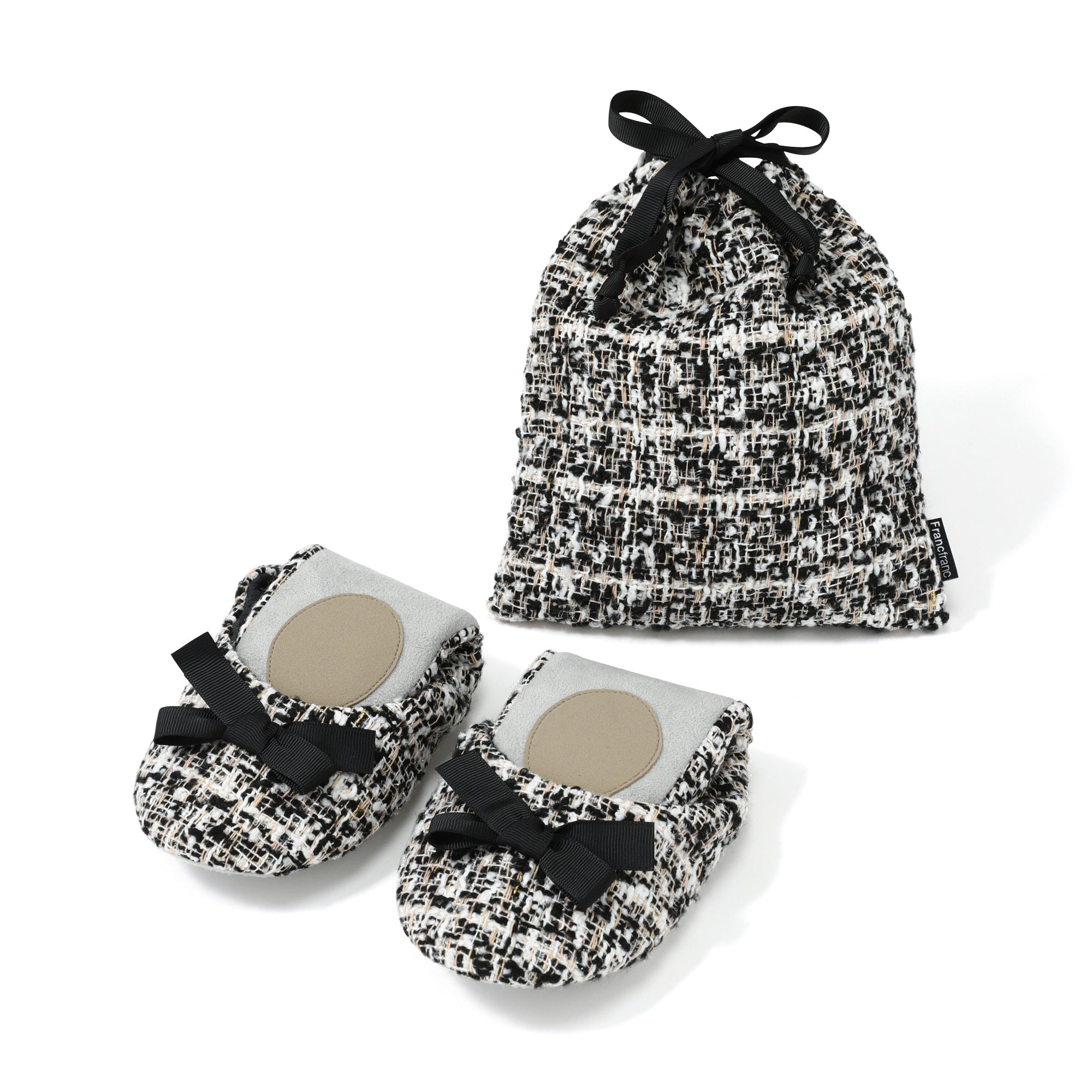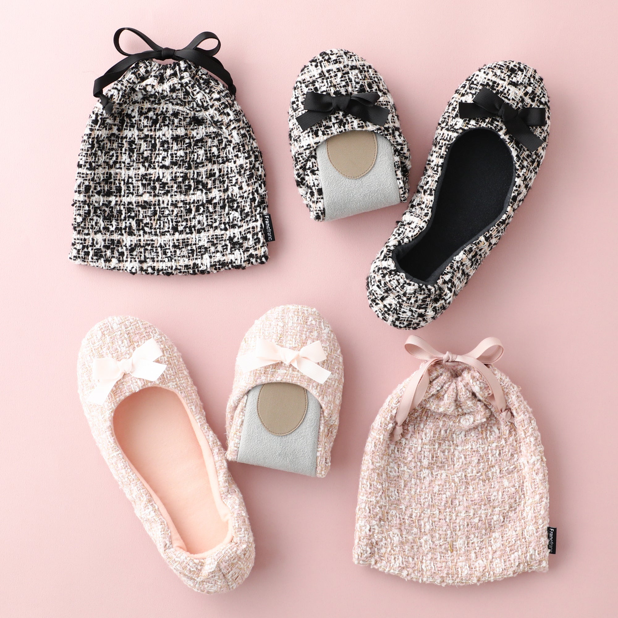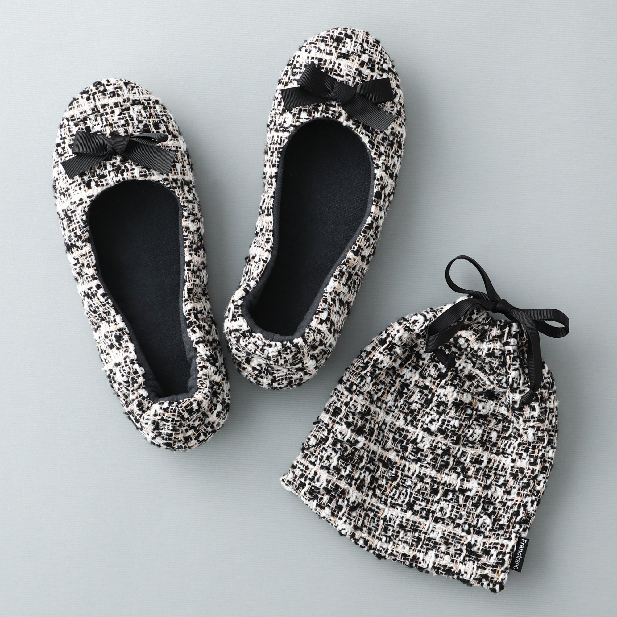 トレンドのツイード生地がおしゃれなポケッタブルルームシューズです。 付属のポーチにコンパクトに収納出来るので、荷物がかさばることなく持ち運びに便利です。 付けやすく、フラットなシューズなので長時間の移動の際におすすめです。