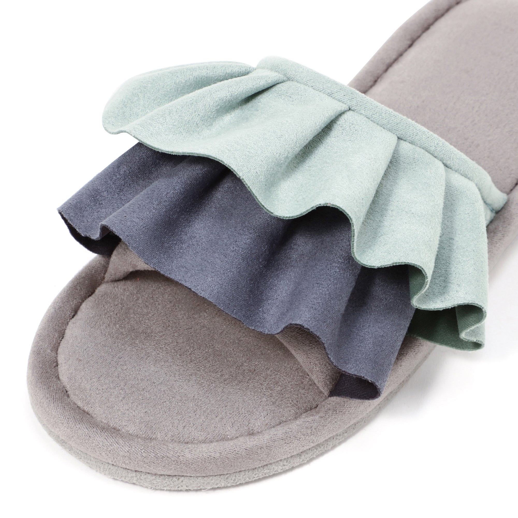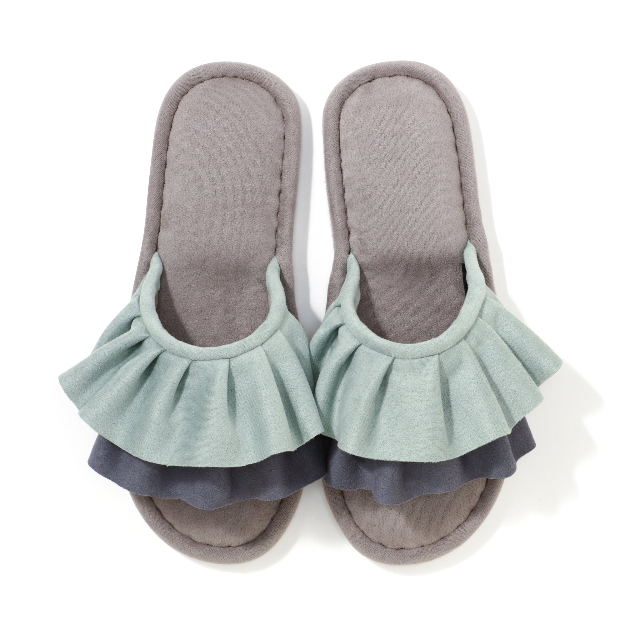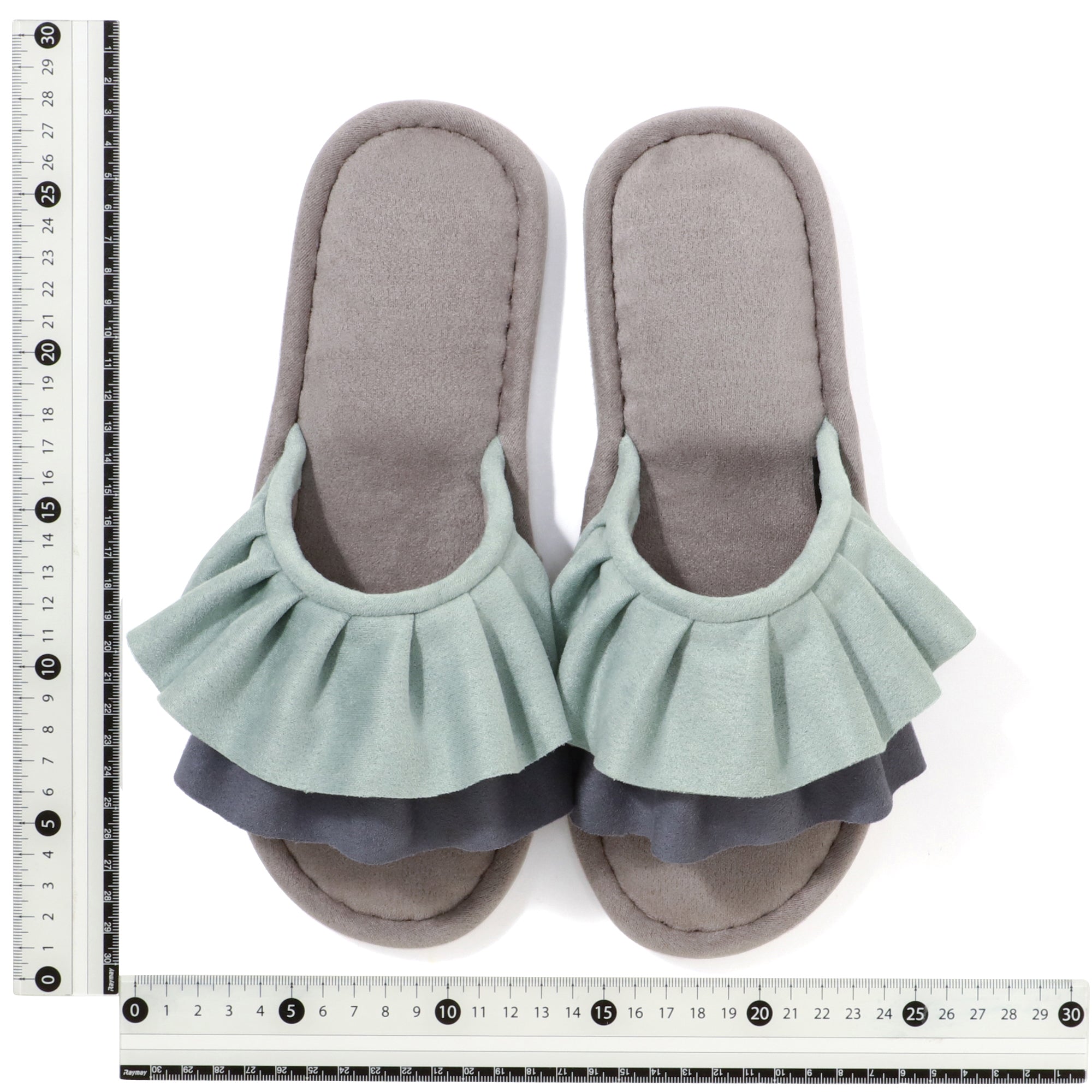 2枚のフリルで甲を覆ったデザインのルームシューズです。 フリルだけど甘すぎず、大人可愛い印象です。 オープントウタイプ。