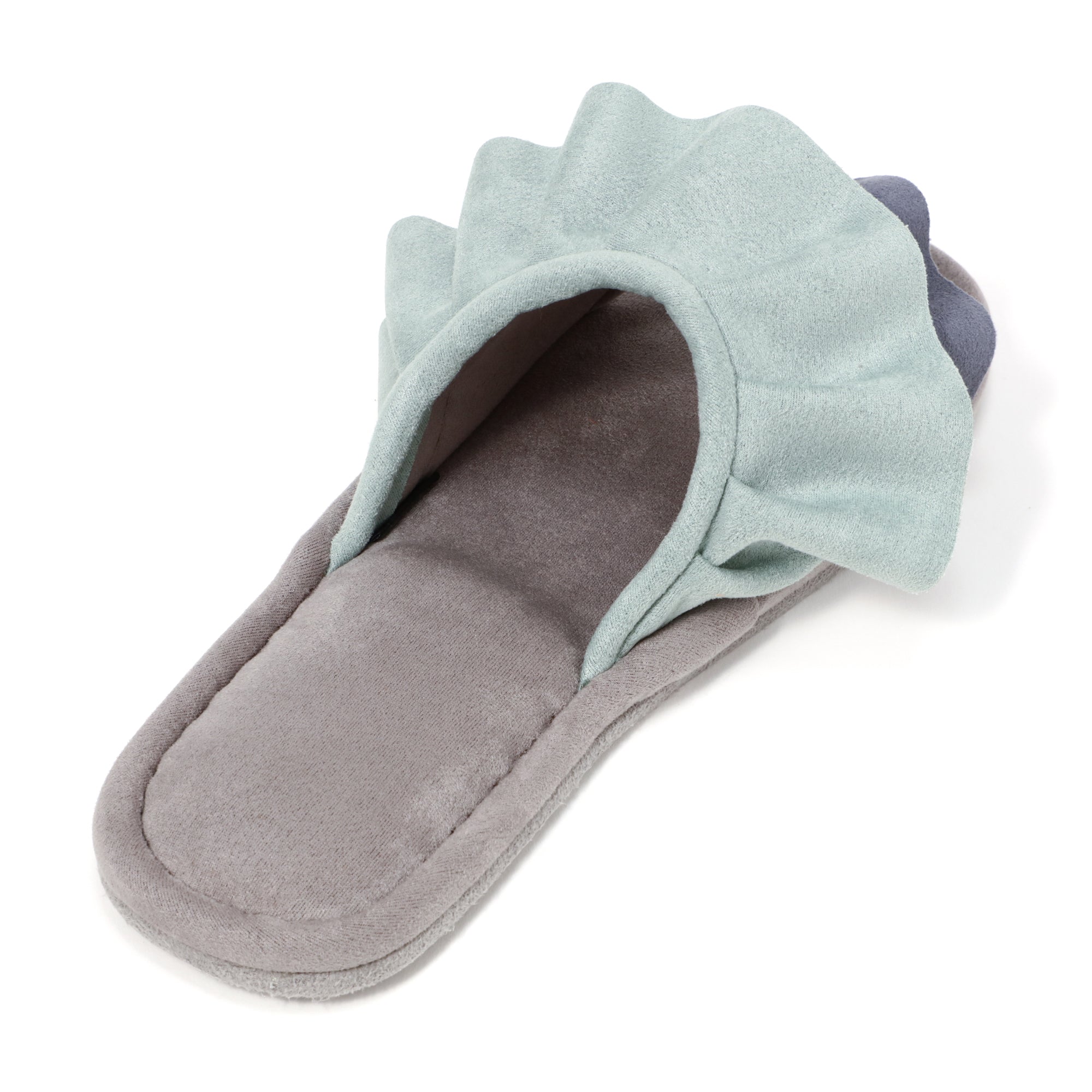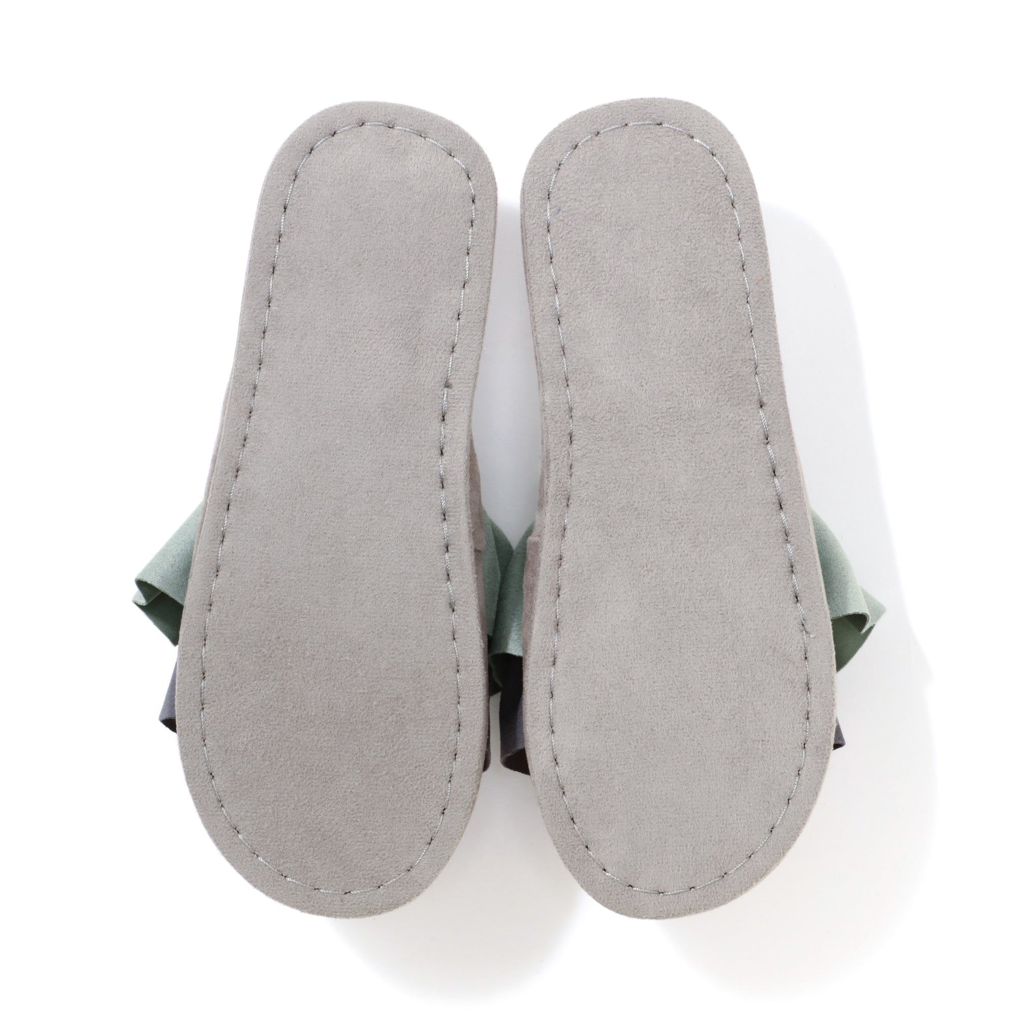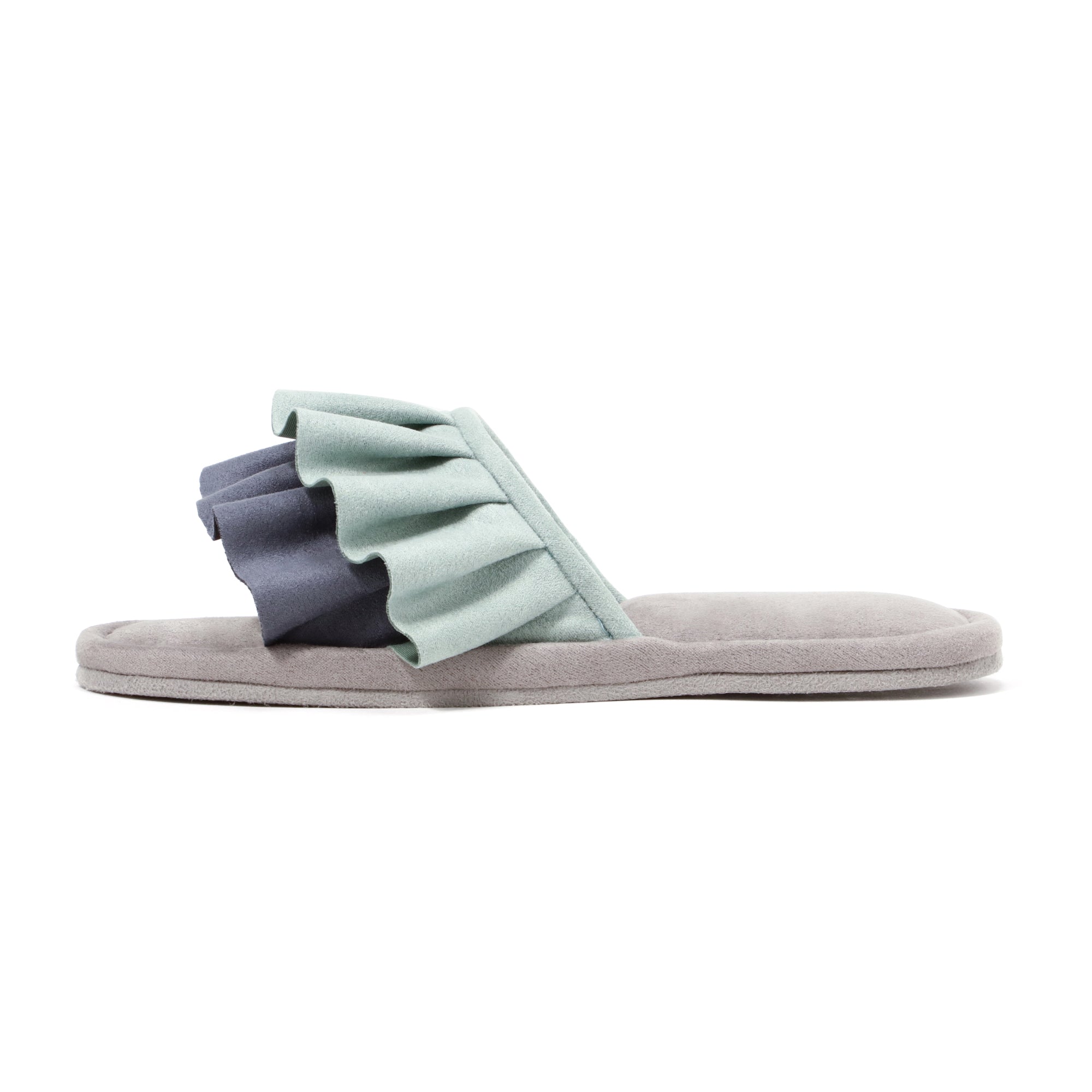 2枚のフリルで甲を覆ったデザインのルームシューズです。 フリルだけど甘すぎず、大人可愛い印象です。 オープントウタイプ。