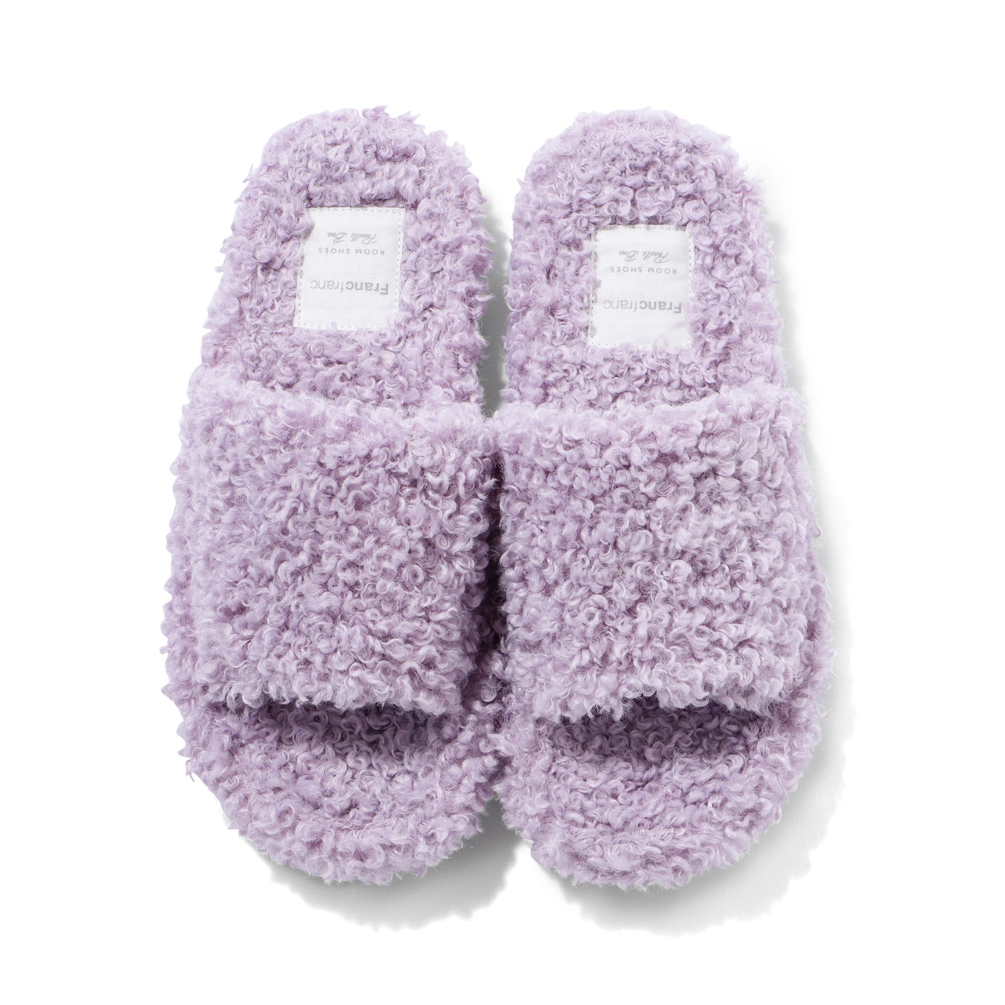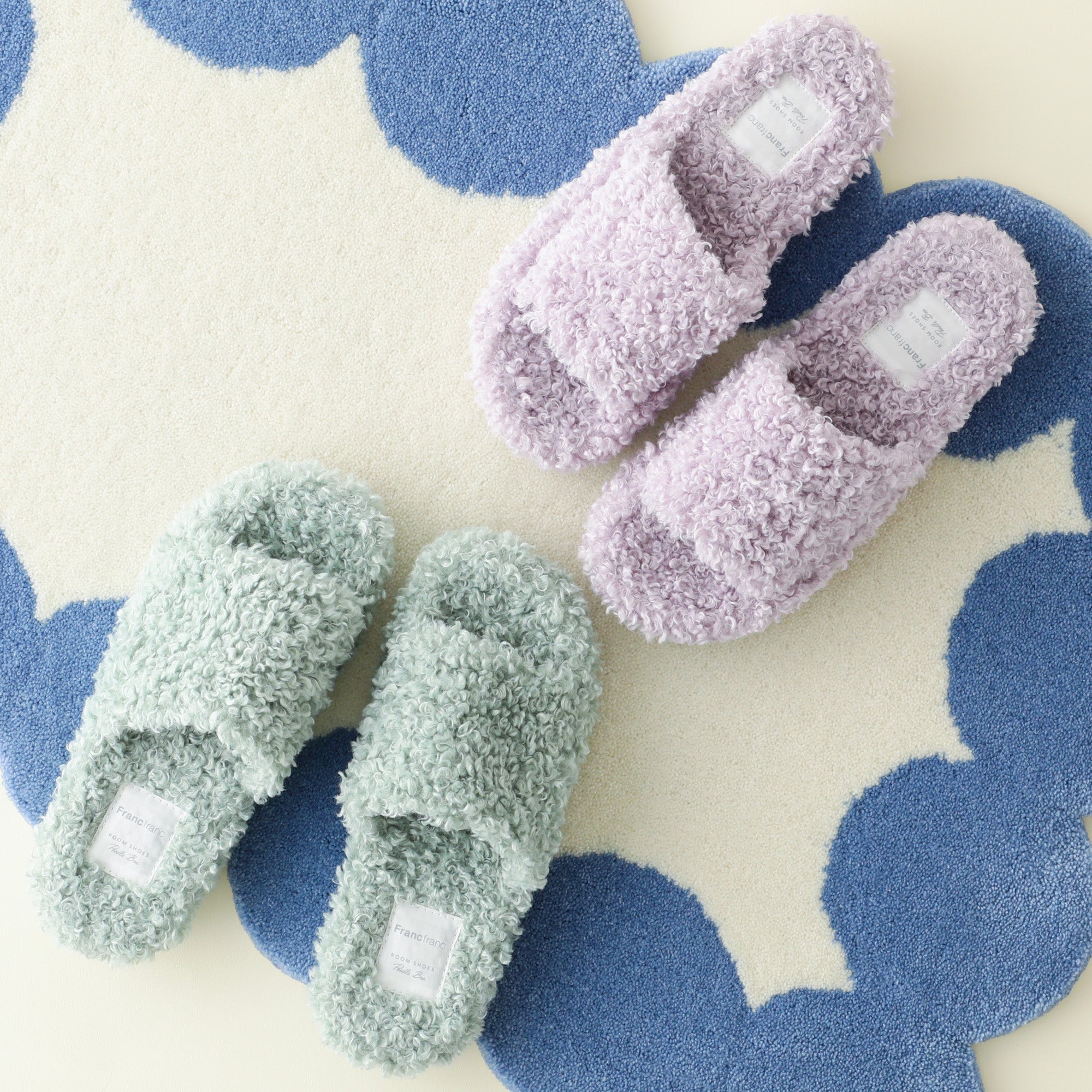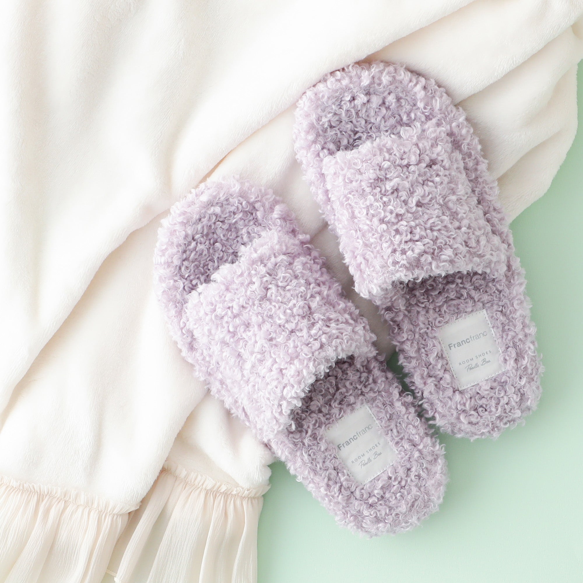 くるんとカールしたパステルカラーのボア素材が可愛いルームシューズです。気軽に履けるつま先が開いたデザインだからリラックスタイムにぴったり。ソールに高さがあるので、お部屋の中でも脚長効果が欲しい方におすすめです。