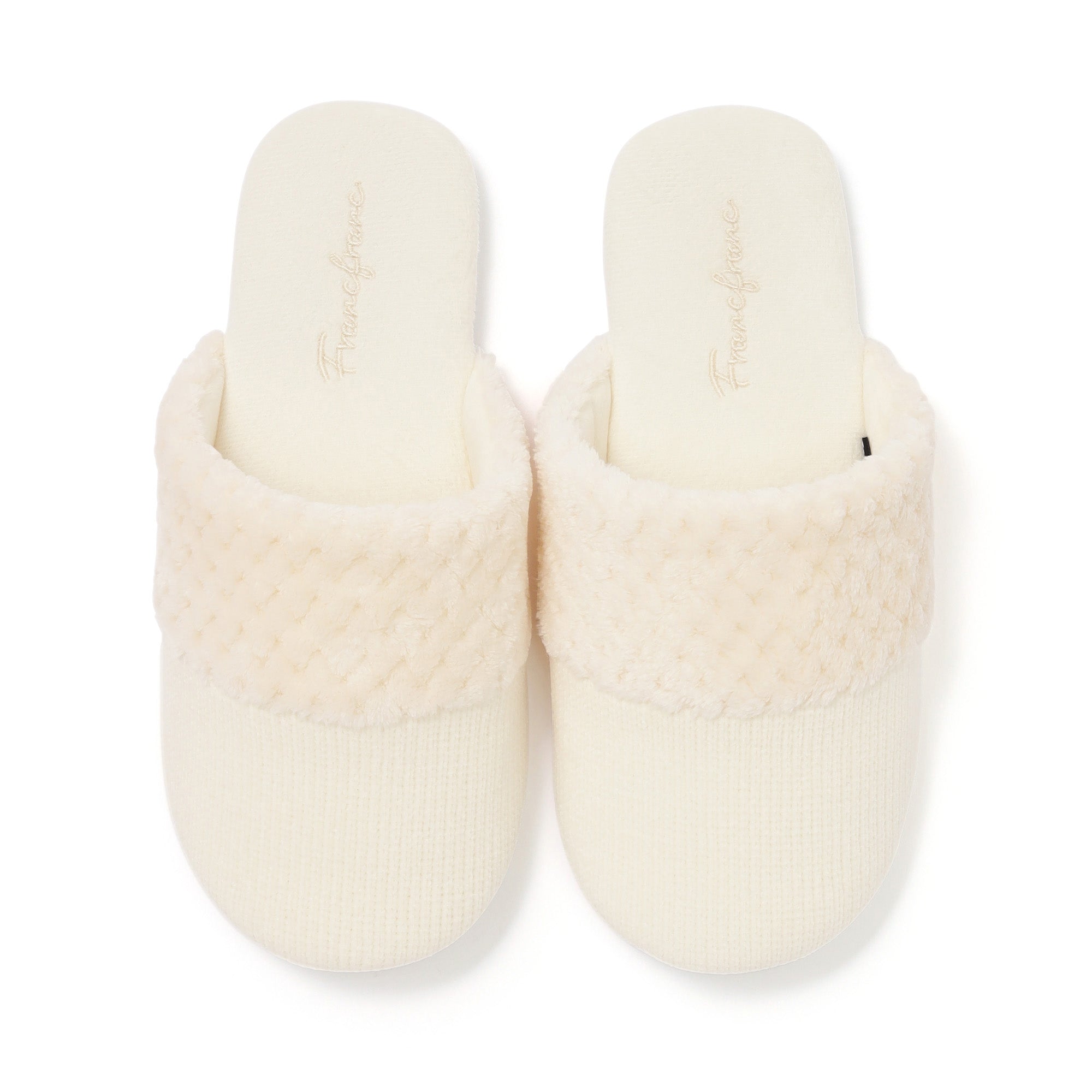 シェニールのような柔らかい素材を使用したルームシューズです。暖かさとすっきり感を両立したデザインで、もこもこしすぎず脱ぎ履きしやすい一足です。