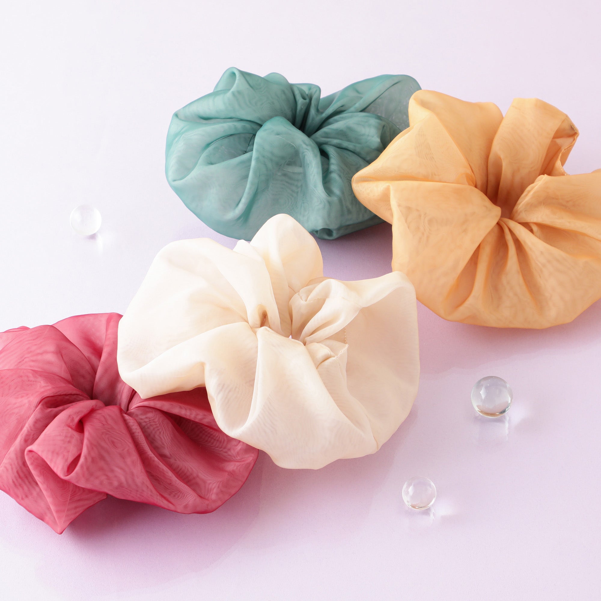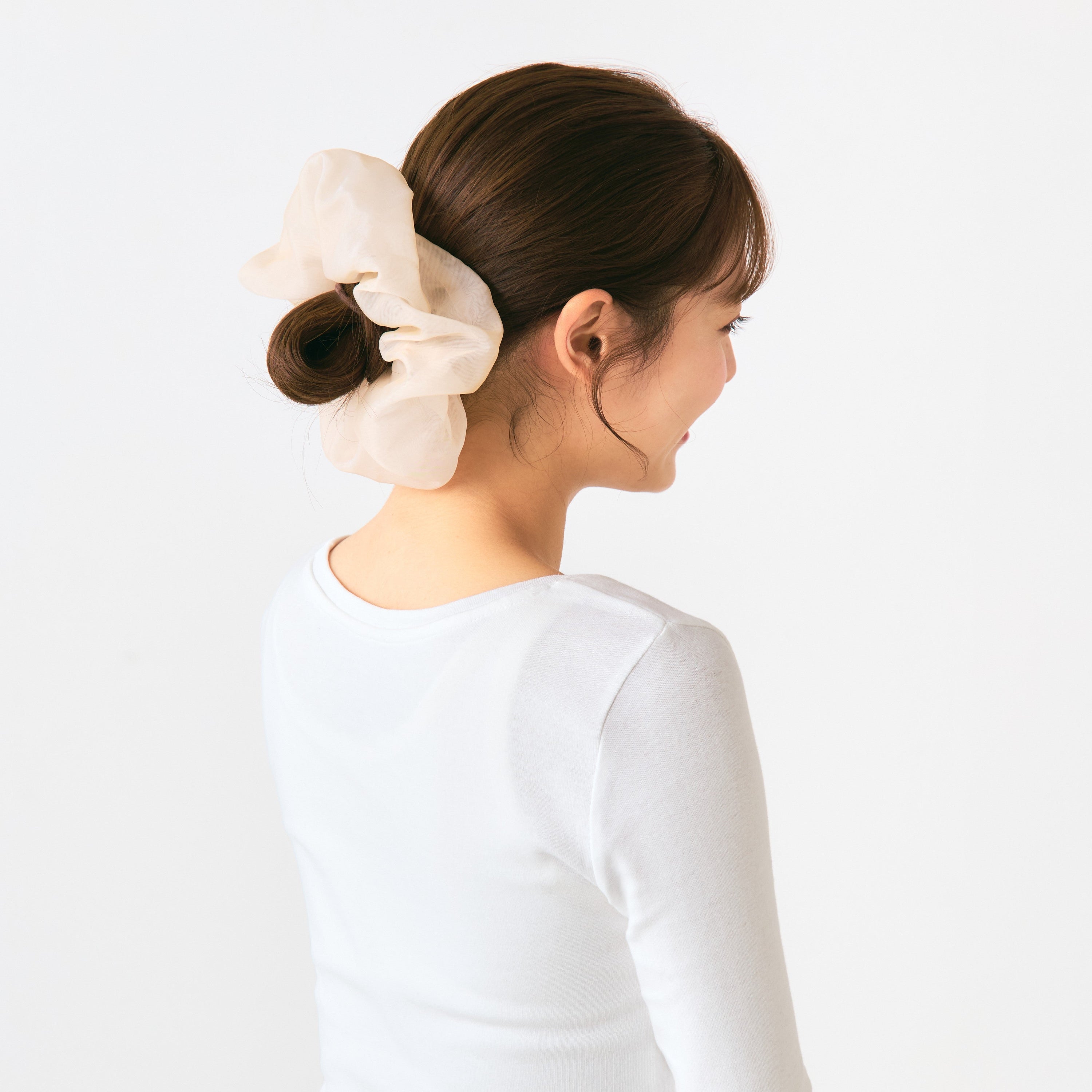 落ち着いたカラーで透け感のある素材と大きめサイズが可愛らしいシュシュです。秋らしさを取り入れたいけど、まだ暑い、そんな時期にもヘア小物なら季節感をいち早く取り入れやすいからおすすめ。家の中でも外でも着けられるおしゃれなデザインで気分をあげてくれるアイテムです。