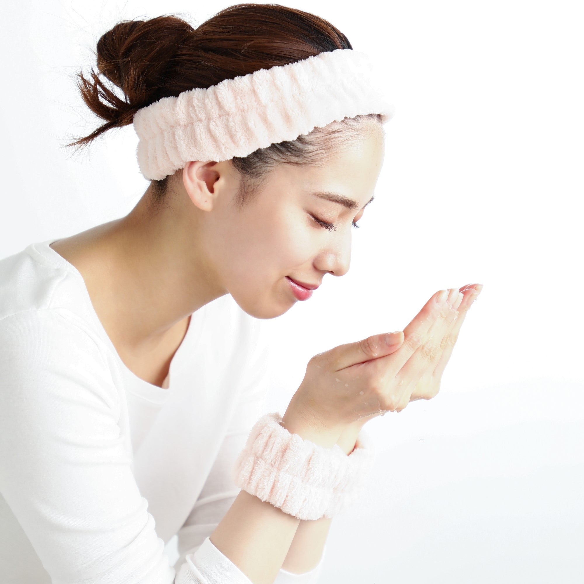 洗顔やメイク時髪の毛をまとめてくれるヘアバンドと手首にはめて洗顔時の袖濡れを防いでくれるアームバンドセットです。リストバンドをすることで、洗顔時も水が垂れず、服や床などを濡らさずに洗顔ができます。