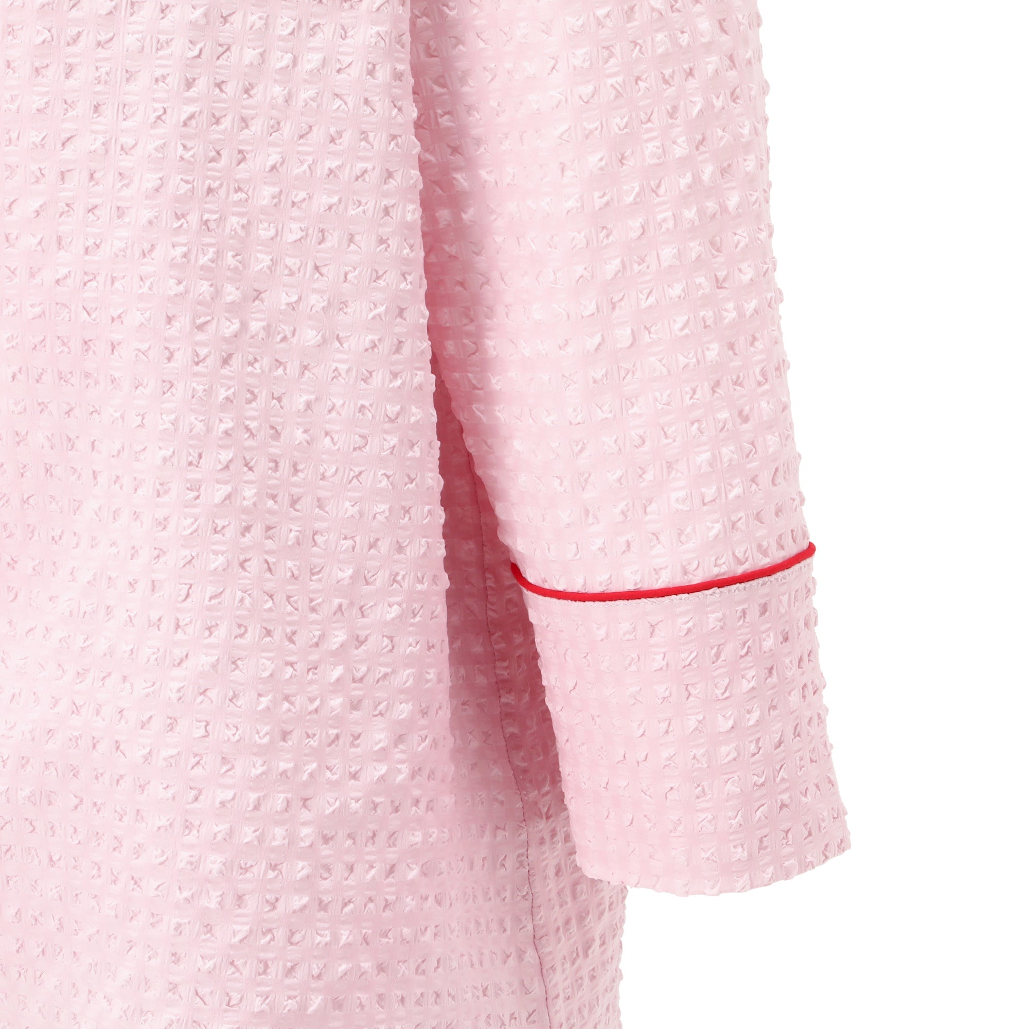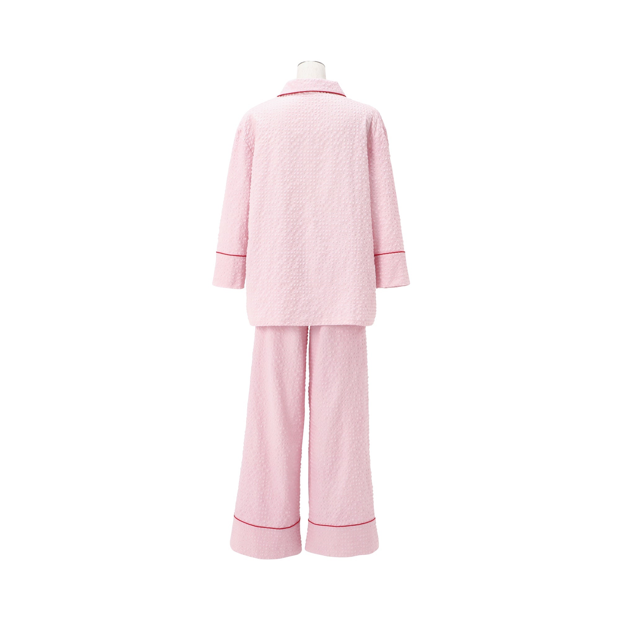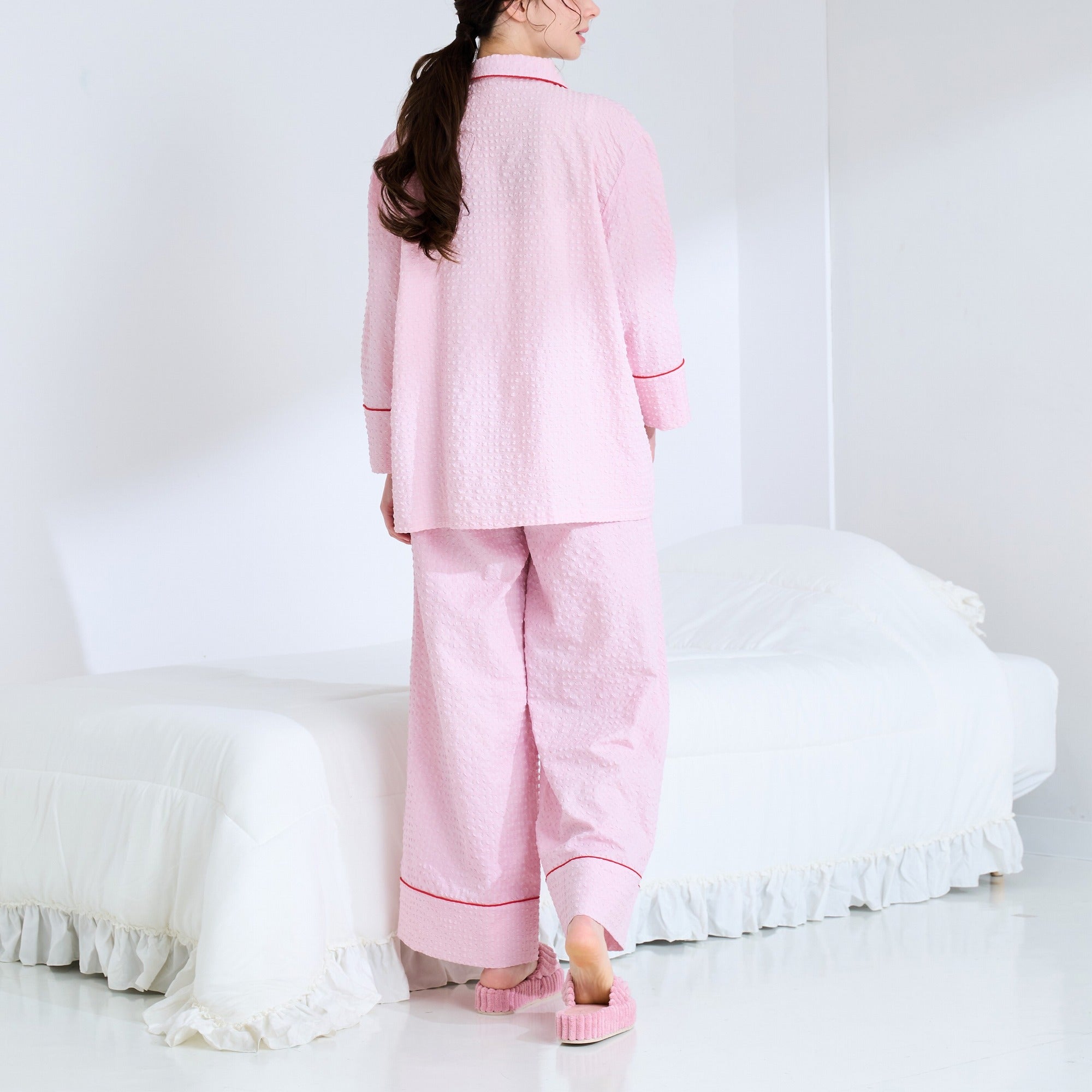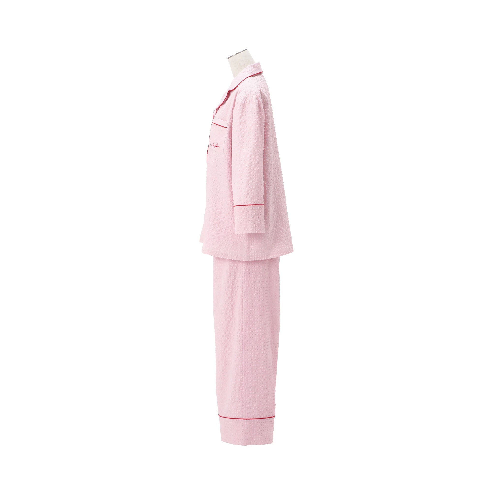 ロゴ刺繍入りのナチュラルなパジャマです。ぽこぽことした表情豊かな素材がトレンド感たっぷり。肌へ触れる面が他の素材と比べて小さいため、蒸し暑い季節もさらりと快適に過ごせます。