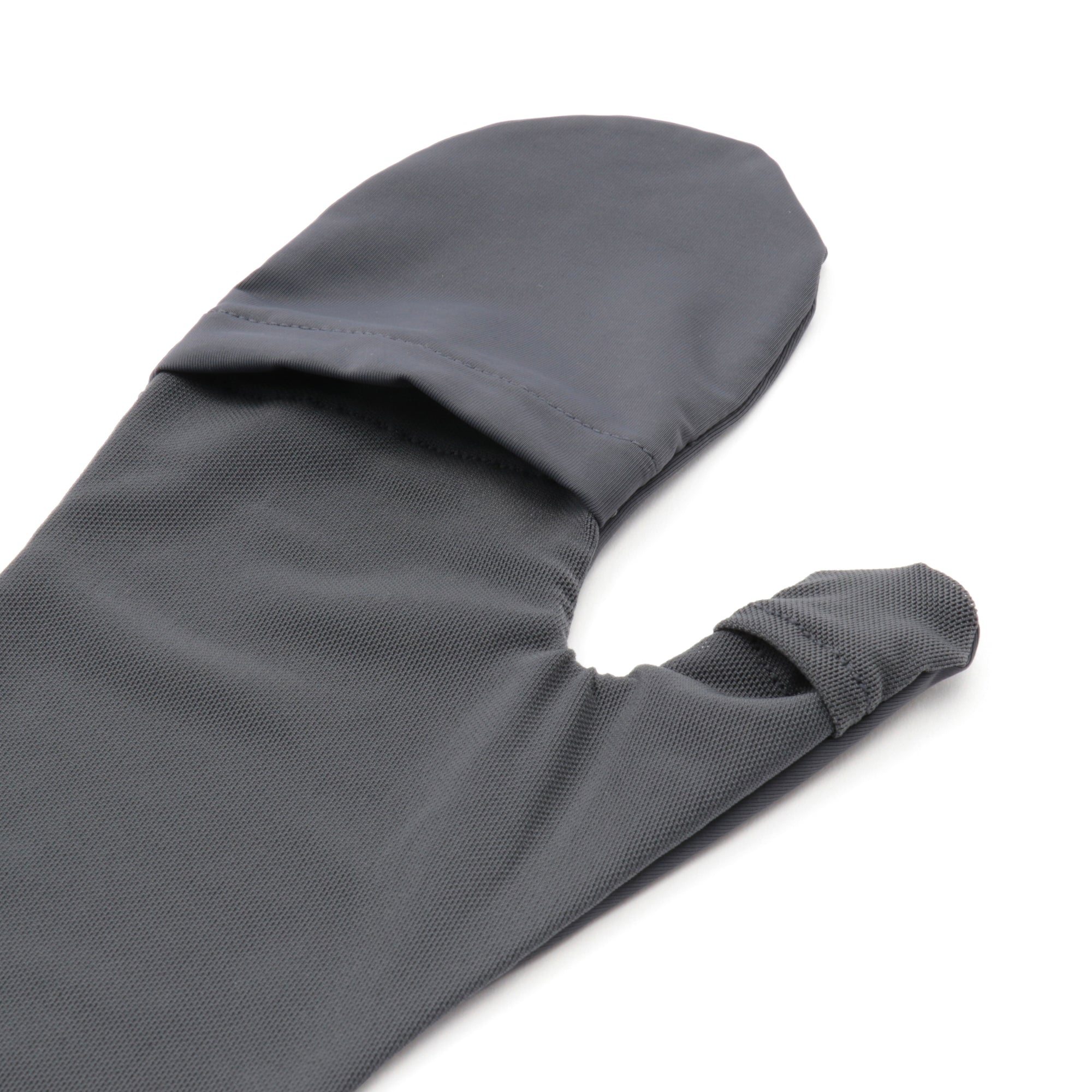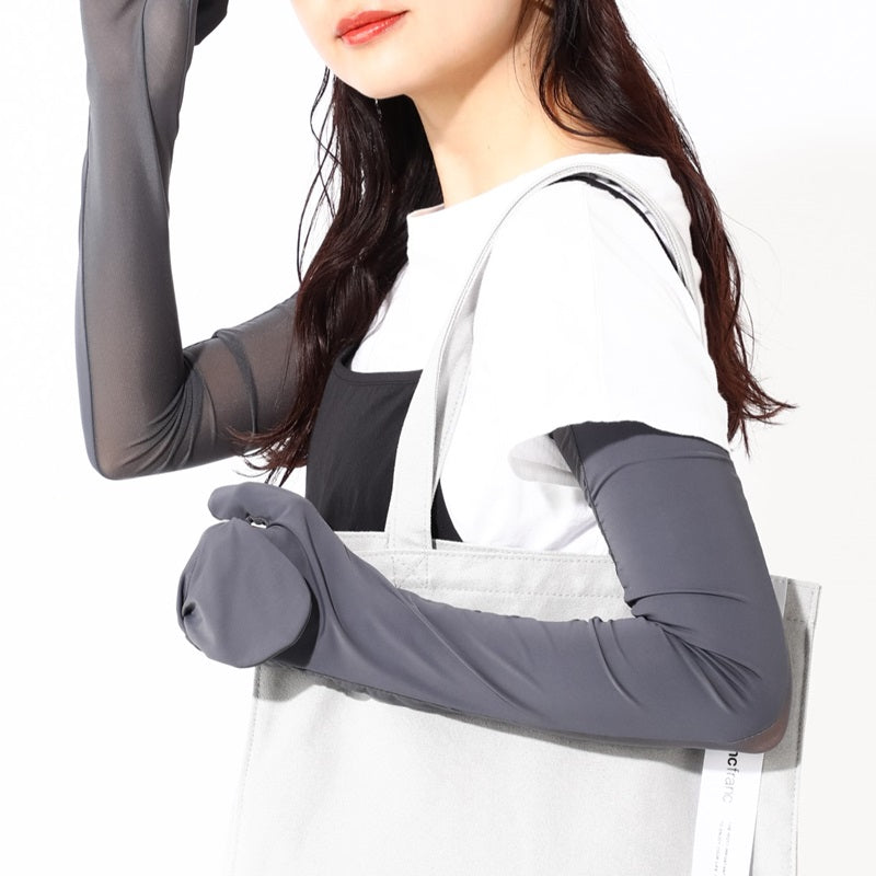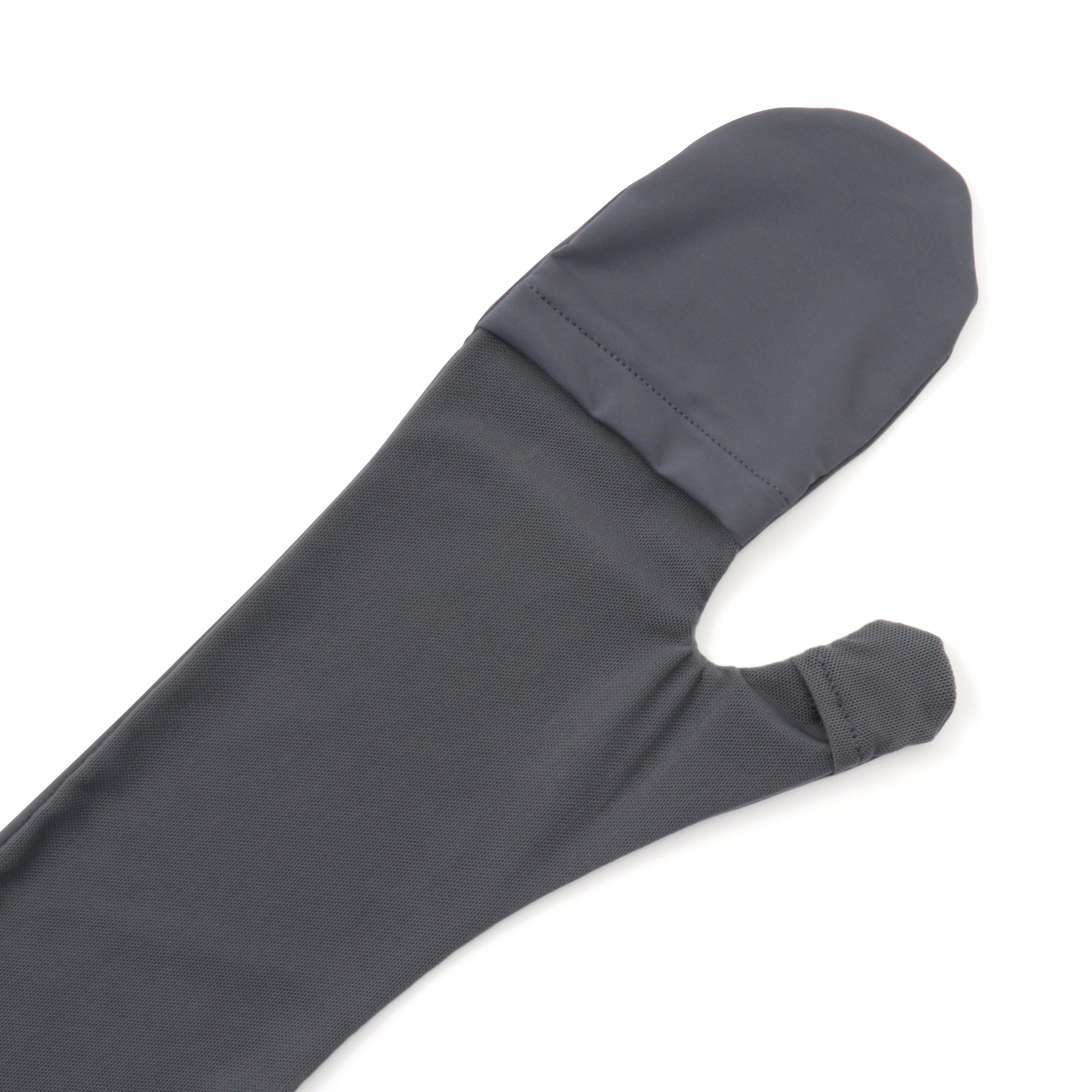 指先まですっぽり覆うミトンタイプのUV加工付きのアームカバーです。自転車や車に乗る時でも、手の甲が焼けにくいです。肌あたりの良い薄手素材、内側はメッシュなので猛暑でも付けやすい素材感です。