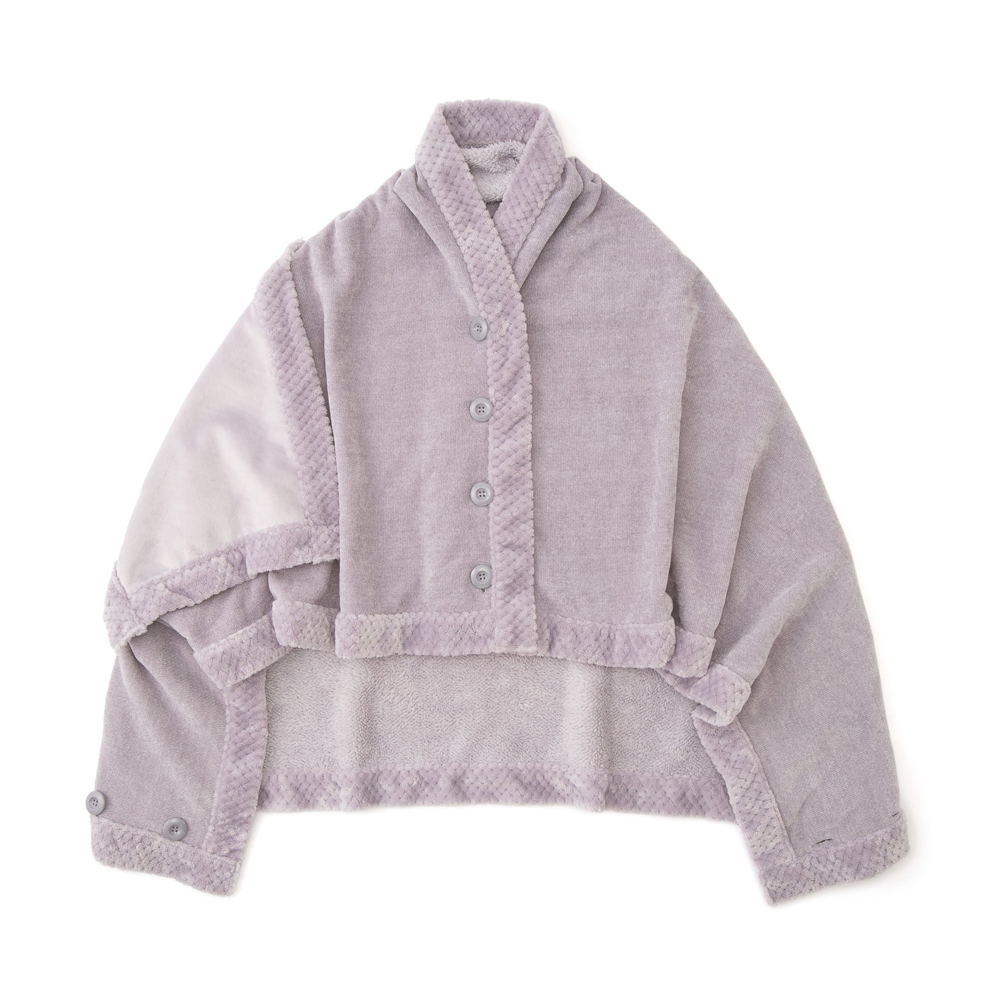 表面はシェニール織、裏面は起毛生地の両面リバーシブルのポンチョです。もっちりとしたシェニール織の手触りと、ふわふわとした起毛生地の手触りがどちらも楽しめます。ポンチョ・ボレロ・巻きスカート・ブランケットと4通りの多彩な使い方ができる便利アイテム。起毛部分へ空気を溜め込むことにより熱を保持してくれるため、暖かく過ごせます。洗濯可能でシワになりにくく、長時間着ていても疲れにくい軽量素材のため、おうち時間に最適です。Lサイズは端をジャガード生地に切り替えており、インテリアとしても部屋馴染みのよいデザインです。静電気防止加工付き。※モデル着用画像は撮影時の環境(場所、照明等)により、色味が異なって見える場合がございます。単体画像の色味をご参照ください。