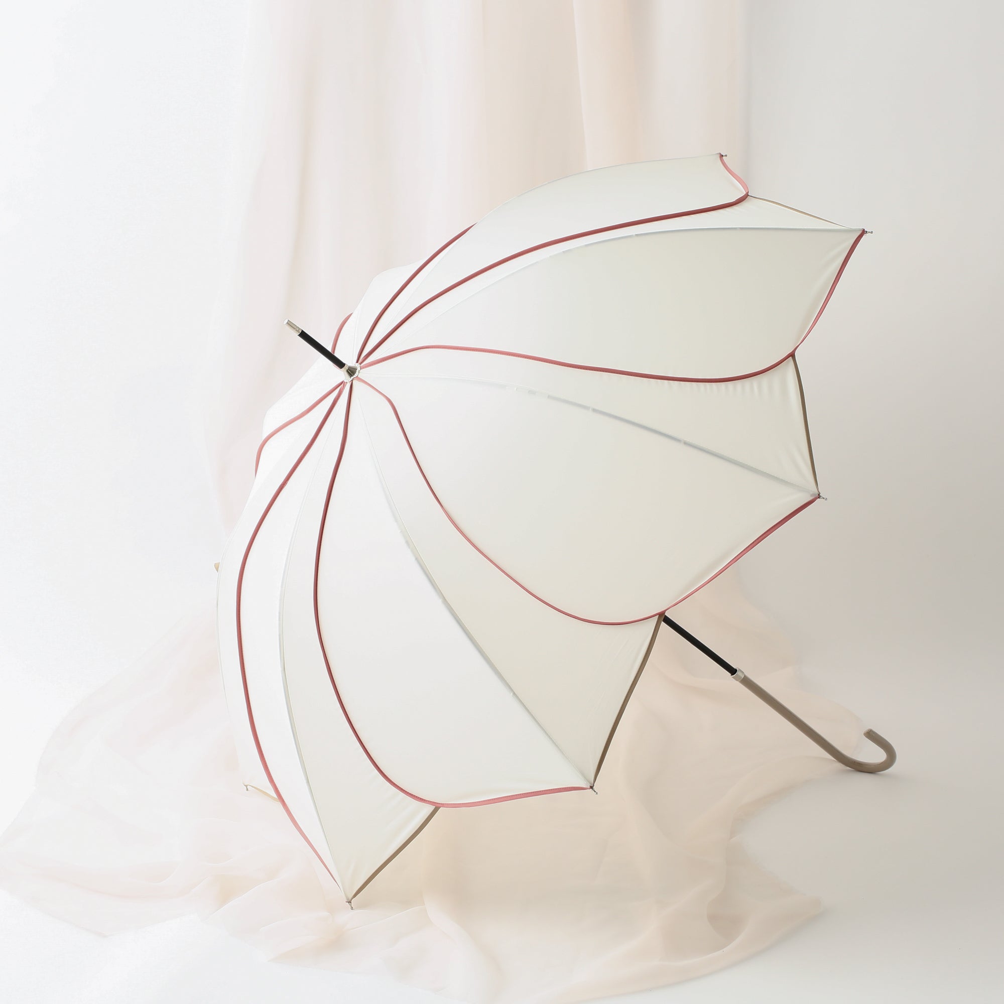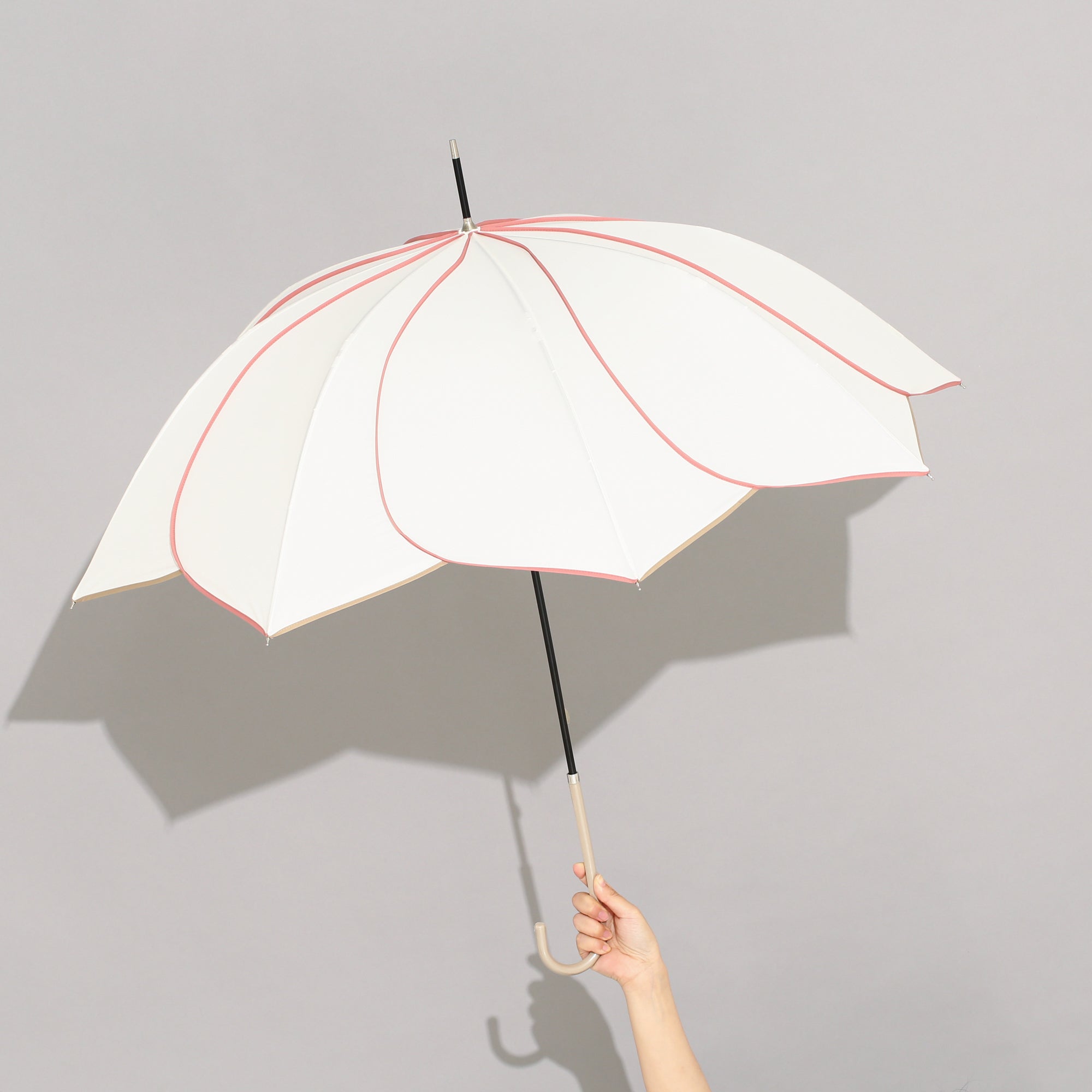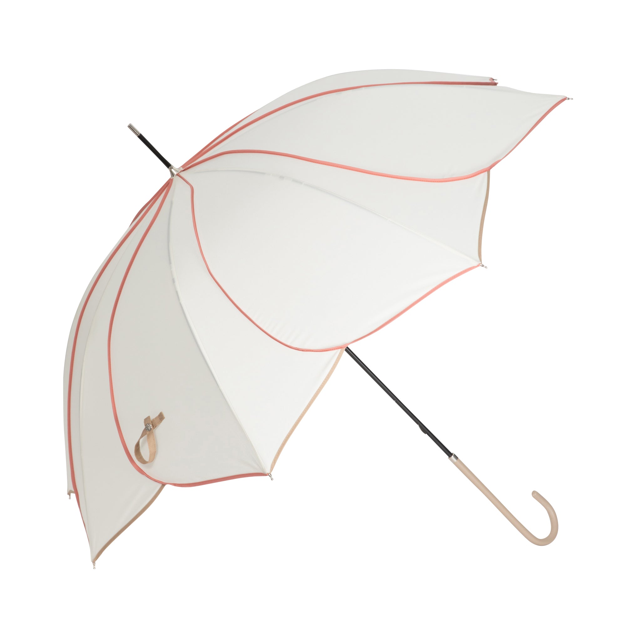 スタイリッシュなカットワークが目を引く美しいシルエットの長傘です。どんなシーンでも使いやすいデザインで普段使いからオフィスまで幅広く活躍してくれます。開閉時に指や爪を傷めないよう、ストッパー部分にセーフガード機能がついた安心仕様。爽やかなアイボリーとピンクのパイピングが雨の日の気分も明るくしてくれます。持ち手は細めの仕様で持ちやすいデザインです。お花が咲いたような華やかなデザインの傘で、雨の日も楽しくお過ごしください。