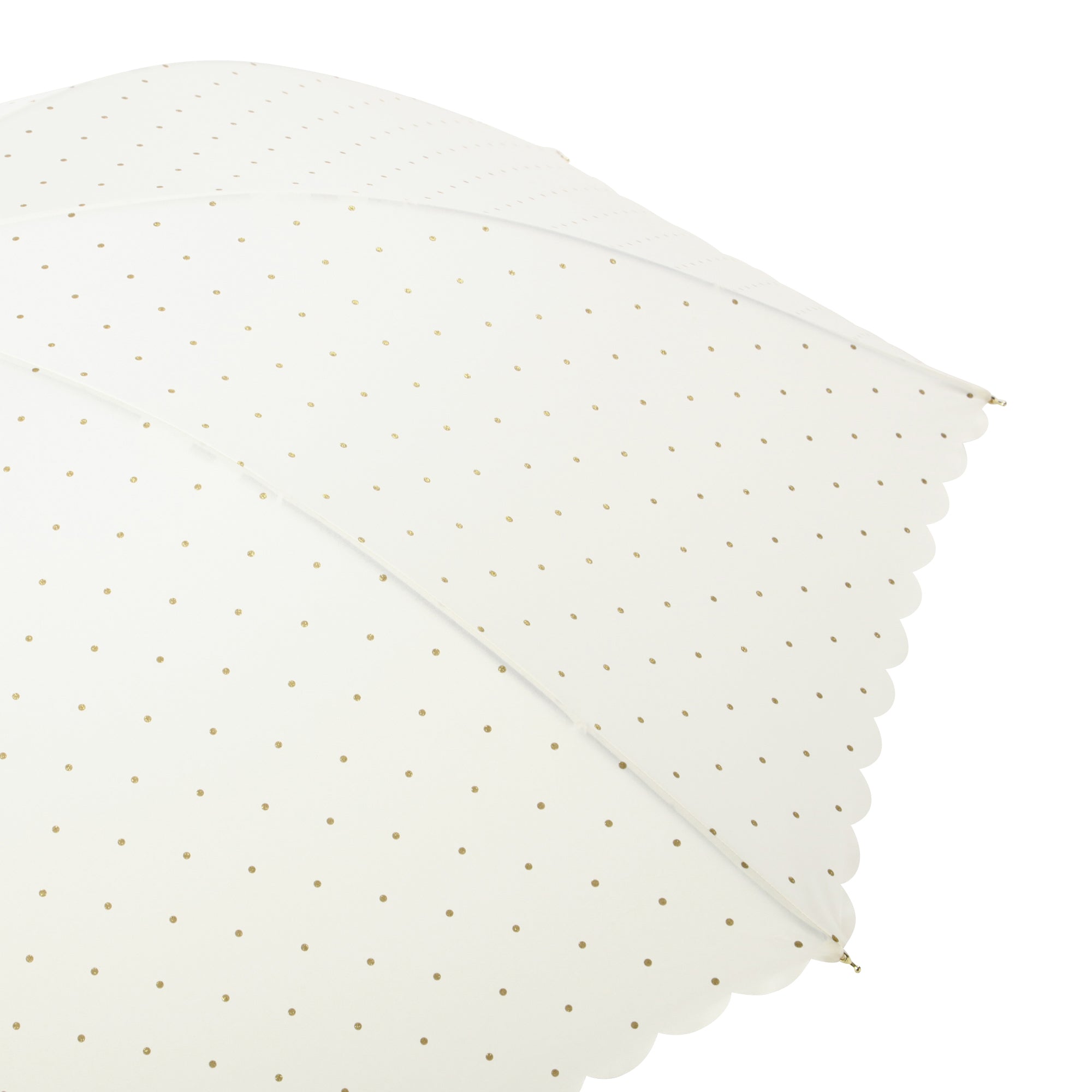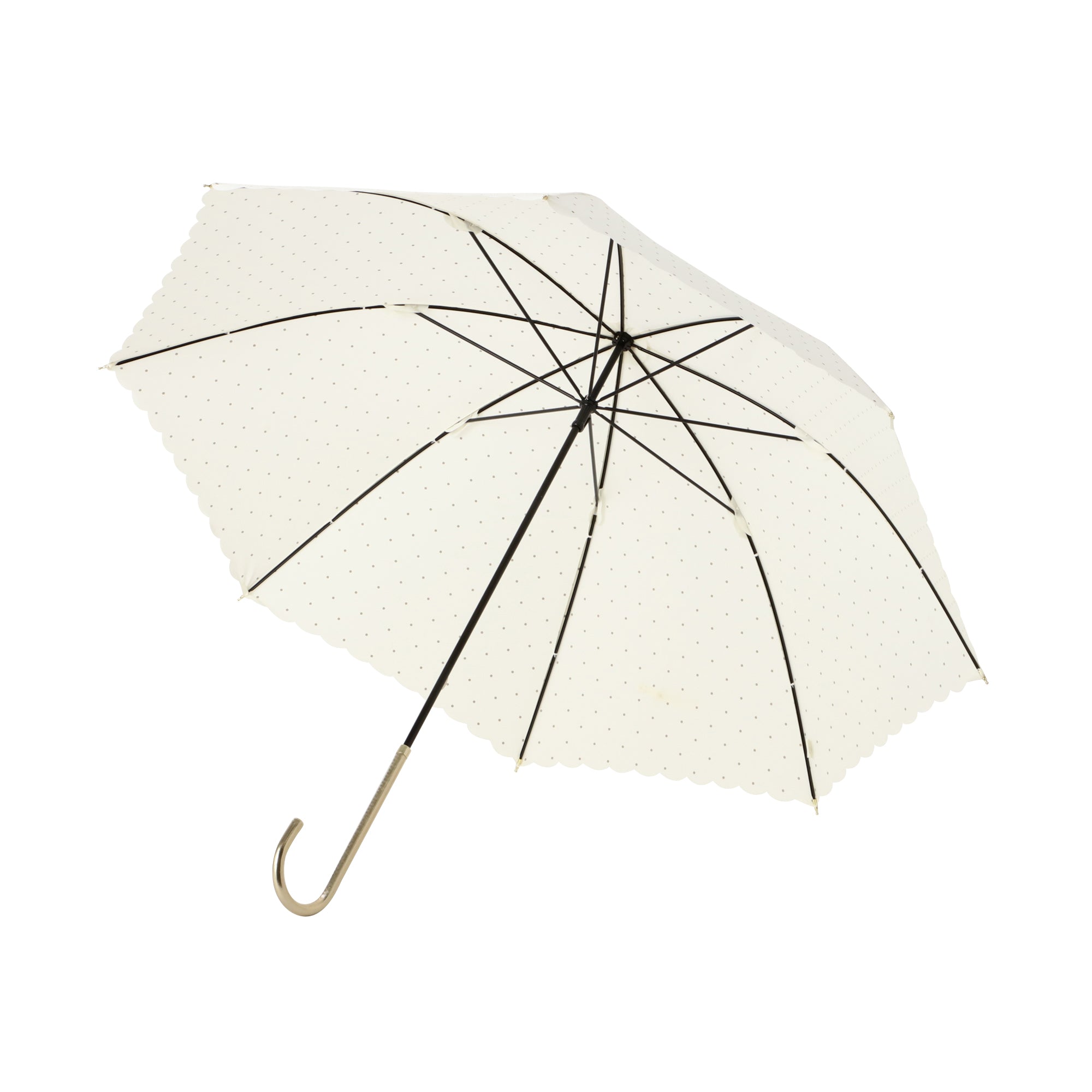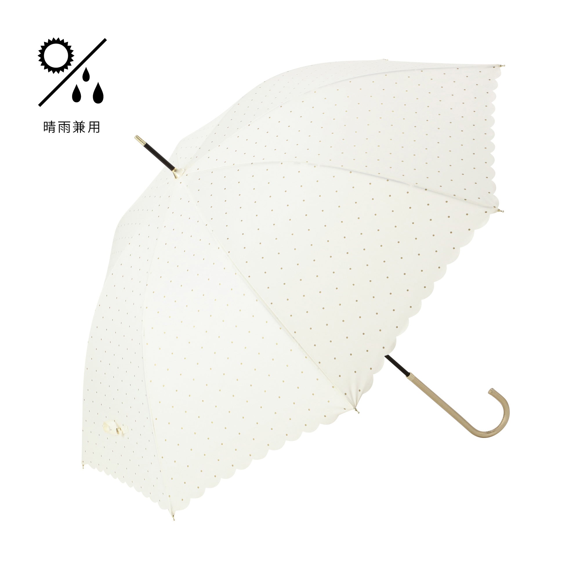 どんなスタイルにも合うシンプルなドット柄にグリッターをのせて大人なムードのデザインの晴雨兼用傘です。 柔らかい印象の白色がポイントです。 UVカット率80%以上で、晴れた日にもお使いいただけます。
