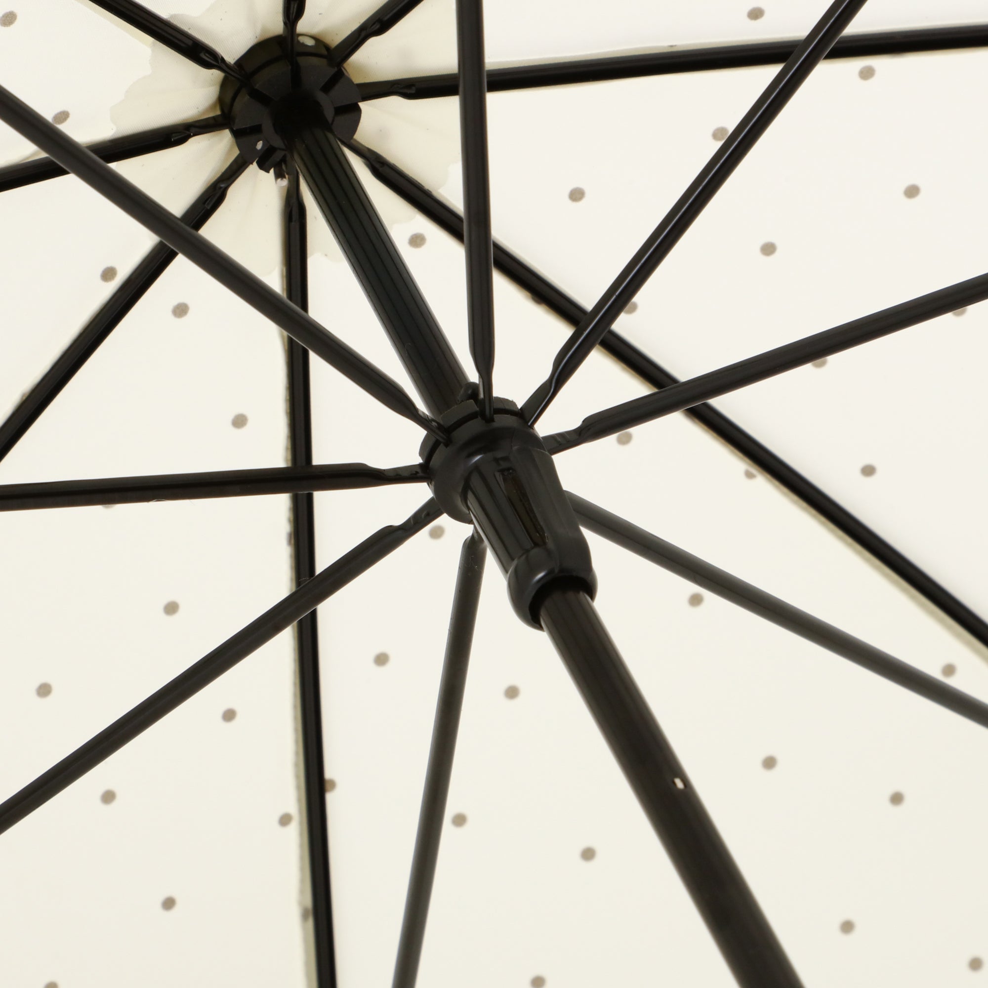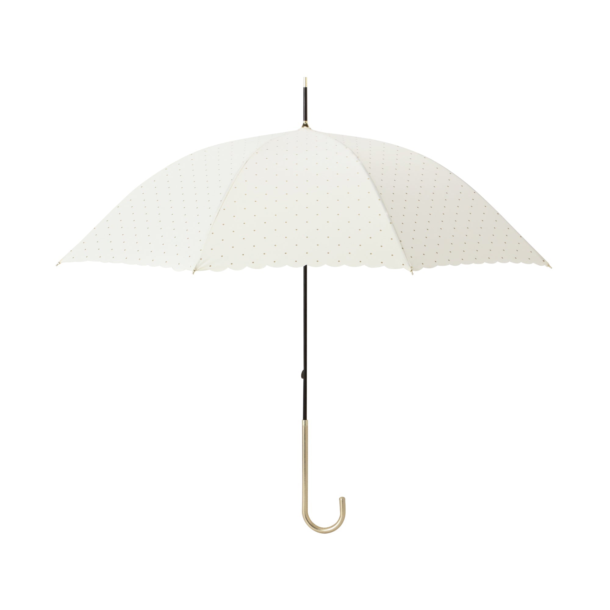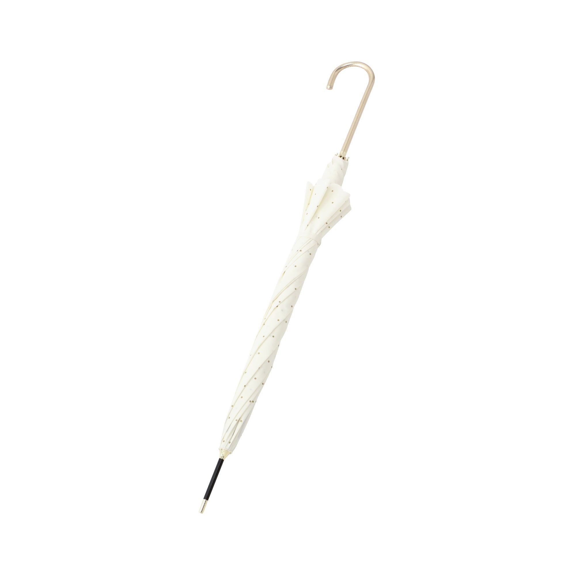 どんなスタイルにも合うシンプルなドット柄にグリッターをのせて大人なムードのデザインの晴雨兼用傘です。 柔らかい印象の白色がポイントです。 UVカット率80%以上で、晴れた日にもお使いいただけます。