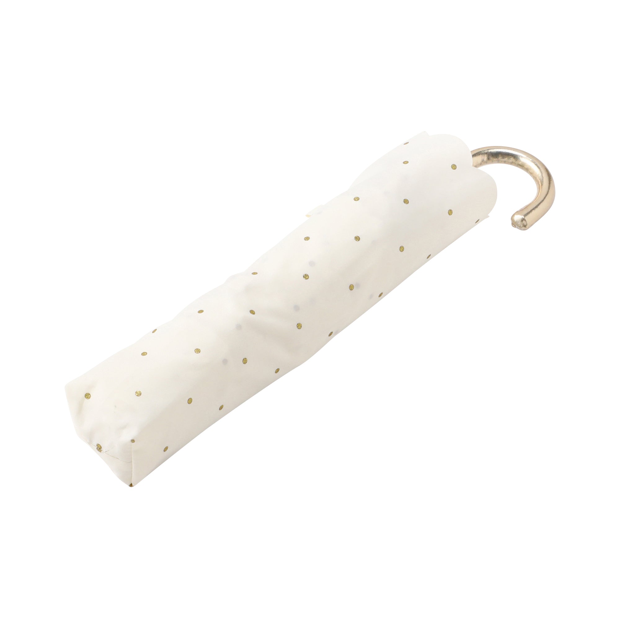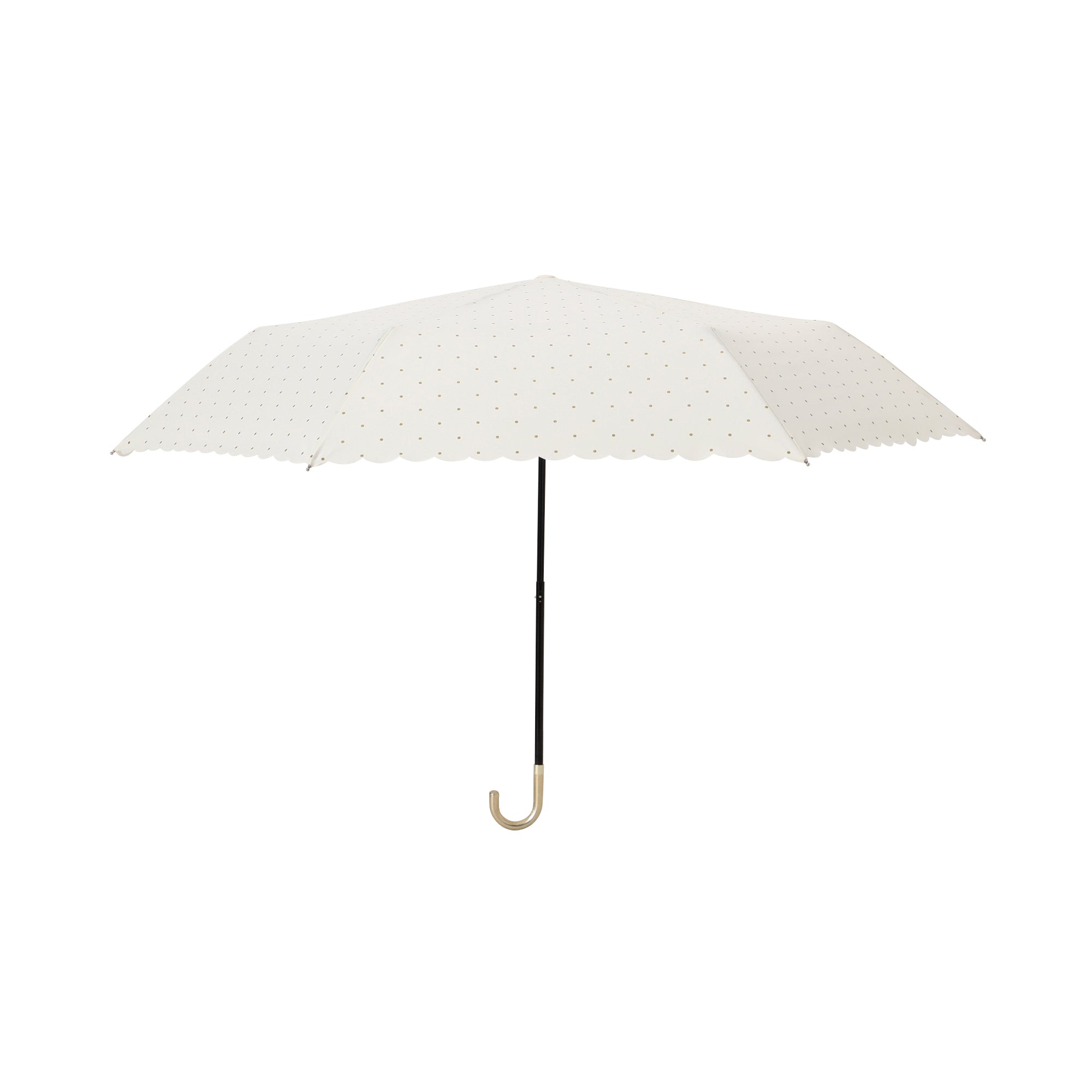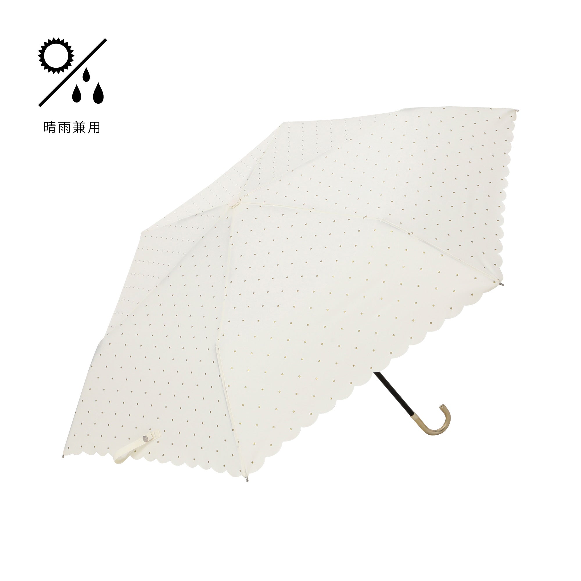 どんなスタイルにも合うシンプルなドット柄にグリッターをのせて大人なムードのデザインの晴雨兼用の折りたたみ傘です。 柔らかい印象の白色がポイントです。 UVカット率80%以上で、晴れた日にもお使いいただけます。