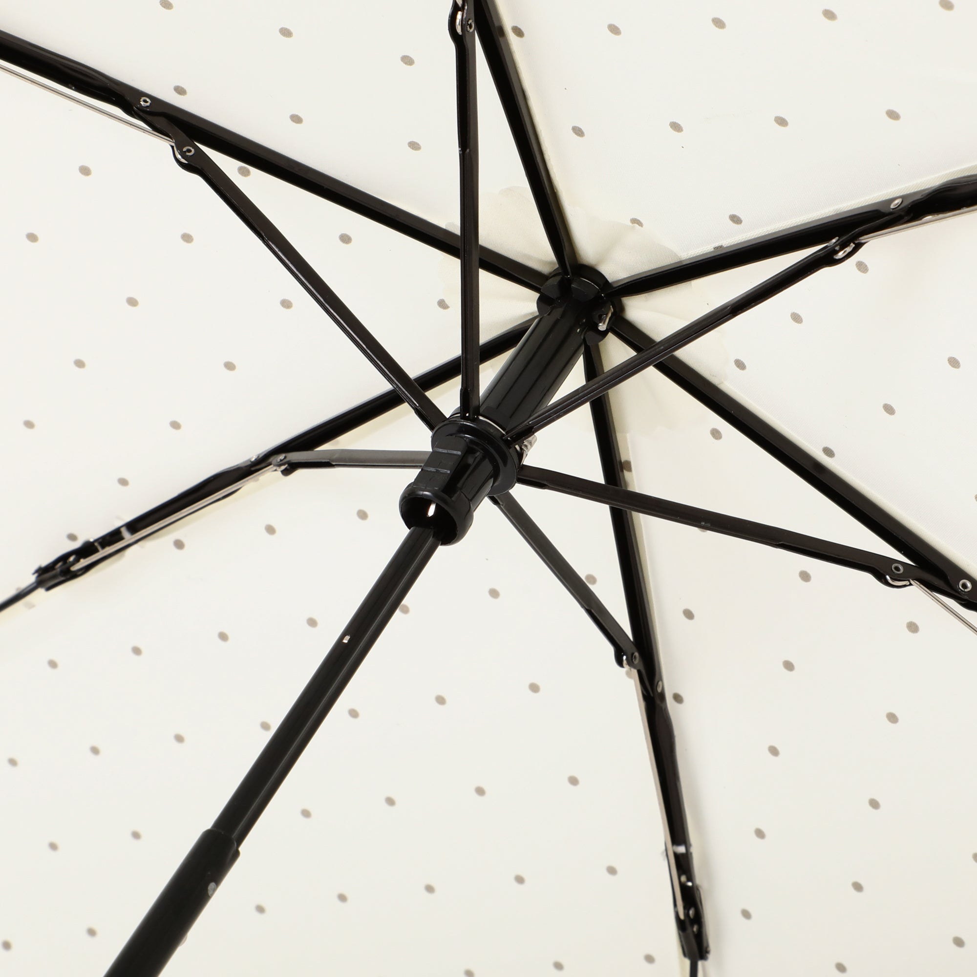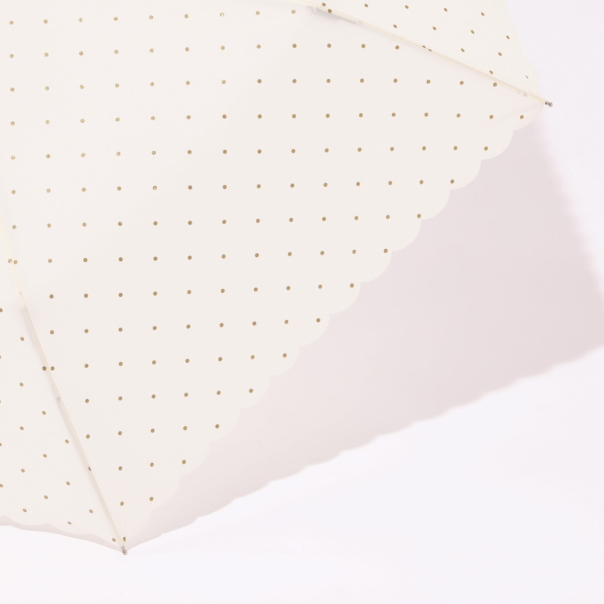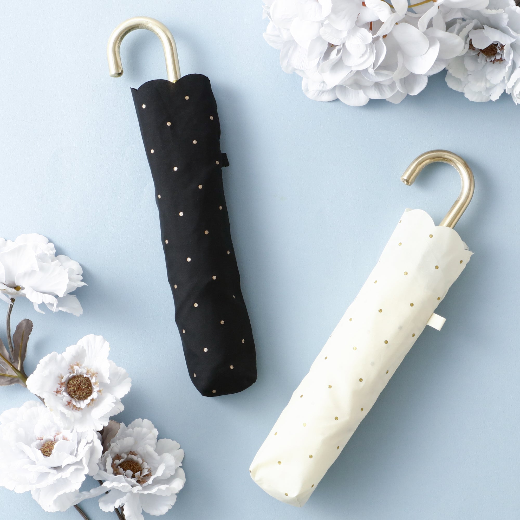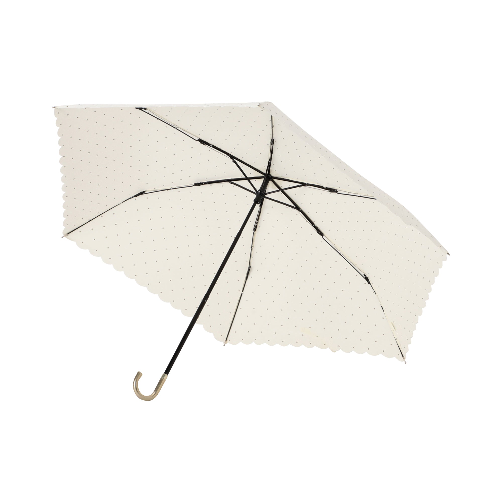どんなスタイルにも合うシンプルなドット柄にグリッターをのせて大人なムードのデザインの晴雨兼用の折りたたみ傘です。 柔らかい印象の白色がポイントです。 UVカット率80%以上で、晴れた日にもお使いいただけます。