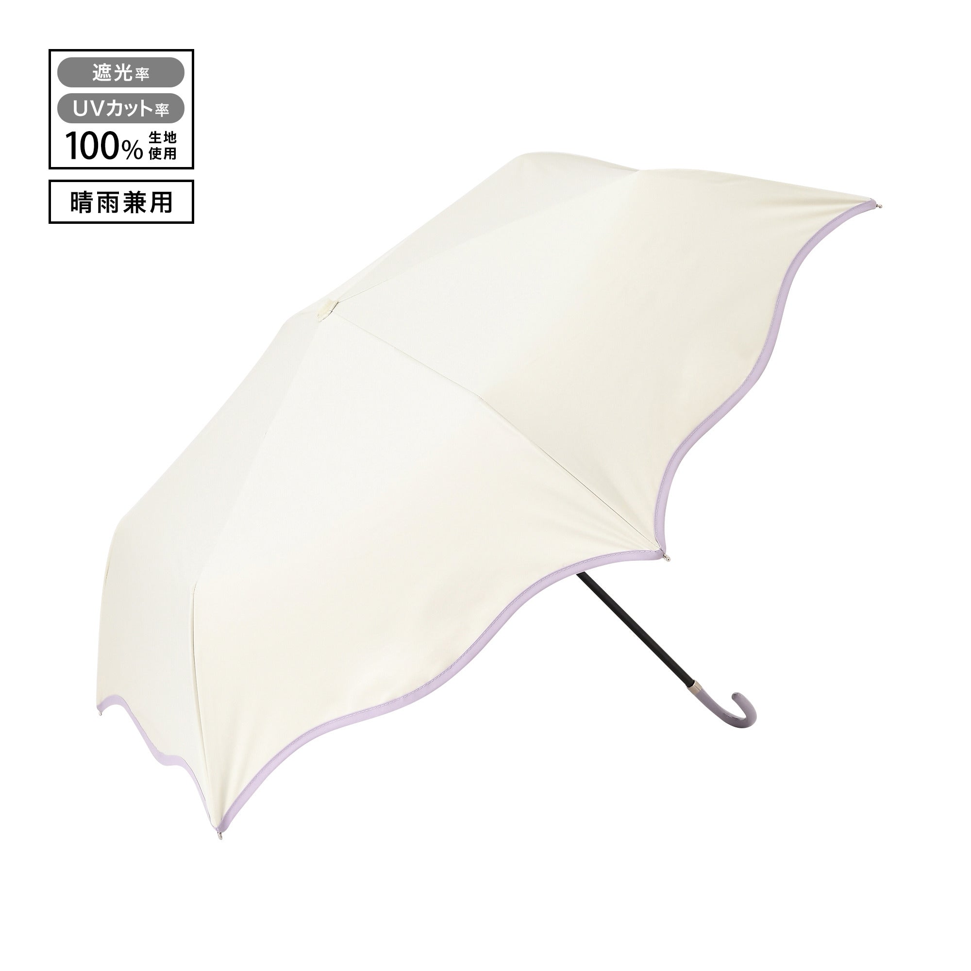 ヘムがうねうねしたトレンドライクなデザインの遮光機能付き晴雨兼用の折りたたみ傘です。遮光率・UVカット率100%の生地を使用し、裏面は黒を採用しているため、夏の日差しが強い日でも眩しくなく快適に過ごせます。晴雨兼用傘なので、急に雨が降ってきてもこの1本で安心です。※傘の遮光率・UVカット率・UPF値は生地の状態での測定値です。傘本体の性能を示す数値ではございません。また、生地に施された刺繍・縫製などのUV加工生地以外の部分もこの限りではございません。