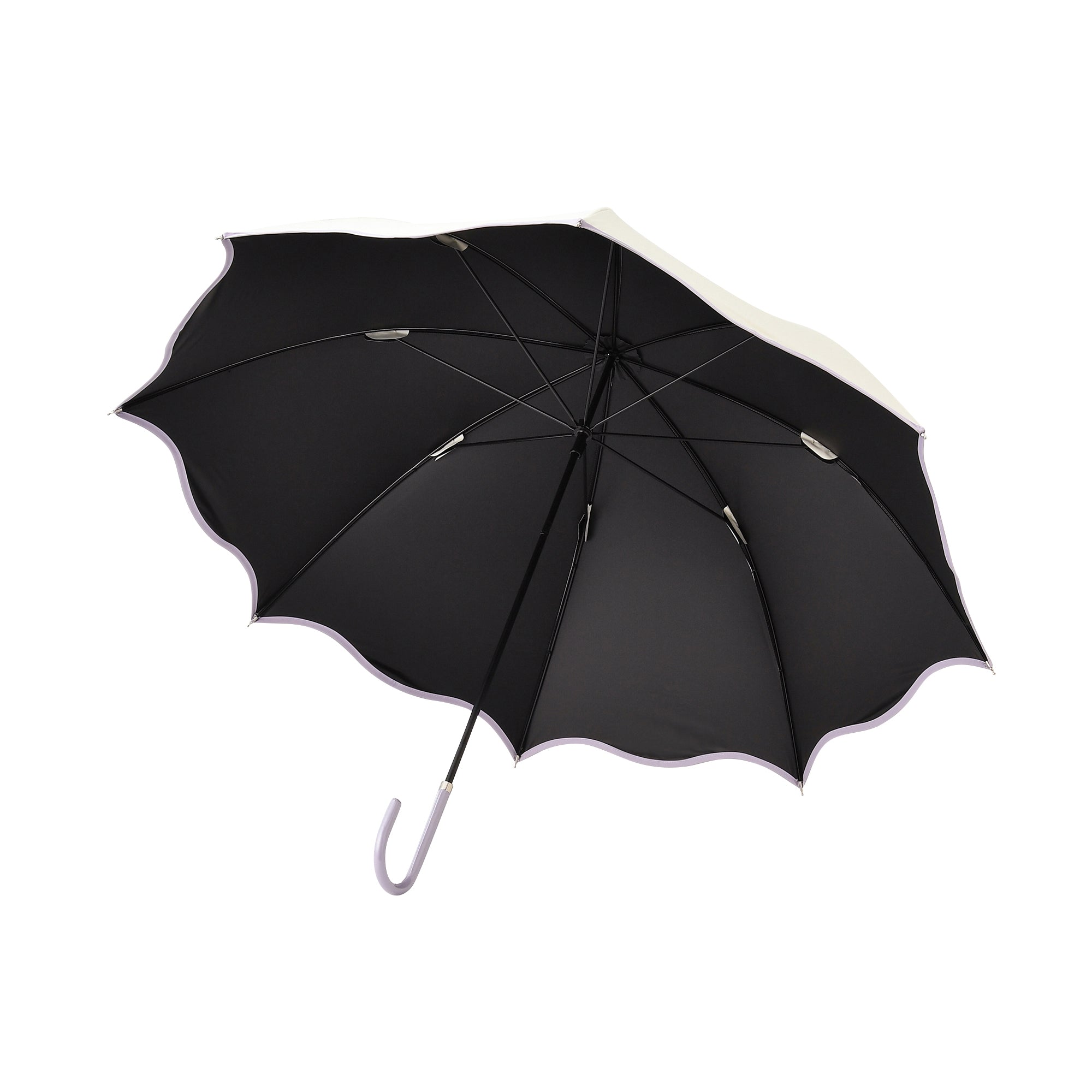 ヘムがうねうねしたトレンドライクなデザインの遮光機能付き晴雨兼用の長傘です。遮光率・UVカット率100%の生地を使用し、裏面は黒を採用しているため、夏の日差しが強い日でも眩しくなく快適に過ごせます。晴雨兼用傘なので、急に雨が降ってきてもこの1本で安心です。直径58cmと大きめサイズですが、持ち手と露先を短めにすることで閉じた時に短くなる仕様。持ち運びしやすい長さながら、開いた時は大きく安心感のあるサイズです。※傘の遮光率・UVカット率・UPF値は生地の状態での測定値です。傘本体の性能を示す数値ではございません。また、生地に施された刺繍・縫製などのUV加工生地以外の部分もこの限りではございません。