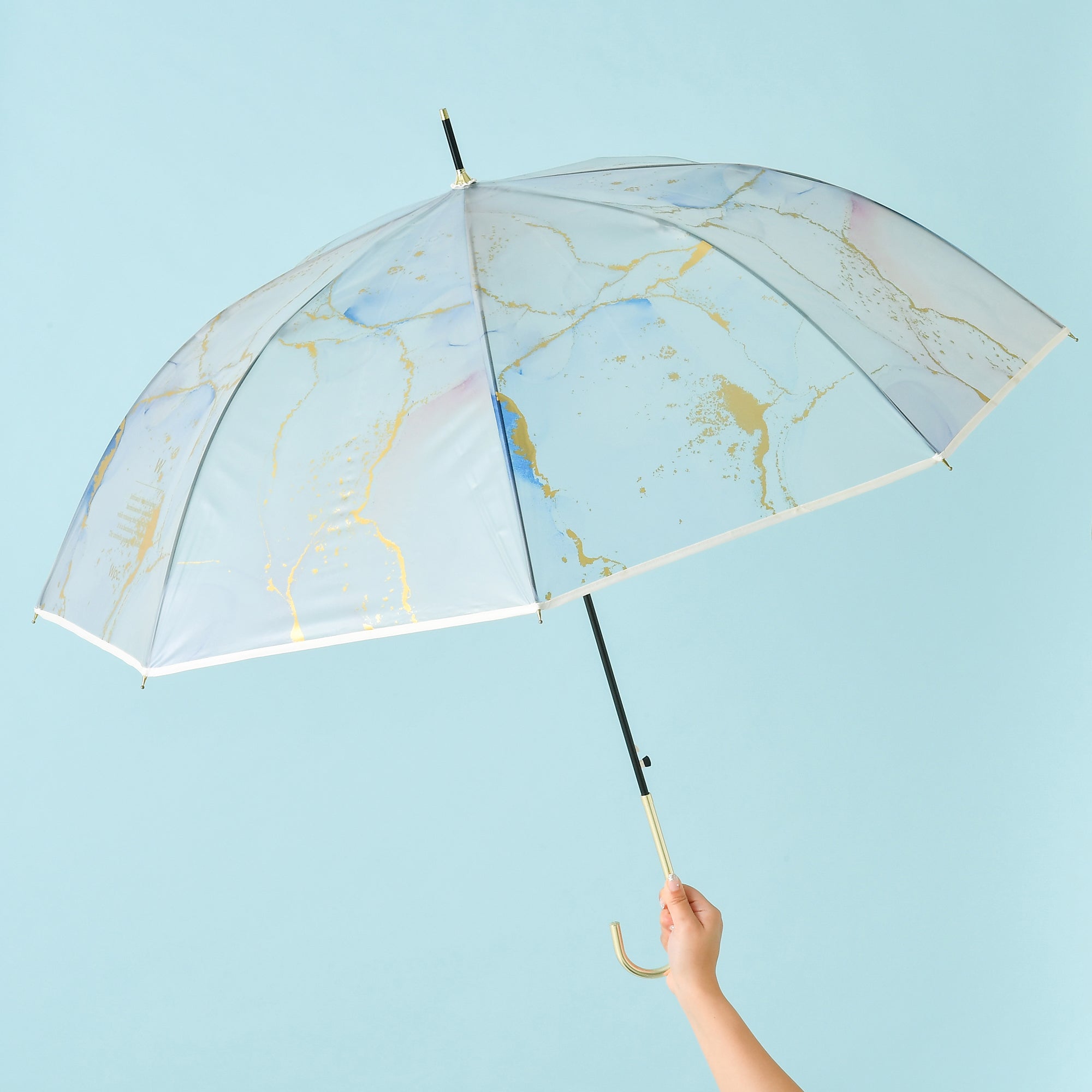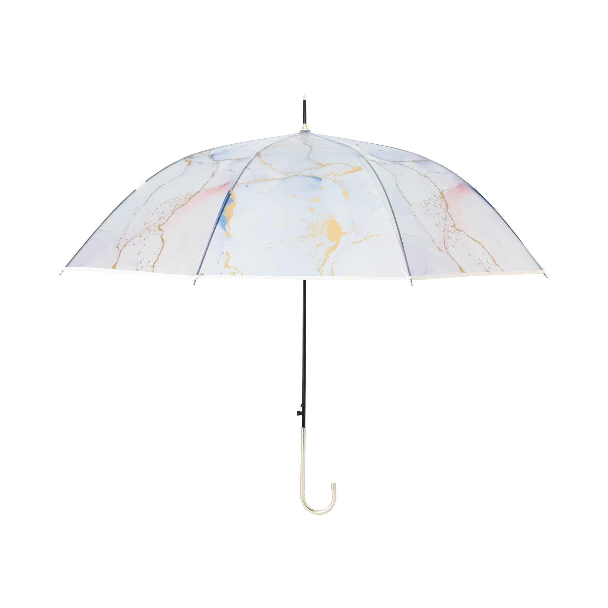 インクアートのデザインが施されたビニール傘です。垂らしたインクから偶然ひろがる模様や彩りが無造作に重なり合い、調和する仕上がりはまるで穏やかな波のよう。スカイブルーのシックなカラーが大人っぽさを演出してくれます。ワンタッチでさっと開けるジャンプ式を採用しているので、片手でも簡単に開けます。留め具はスナップ式です。直径103cmの大きめサイズだから広範囲をしっかりカバーしたい方におすすめです。持ちやすく華奢なゴールド色のハンドルが手元を美しく見せてくれます。透明感のあるビニール生地に広がるインクアートの幻想的な世界をお楽しみください。