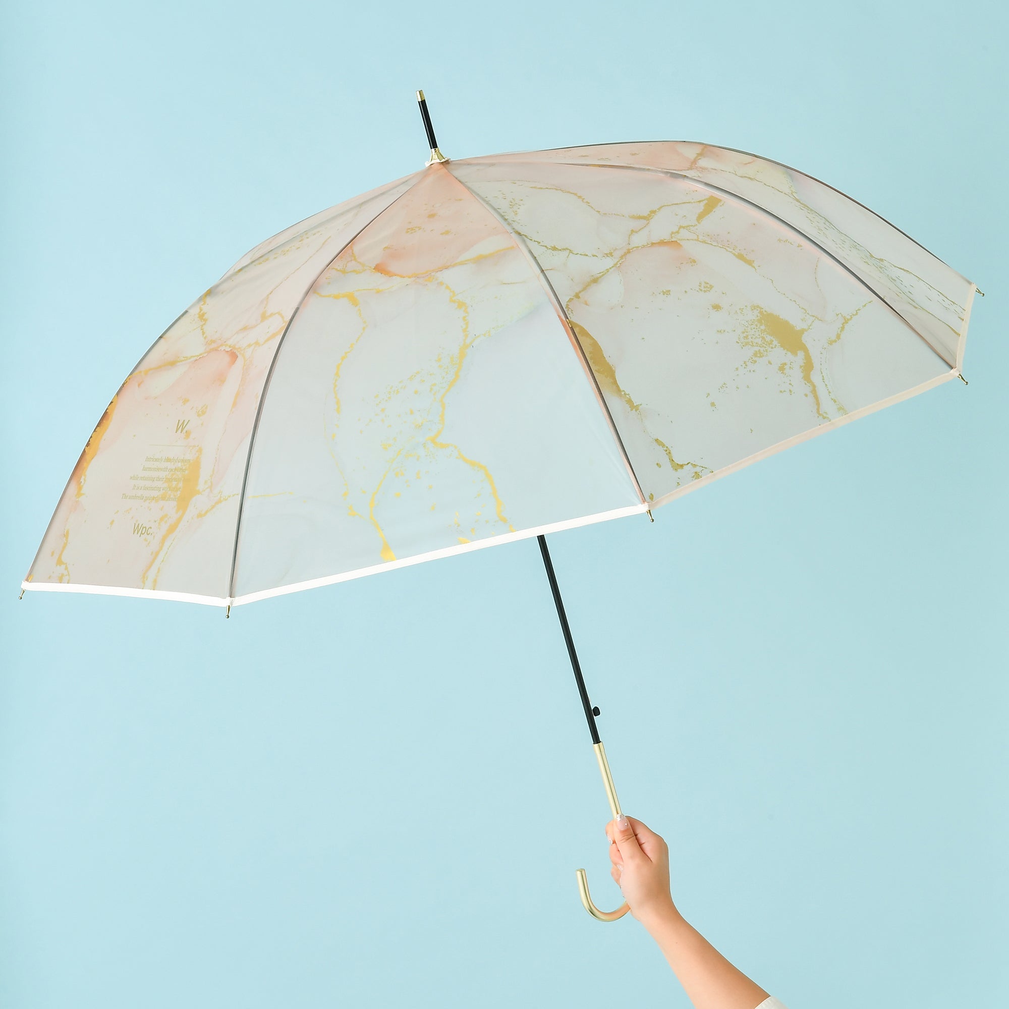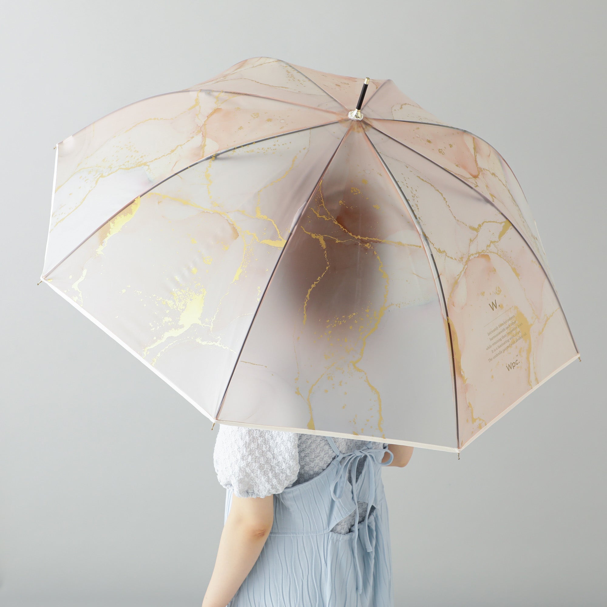 インクアートのデザインが施されたビニール傘です。垂らしたインクから偶然ひろがる模様や彩りが無造作に重なり合い、調和する仕上がりはまるで穏やかな波のよう。ブラウンは派手すぎずコーディネートのアクセントになるカラーです。ワンタッチでさっと開けるジャンプ式を採用しているので、片手でも簡単に開けます。留め具はスナップ式です。直径103cmの大きめサイズだから広範囲をしっかりカバーしたい方におすすめです。持ちやすく華奢なゴールド色のハンドルが手元を美しく見せてくれます。透明感のあるビニール生地に広がるインクアートの幻想的な世界をお楽しみください。