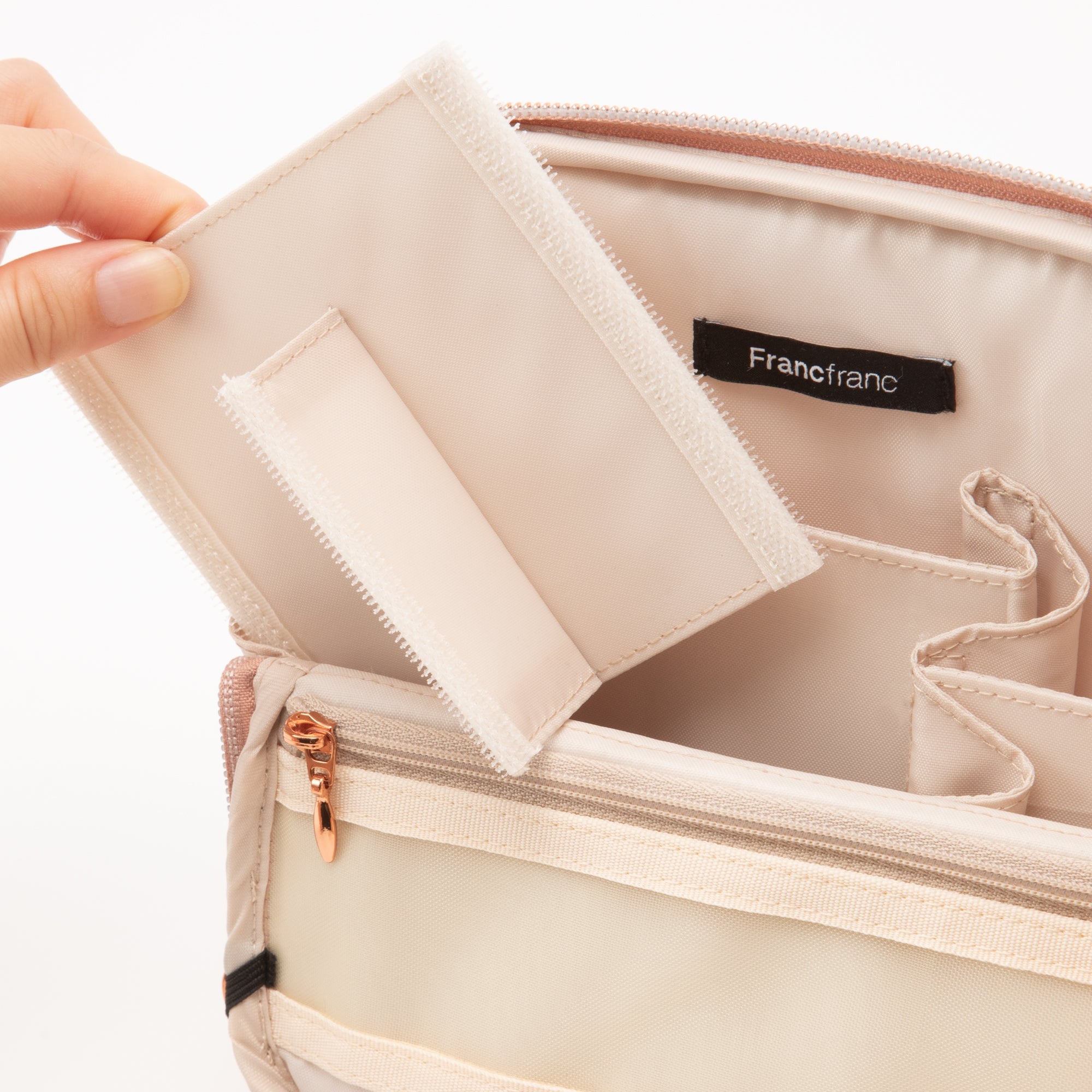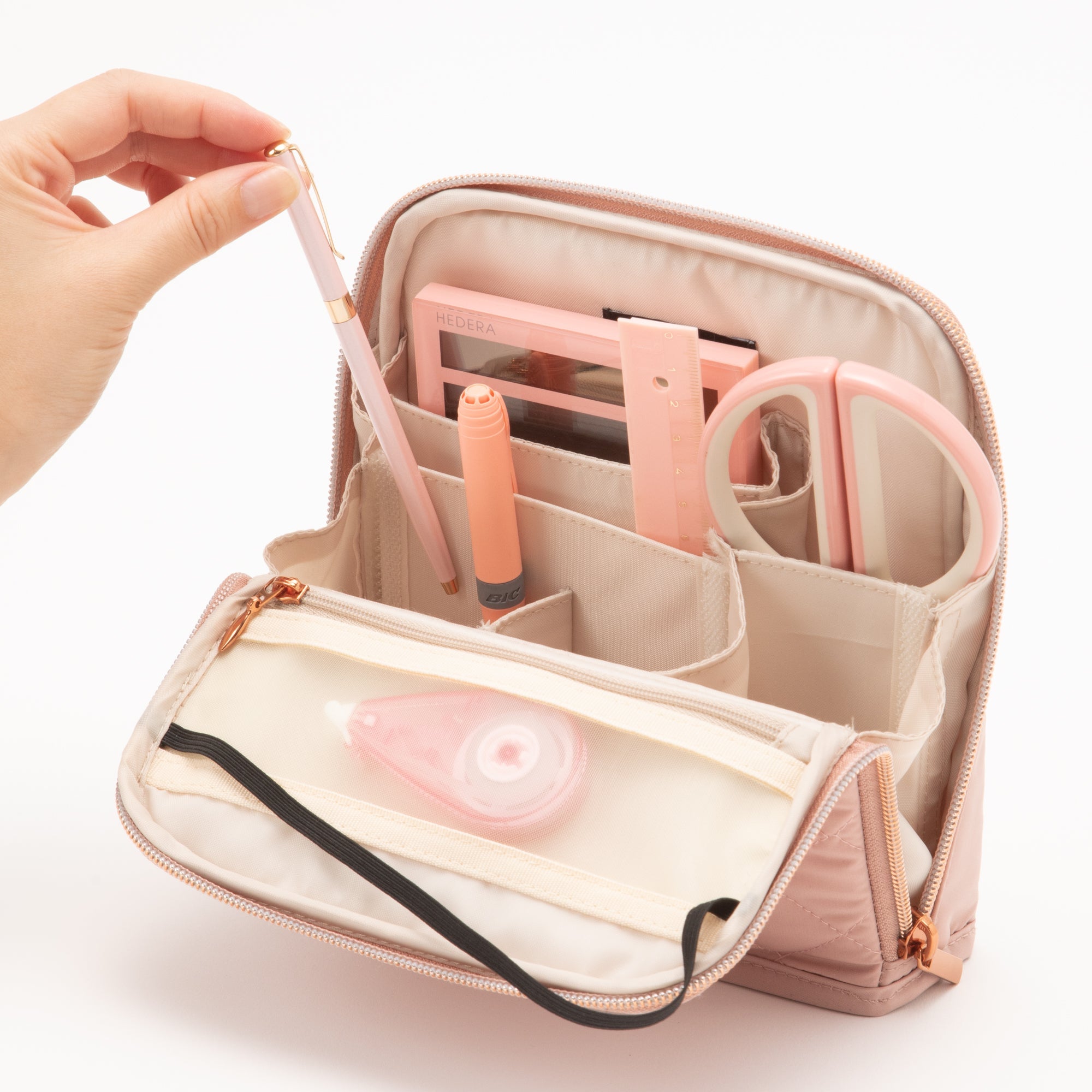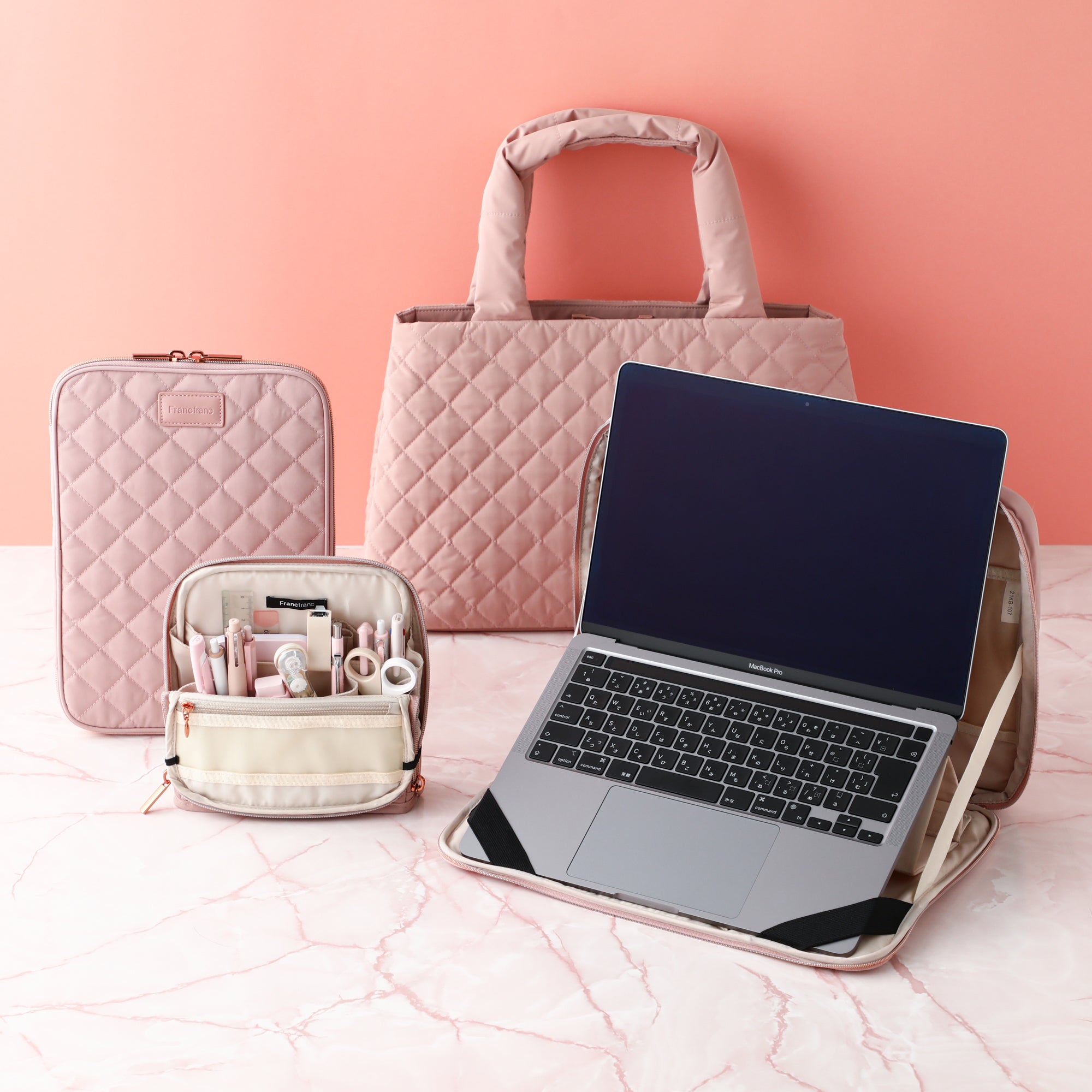 テレワーク生活に便利なツールペンスタンドポーチです。 文房具などをたっぷり収納して持ち歩けるポーチは、フタを開いてゴムで留めるとツールスタンドに早変わり。 可動式の仕切りで自分仕様にカスタマイズもできます。 そのままお部屋に置いておいてもインテリアになじむナチュラルなデザイン。 綿が入ったキルティング素材が大切なアイテムをしっかり守ります。 仕事に必要な道具をまとめて収納できるから、オフィス勤務の日はこのままバッグインバッグとして通勤バッグに入れて持ち出してもOK。 テレワーク生活をより快適にしてくれるシリーズです。