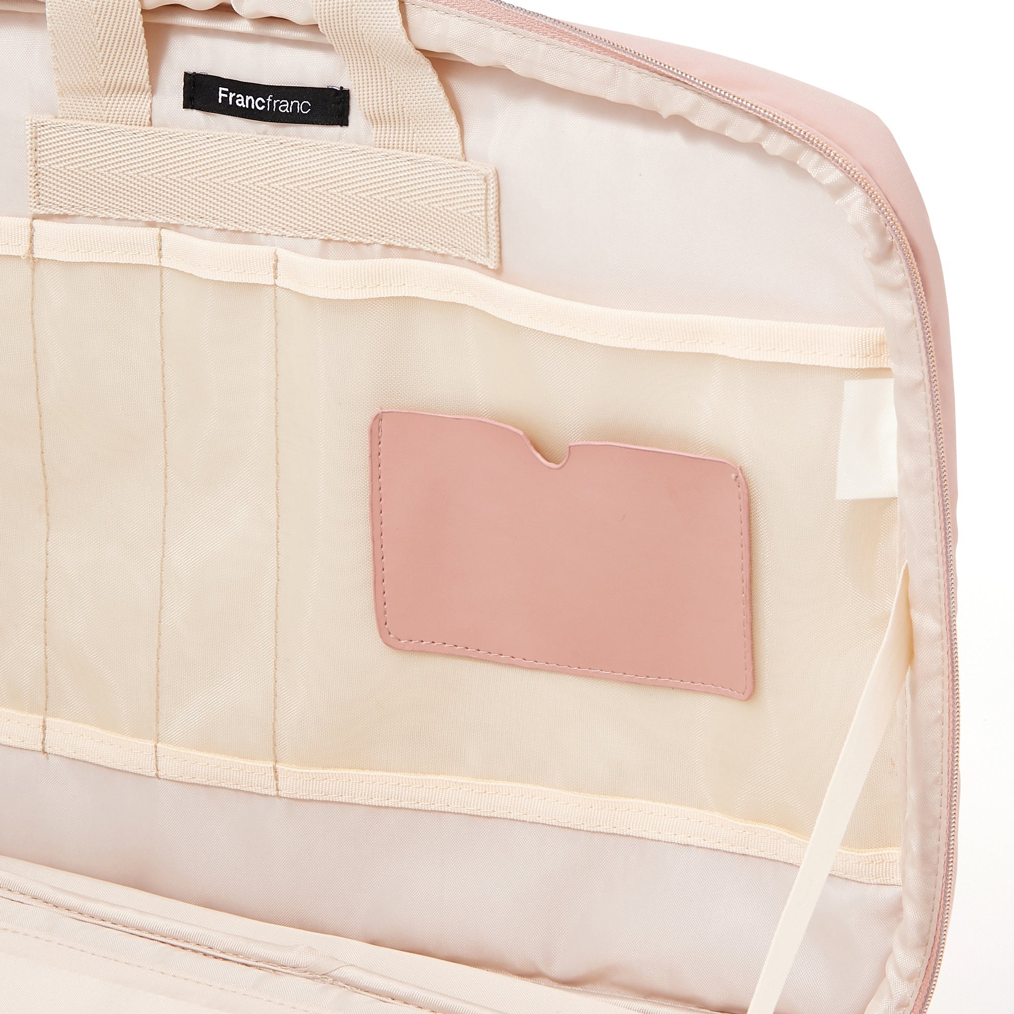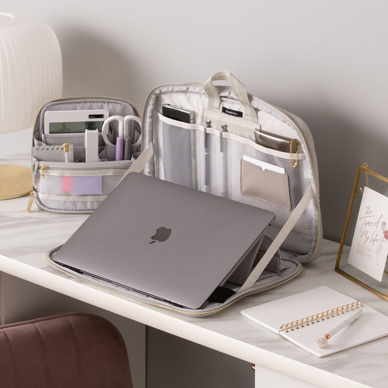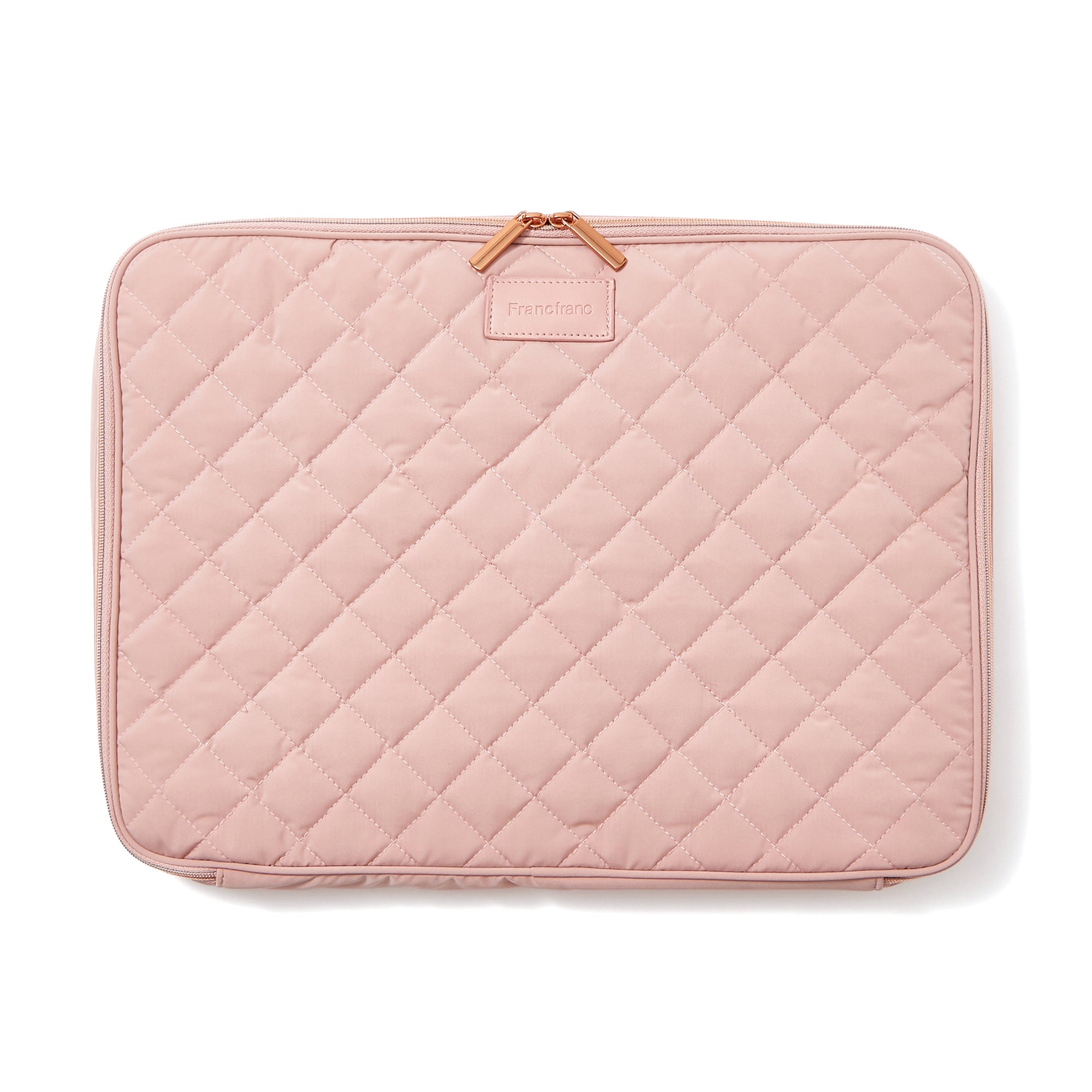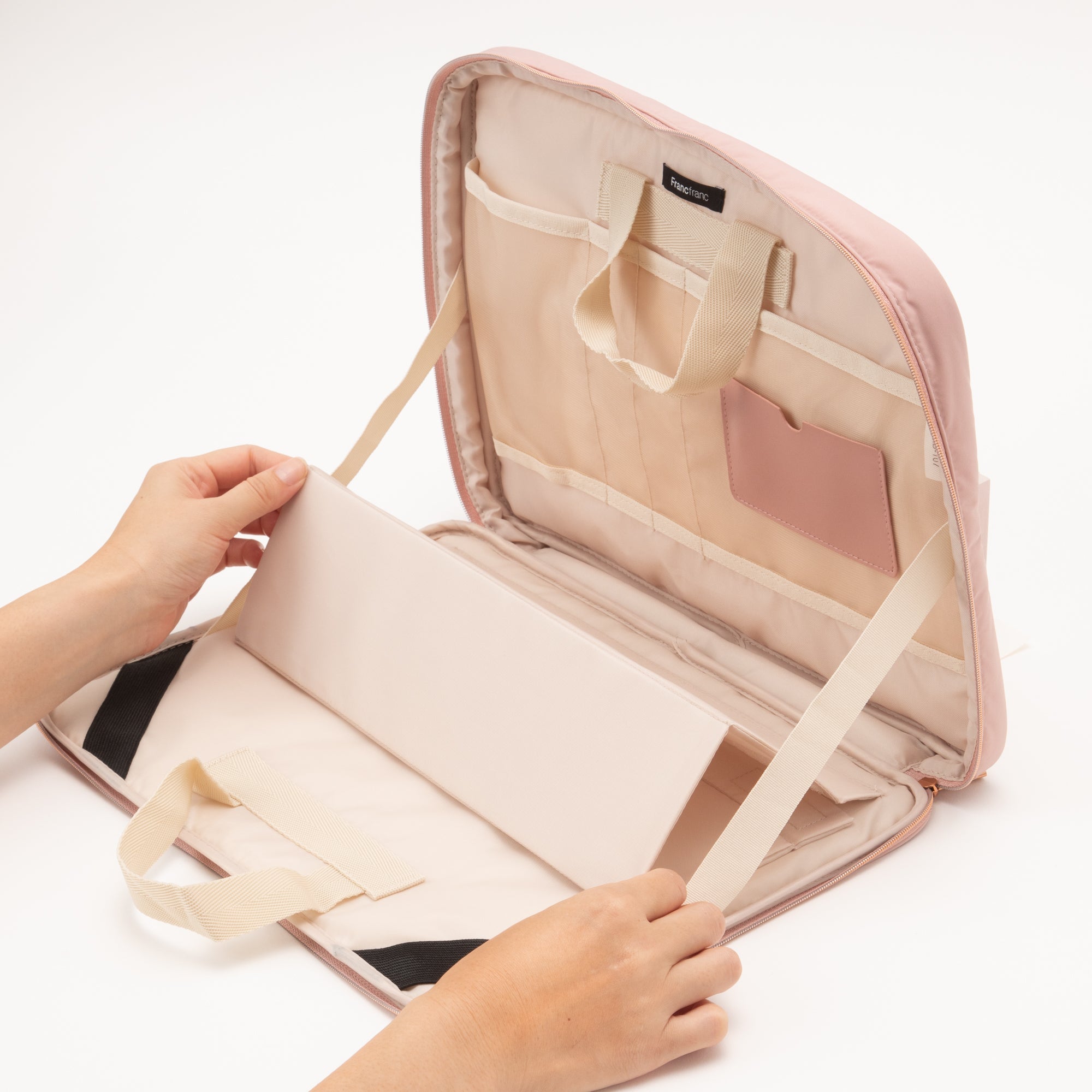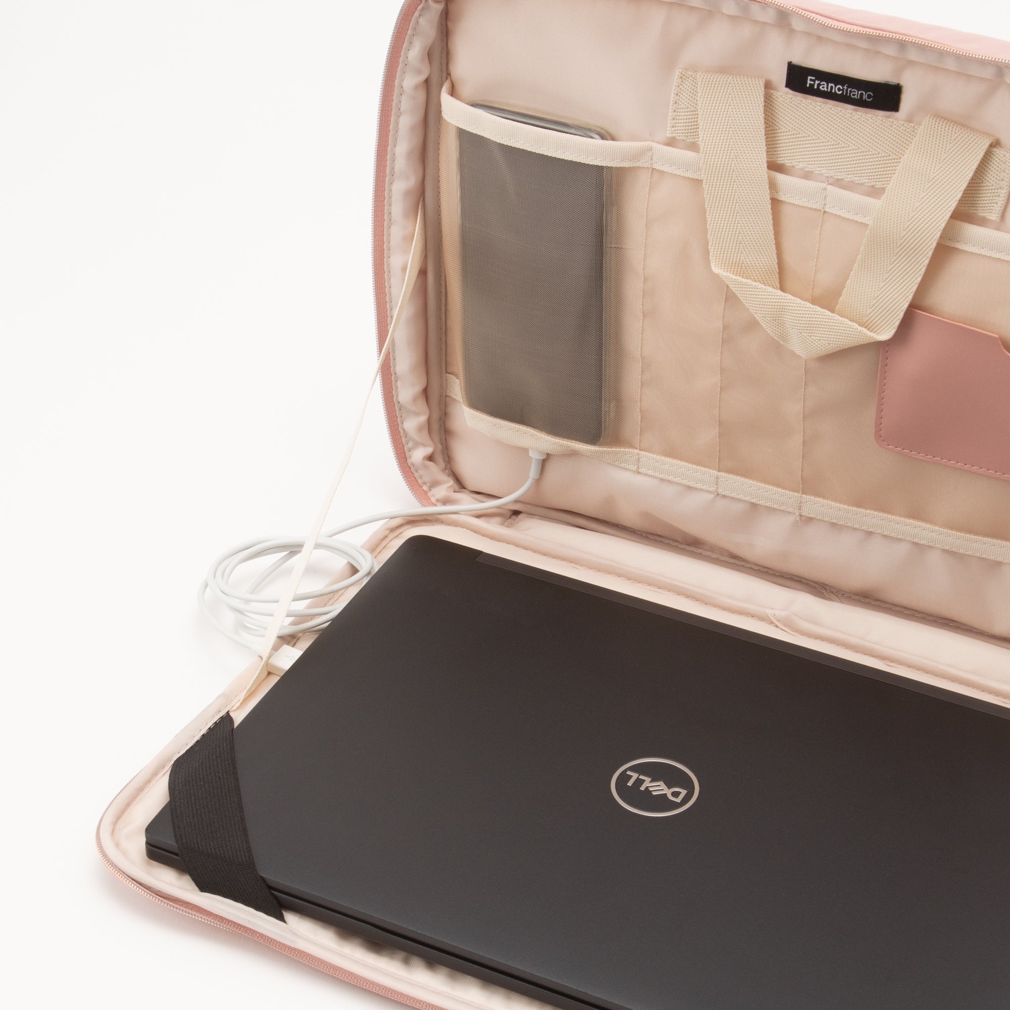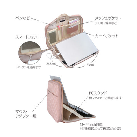 テレワーク生活に便利なPCケースです。 13インチPC対応で内側にPCスタンドが付いているので、ノートパソコンを斜めに立て掛けて使用できます。 収納ポケット付きでツールスタンドとしても活躍します。 そのままお部屋に置いておいてもインテリアになじむナチュラルなデザイン。 綿が入ったキルティング素材が大切なアイテムをしっかり守ります。 オフィス勤務の日はこのままバッグインバッグとして通勤バッグに入れて持ち出してもOK。 テレワーク生活をより快適にしてくれるシリーズです。 ※内寸:約33×24.5cm