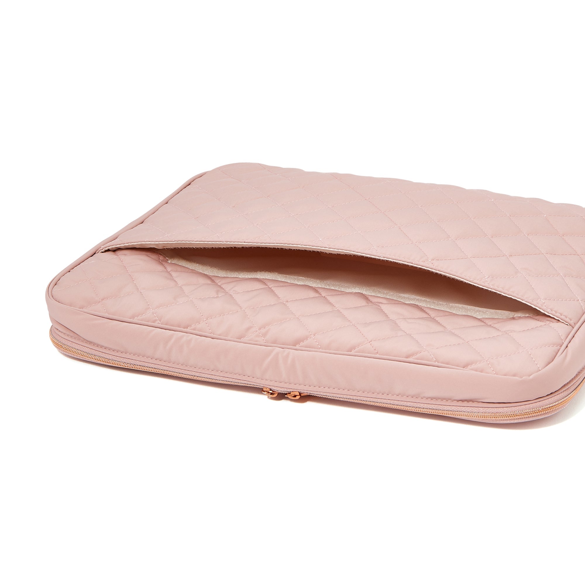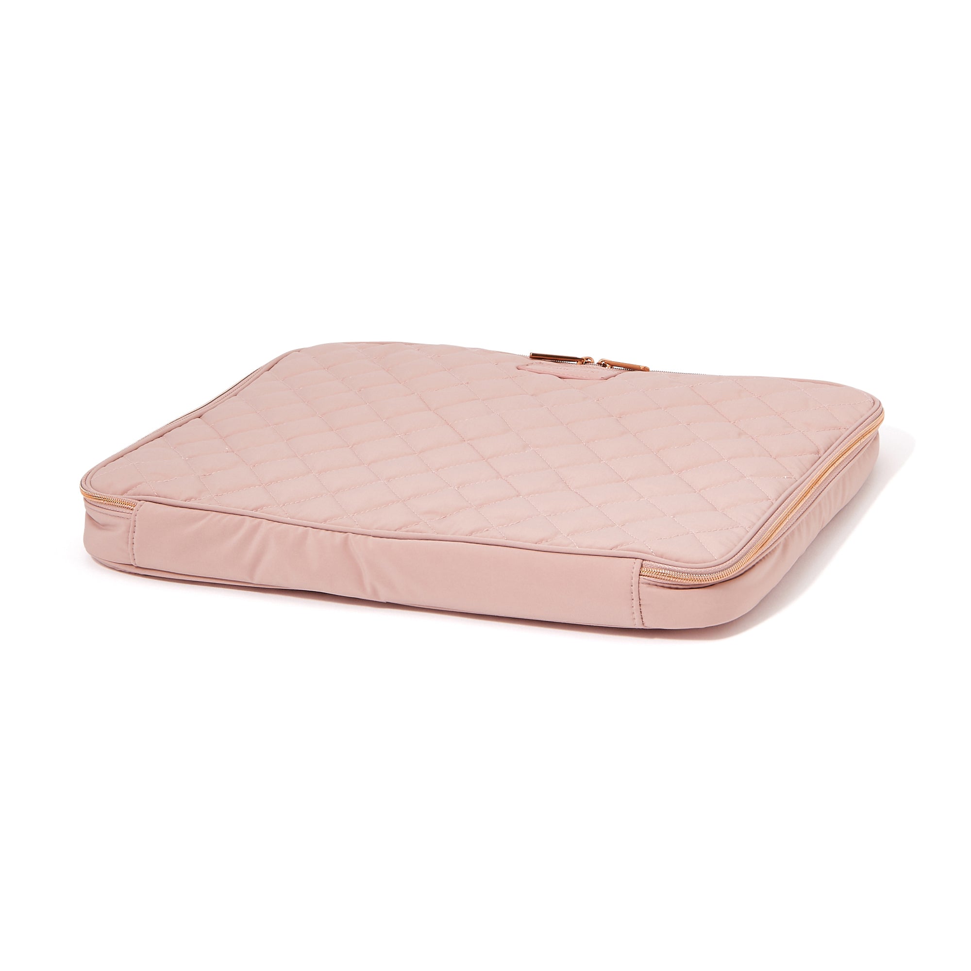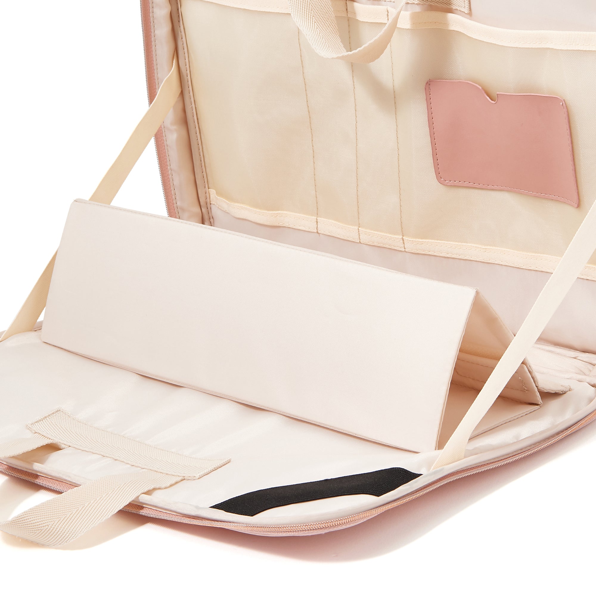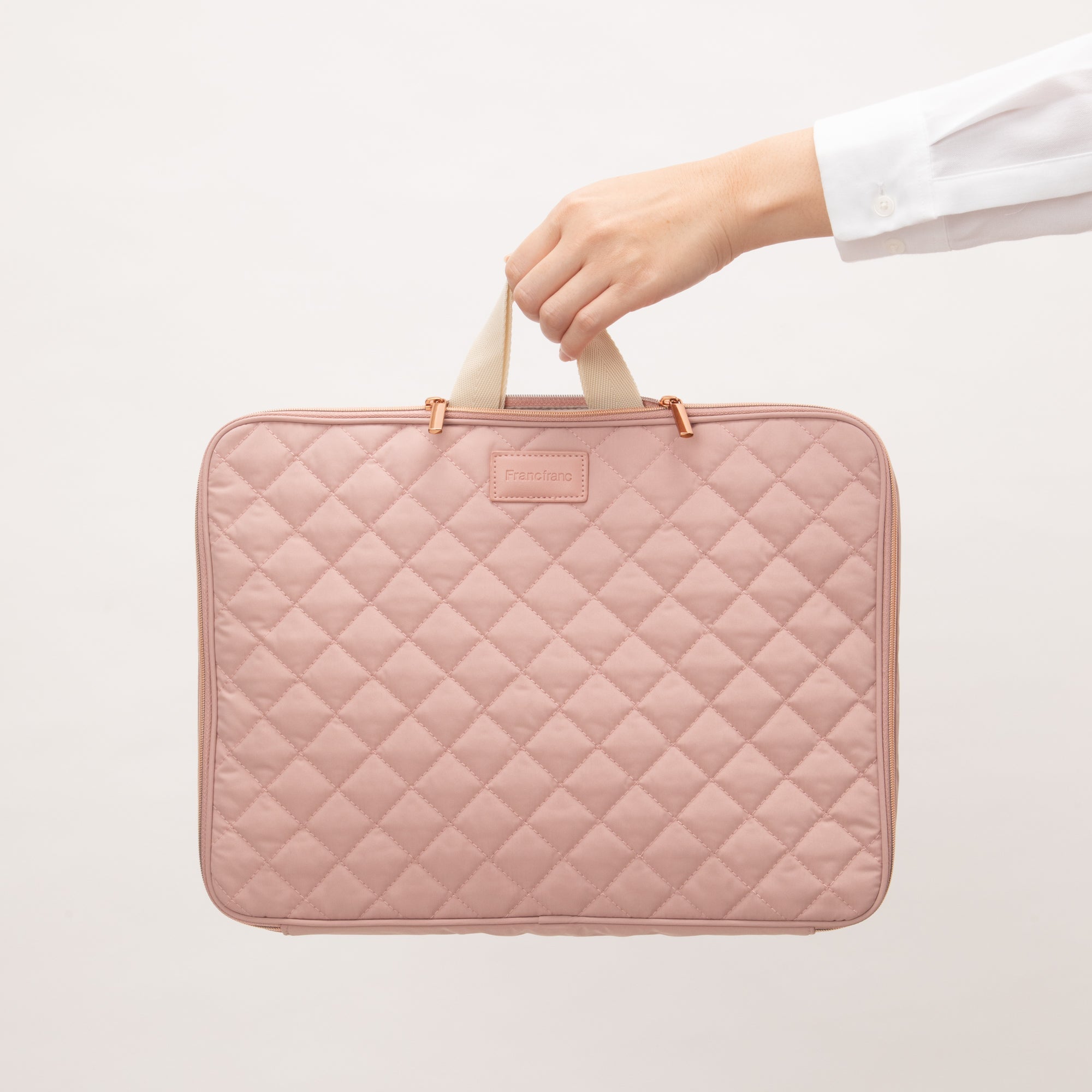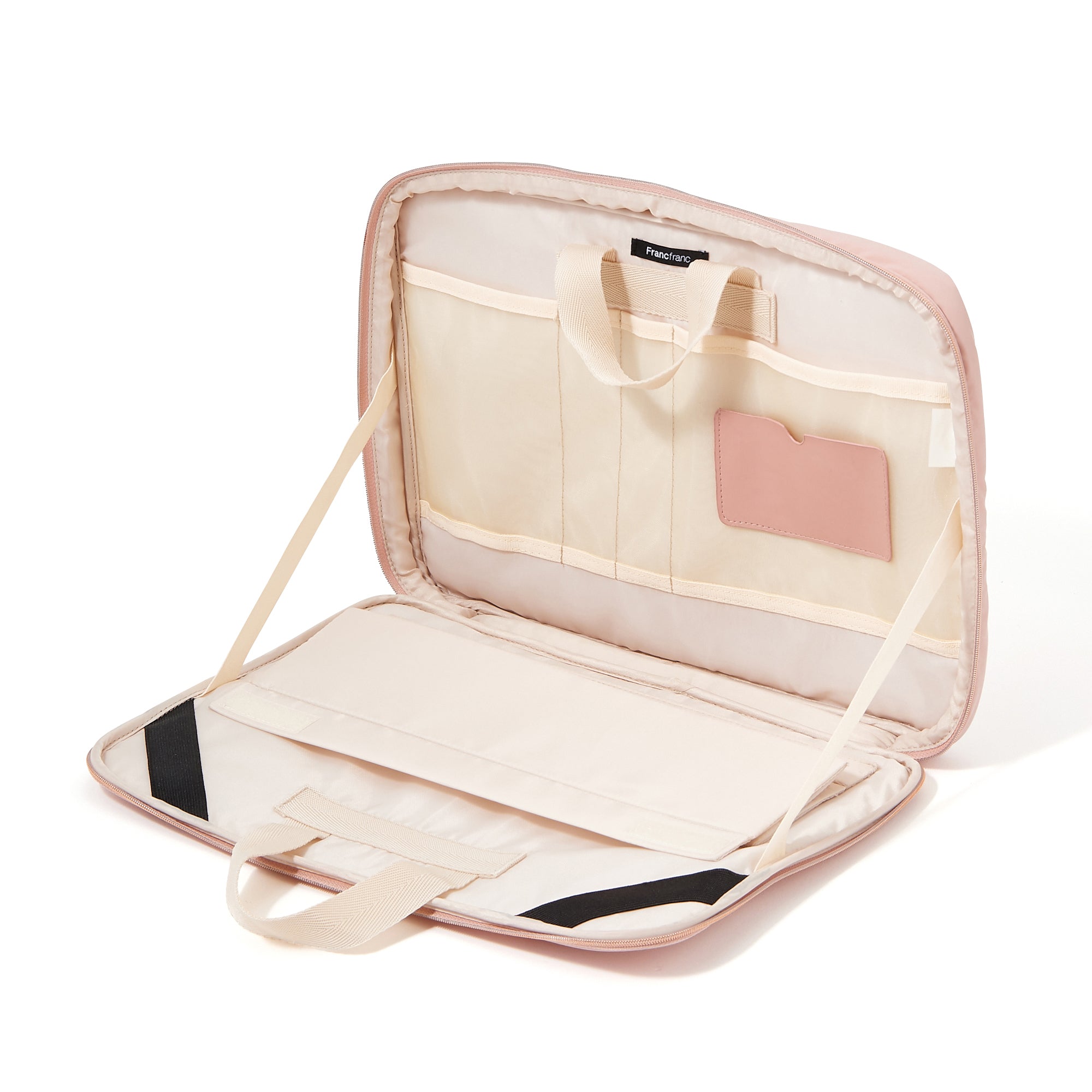 テレワーク生活に便利なPCケースです。 13インチPC対応で内側にPCスタンドが付いているので、ノートパソコンを斜めに立て掛けて使用できます。 収納ポケット付きでツールスタンドとしても活躍します。 そのままお部屋に置いておいてもインテリアになじむナチュラルなデザイン。 綿が入ったキルティング素材が大切なアイテムをしっかり守ります。 オフィス勤務の日はこのままバッグインバッグとして通勤バッグに入れて持ち出してもOK。 テレワーク生活をより快適にしてくれるシリーズです。 ※内寸:約33×24.5cm