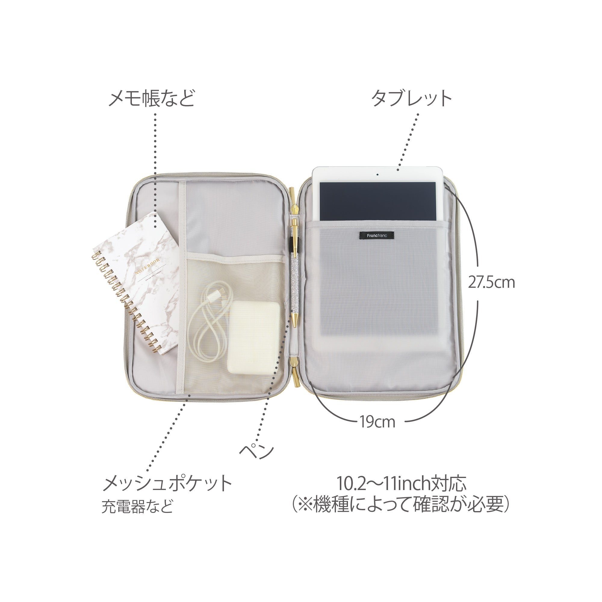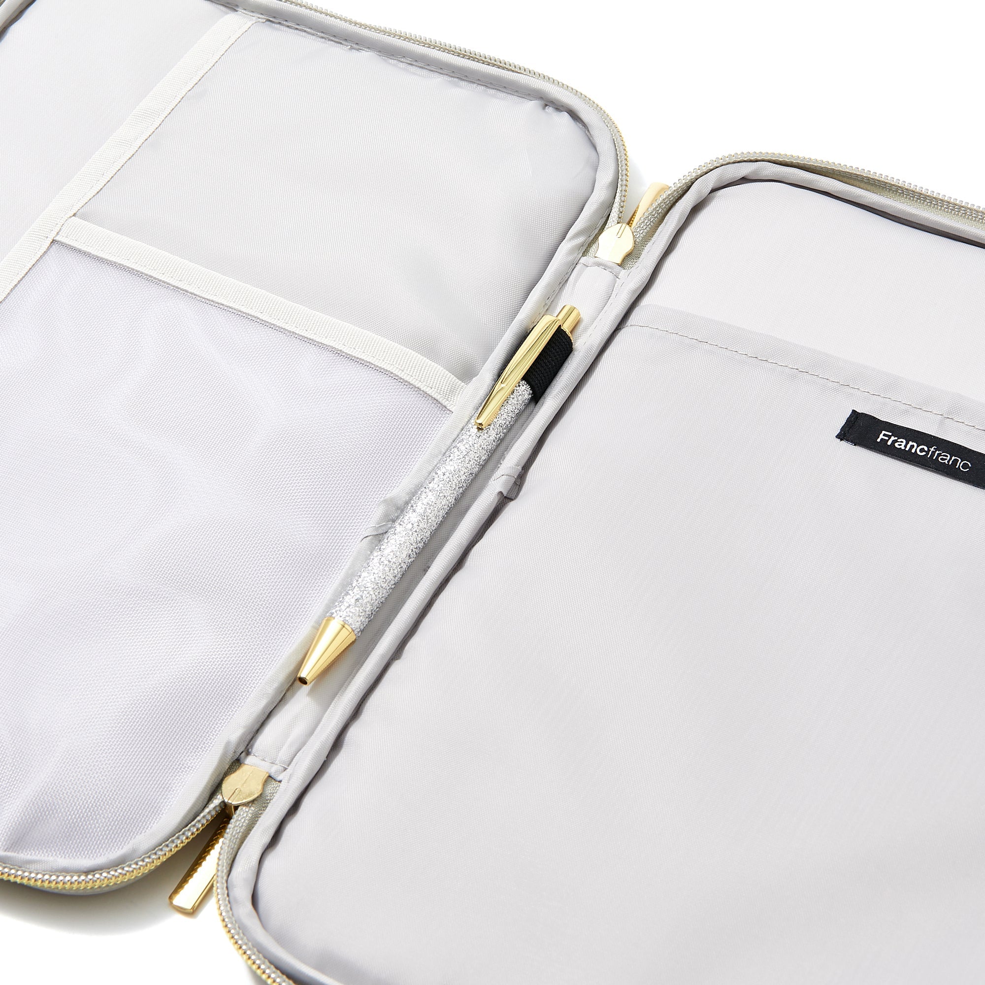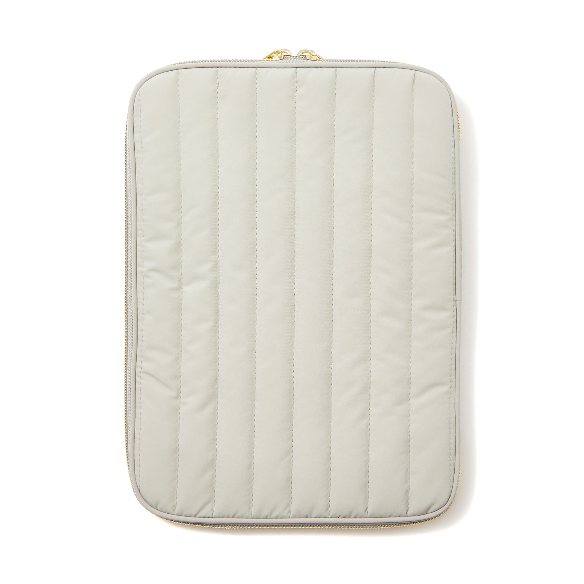 テレワーク生活に便利なタブレットケースです。 10.2~11インチ対応、ペンホルダーとポケット2つ付きで仕事道具が使いやすく収納できます。 そのままお部屋に置いておいてもインテリアになじむナチュラルなデザイン。 綿が入ったキルティング素材はクッション性があり、大切なアイテムをしっかり守ります。 このままバッグインバッグとして通勤バッグに入れてもOKです。 ゴールドの金具とロゴがさりげないポイントです。