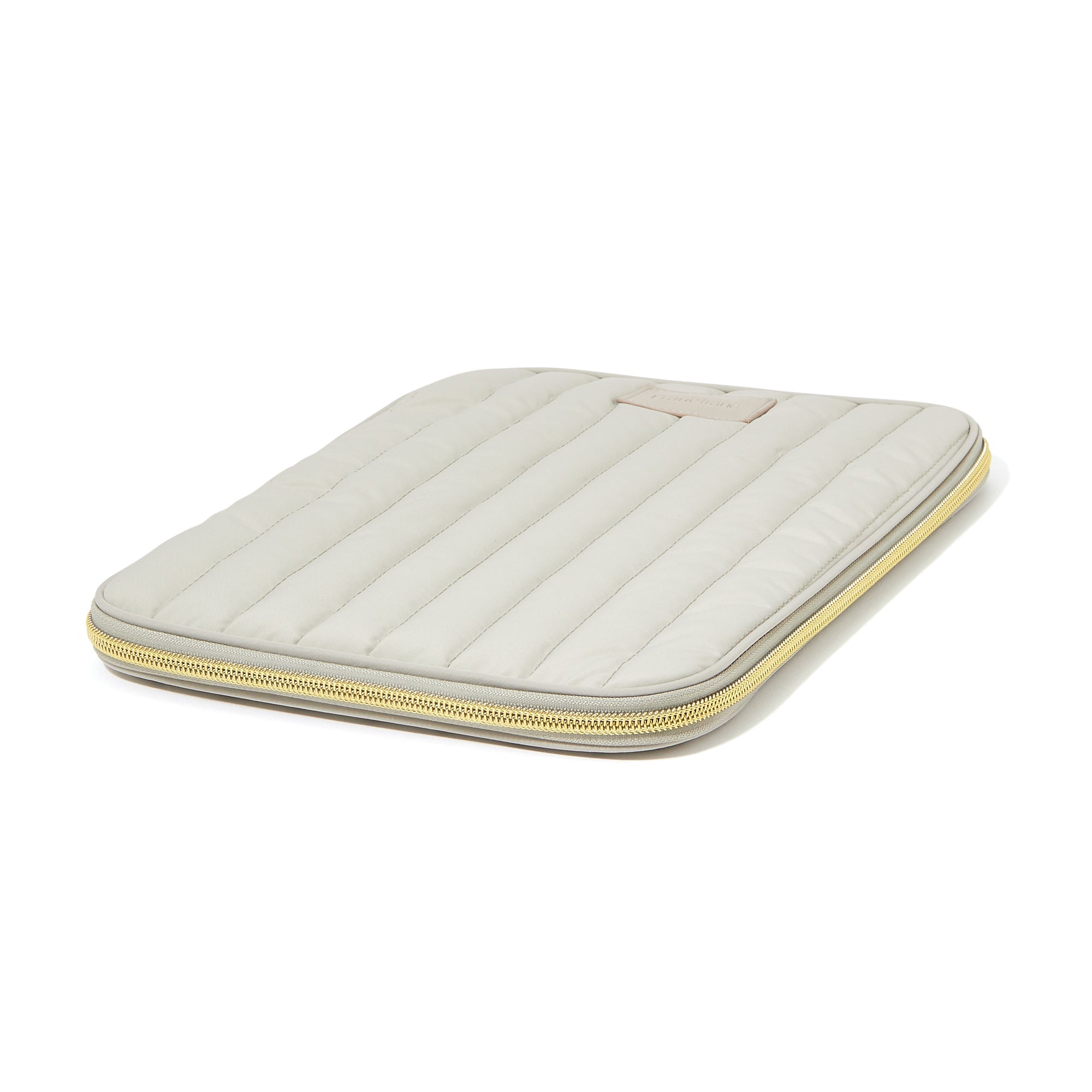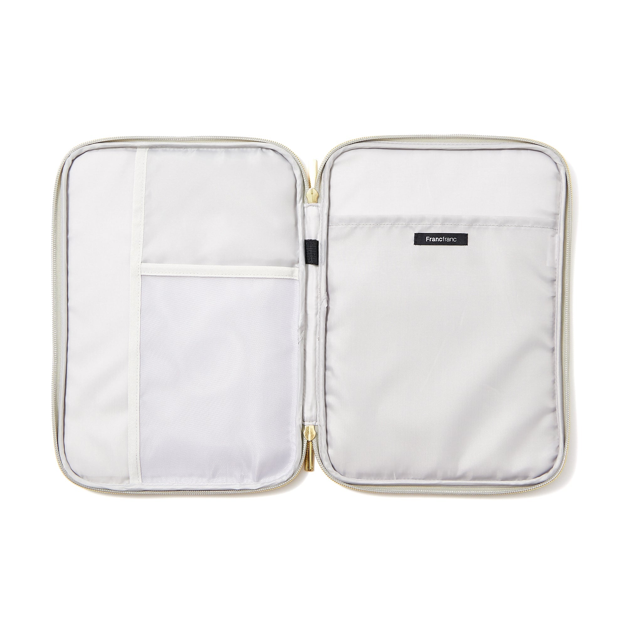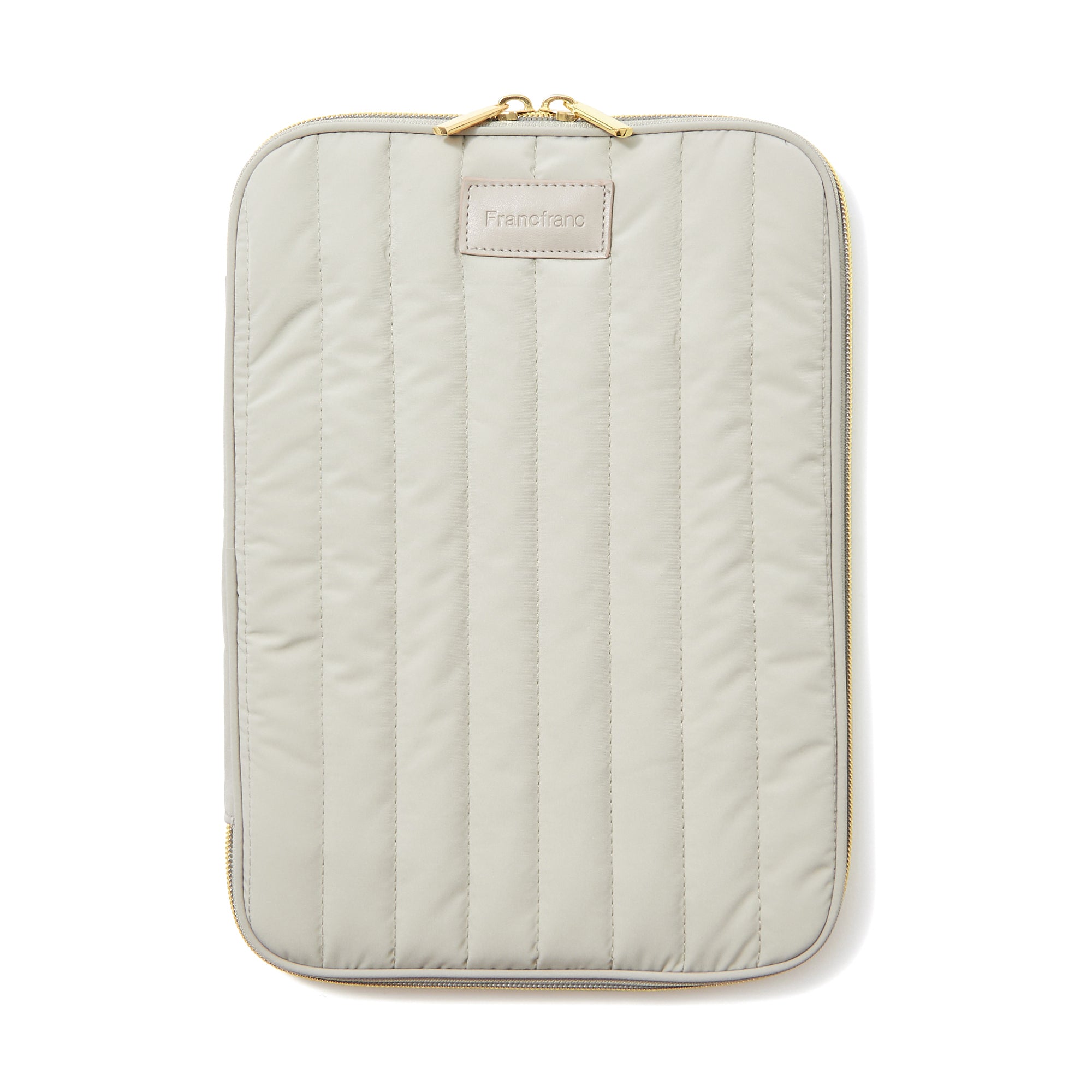 テレワーク生活に便利なタブレットケースです。 10.2~11インチ対応、ペンホルダーとポケット2つ付きで仕事道具が使いやすく収納できます。 そのままお部屋に置いておいてもインテリアになじむナチュラルなデザイン。 綿が入ったキルティング素材はクッション性があり、大切なアイテムをしっかり守ります。 このままバッグインバッグとして通勤バッグに入れてもOKです。 ゴールドの金具とロゴがさりげないポイントです。