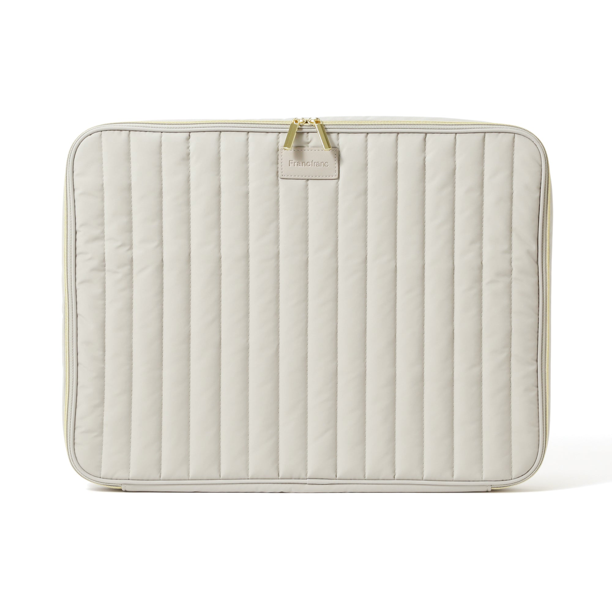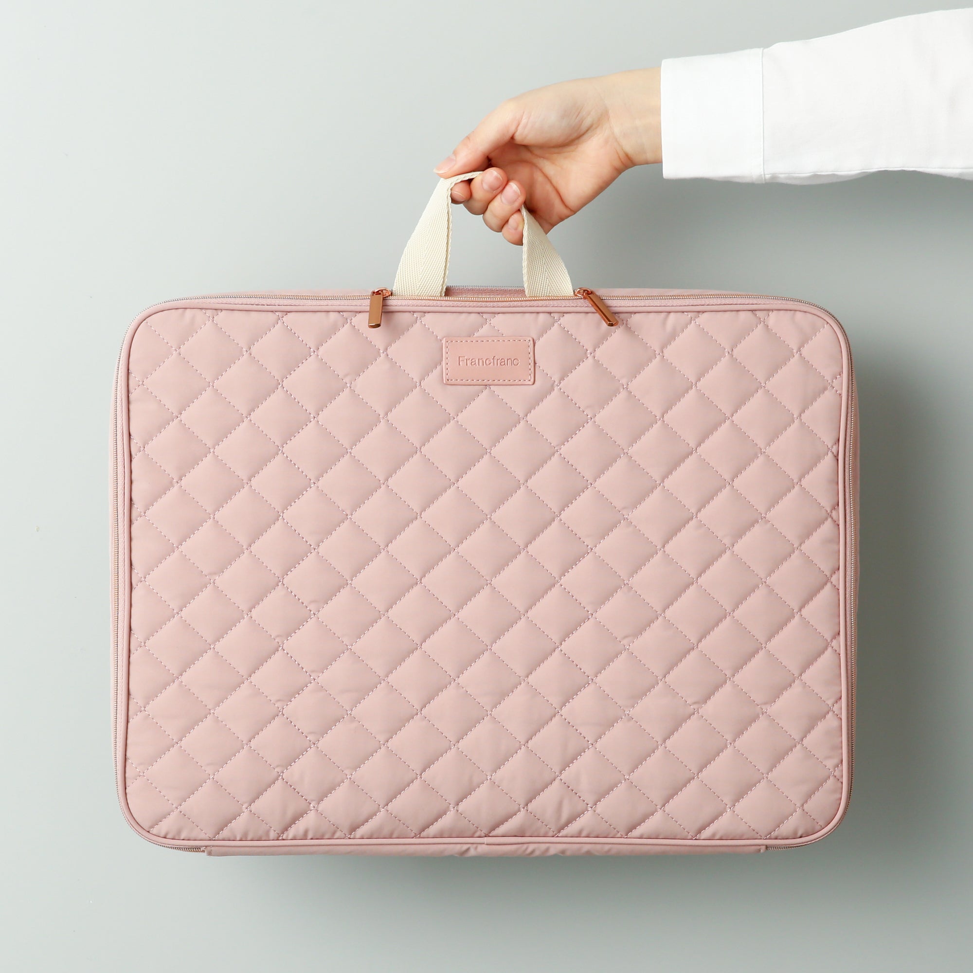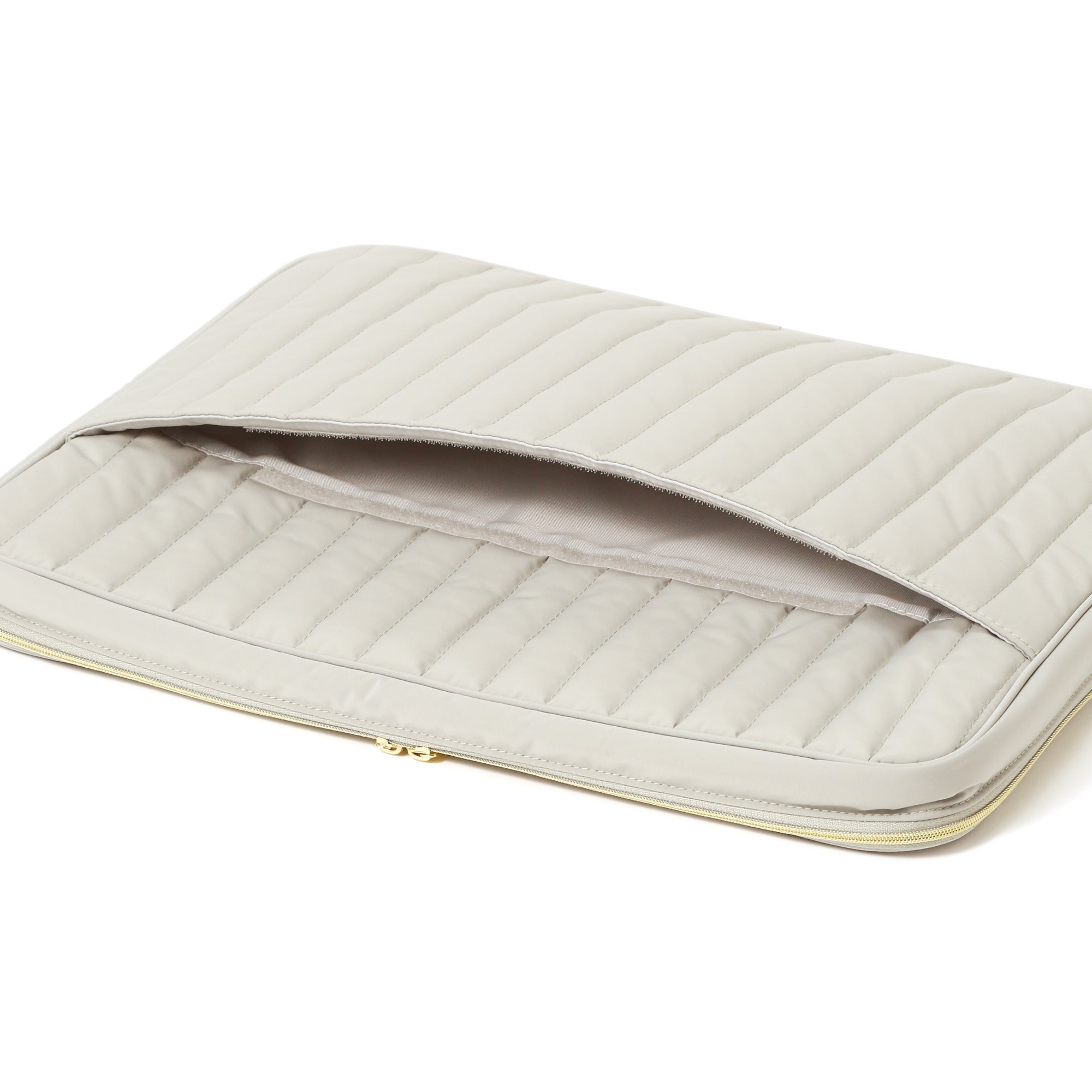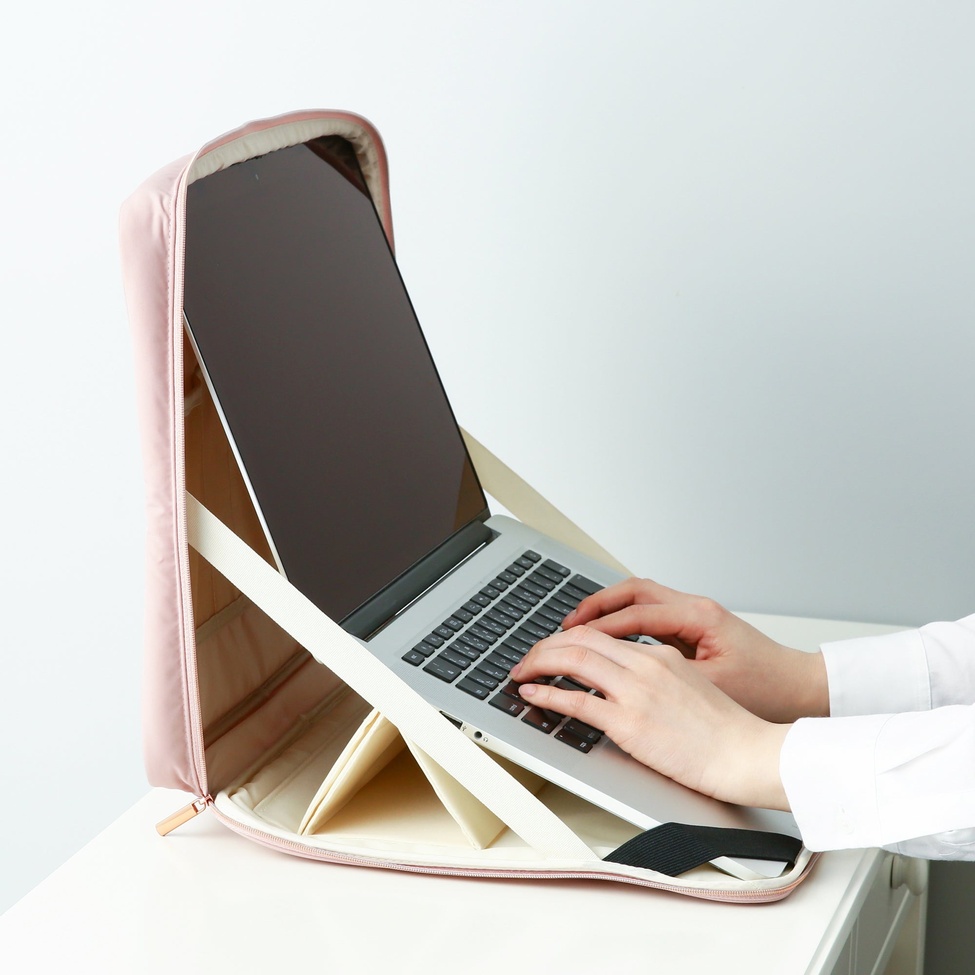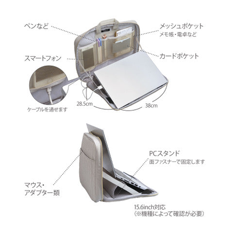 テレワーク生活に便利なノートパソコンケースです。 15~16インチのPC対応で内側にPCスタンドが付いているので、ノートパソコンを斜めに立て掛けて使用できます。 収納ポケット付きで、ツールスタンドとしても活躍します。 そのままお部屋に置いておいてもインテリアになじむナチュラルで可愛らしいデザイン。 綿が入ったキルティング素材が大切なアイテムをしっかり守ります。 オフィス勤務の日はこのままバッグインバッグとして通勤バッグに入れて持ち出してもOK。 テレワーク生活をより快適にしてくれるシリーズです。 ※内寸:約28.5×約38cm