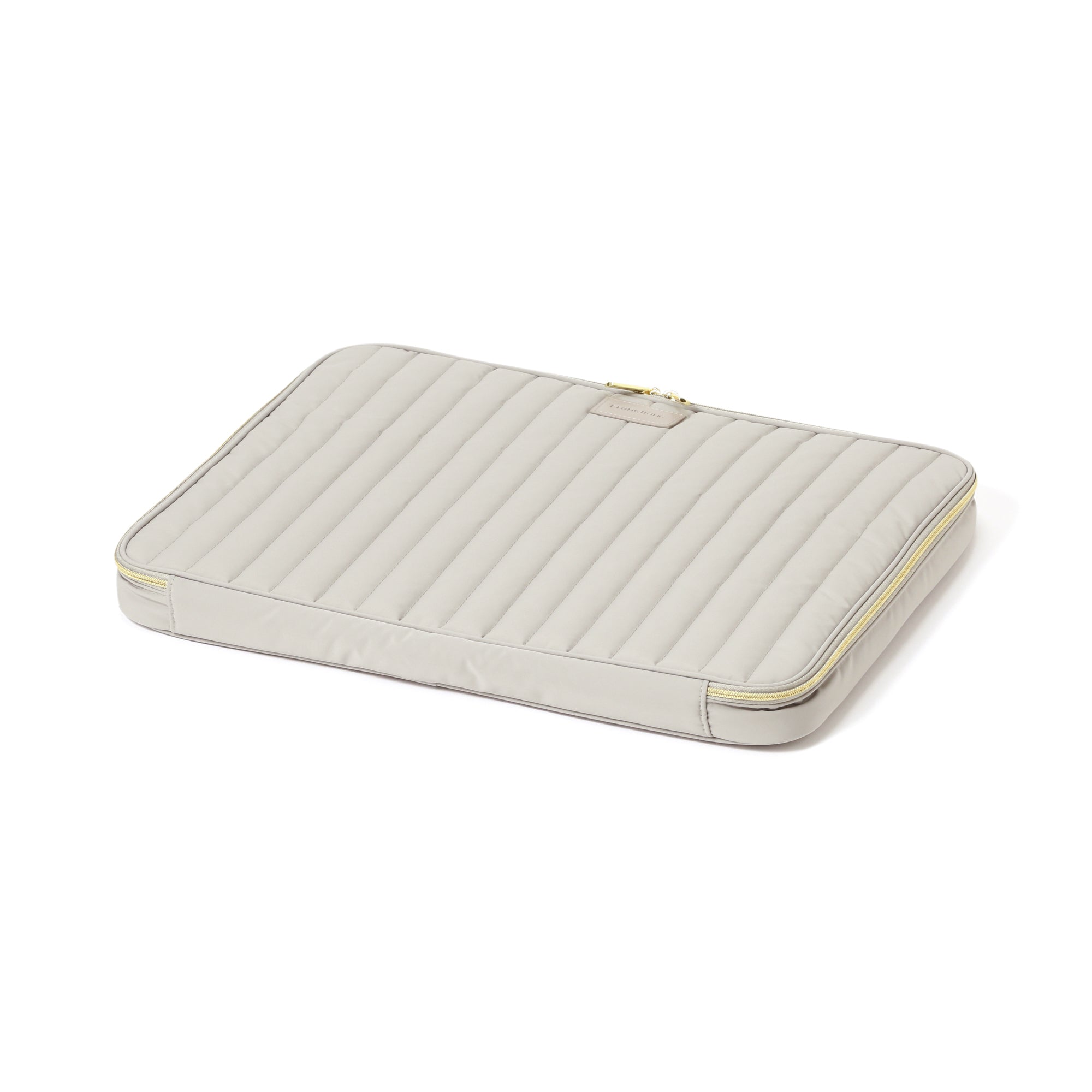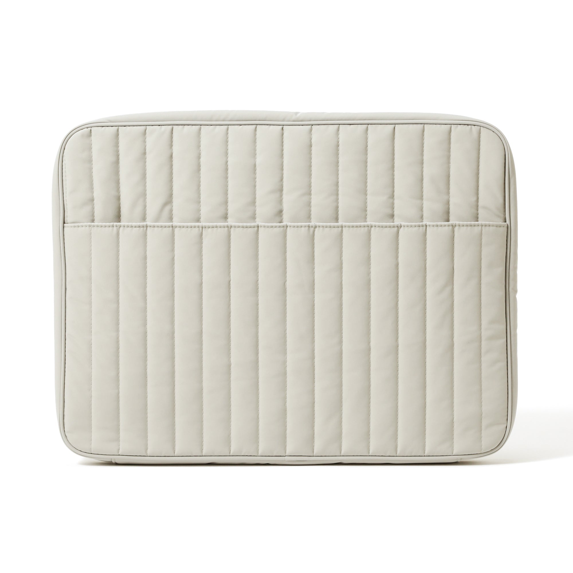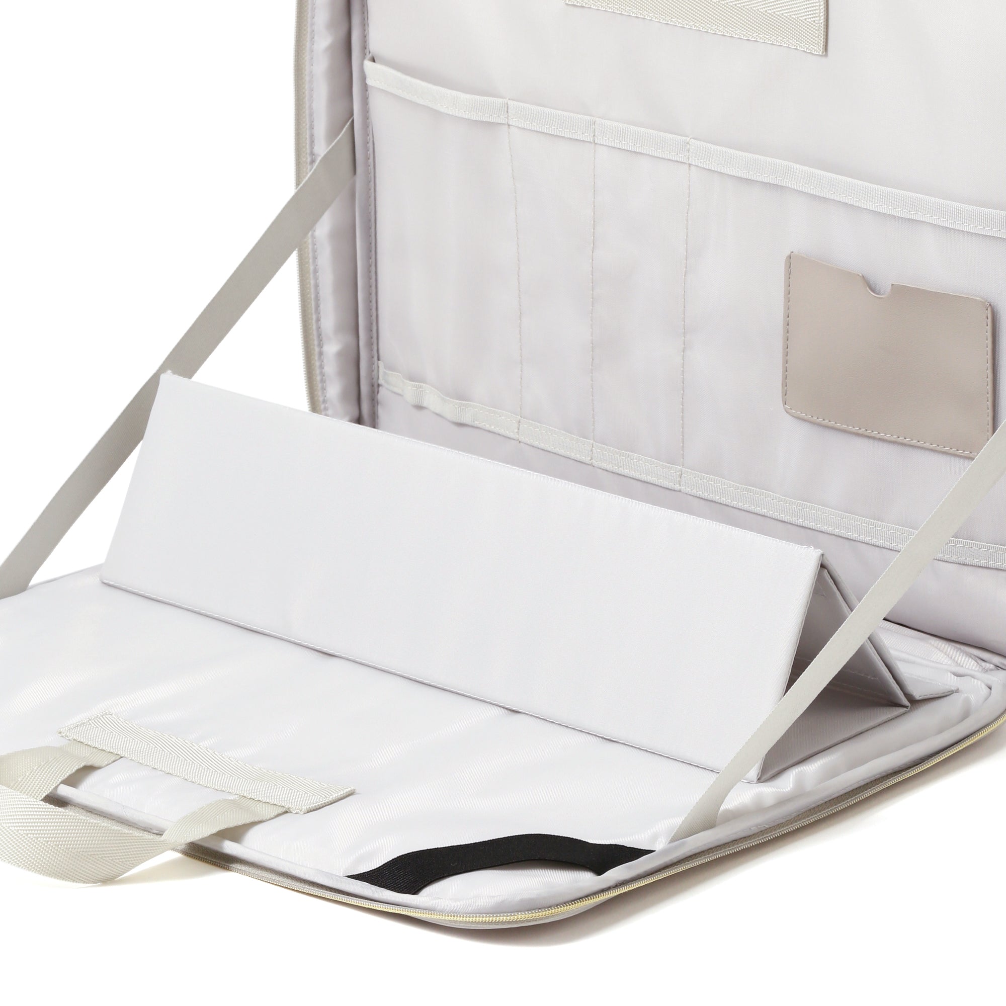 テレワーク生活に便利なノートパソコンケースです。 15~16インチのPC対応で内側にPCスタンドが付いているので、ノートパソコンを斜めに立て掛けて使用できます。 収納ポケット付きで、ツールスタンドとしても活躍します。 そのままお部屋に置いておいてもインテリアになじむナチュラルで可愛らしいデザイン。 綿が入ったキルティング素材が大切なアイテムをしっかり守ります。 オフィス勤務の日はこのままバッグインバッグとして通勤バッグに入れて持ち出してもOK。 テレワーク生活をより快適にしてくれるシリーズです。 ※内寸:約28.5×約38cm