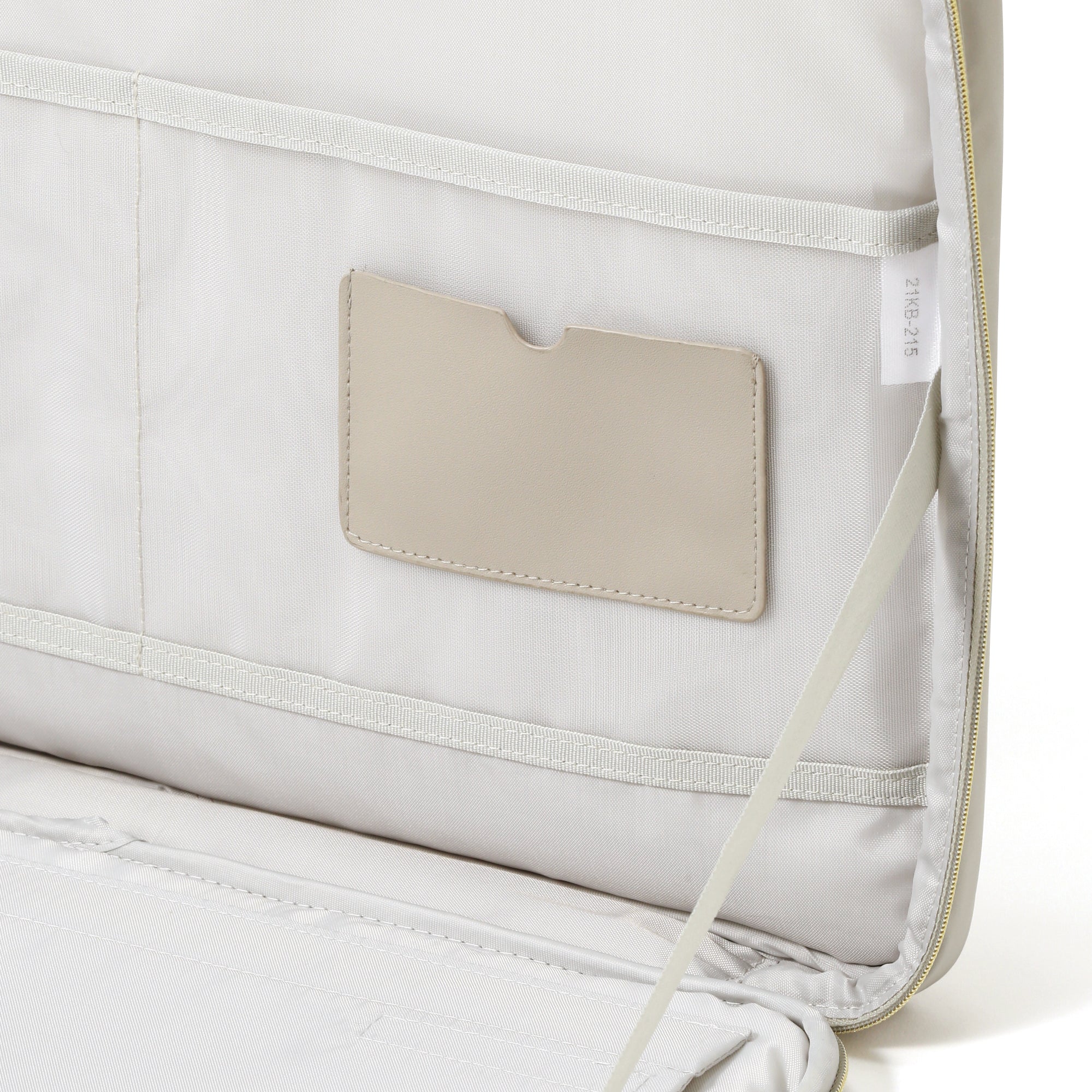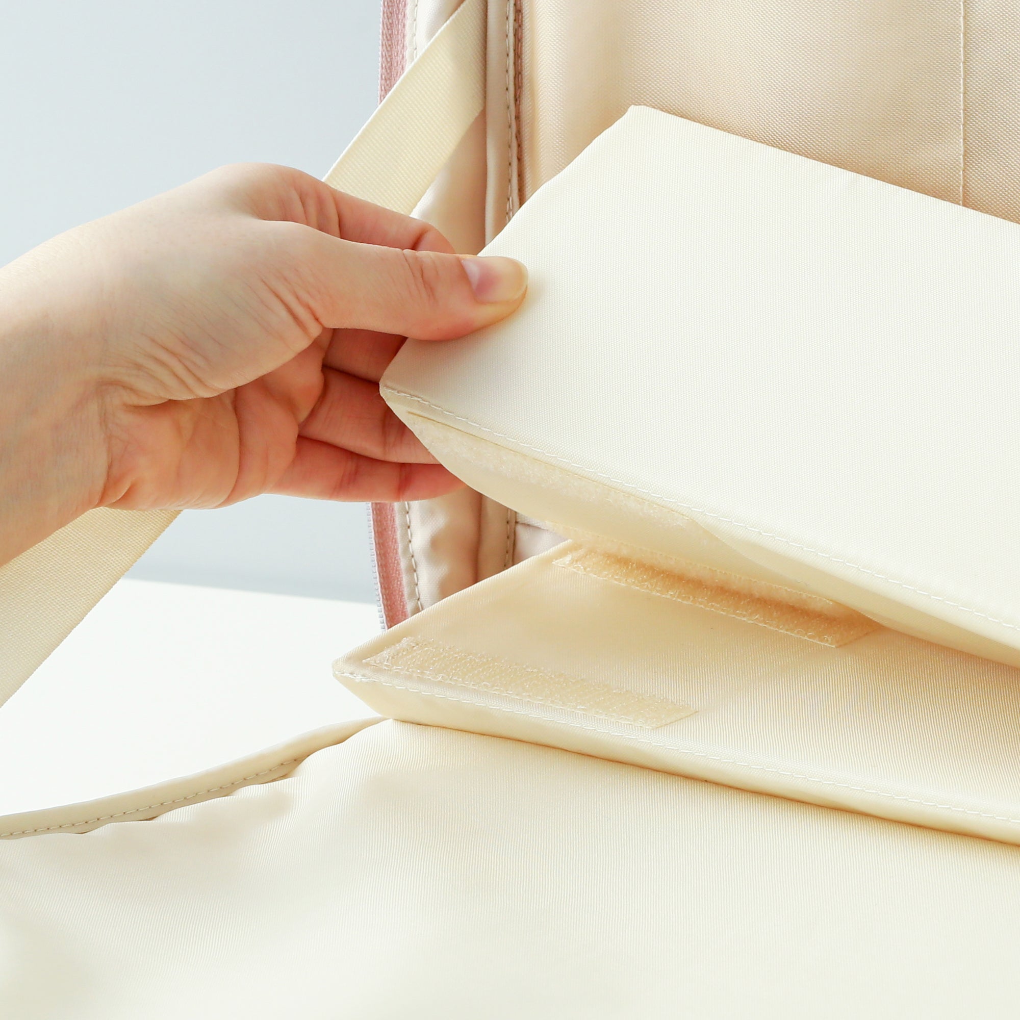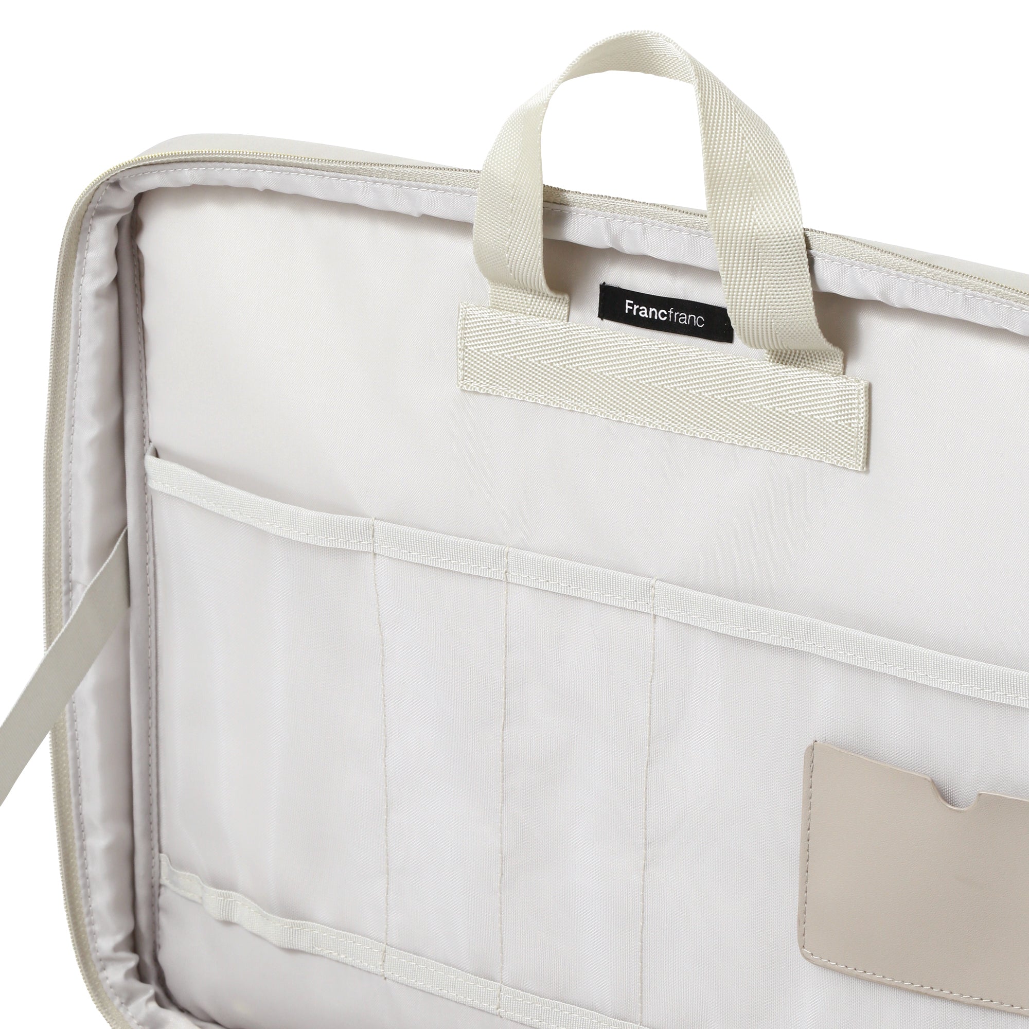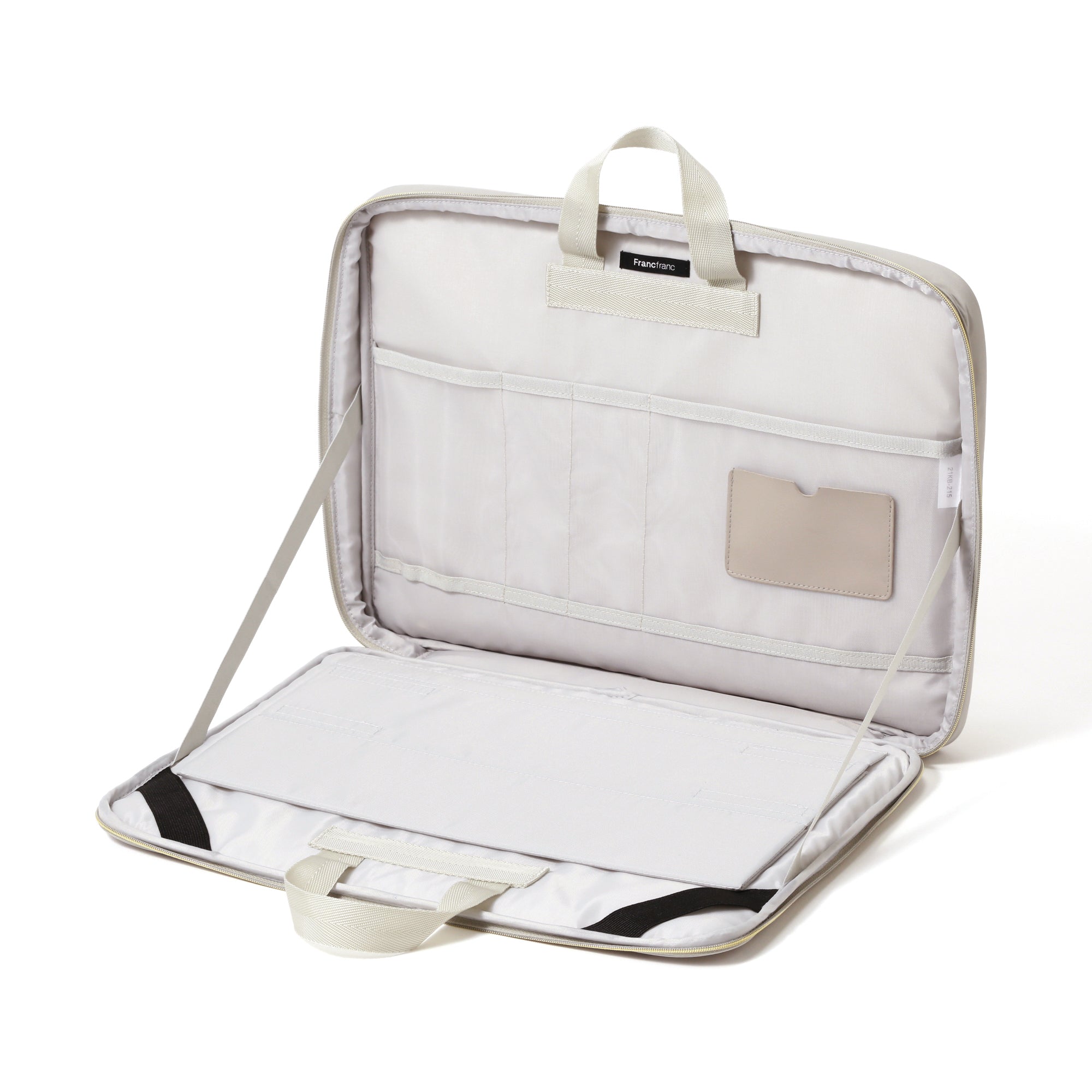 テレワーク生活に便利なノートパソコンケースです。 15~16インチのPC対応で内側にPCスタンドが付いているので、ノートパソコンを斜めに立て掛けて使用できます。 収納ポケット付きで、ツールスタンドとしても活躍します。 そのままお部屋に置いておいてもインテリアになじむナチュラルで可愛らしいデザイン。 綿が入ったキルティング素材が大切なアイテムをしっかり守ります。 オフィス勤務の日はこのままバッグインバッグとして通勤バッグに入れて持ち出してもOK。 テレワーク生活をより快適にしてくれるシリーズです。 ※内寸:約28.5×約38cm