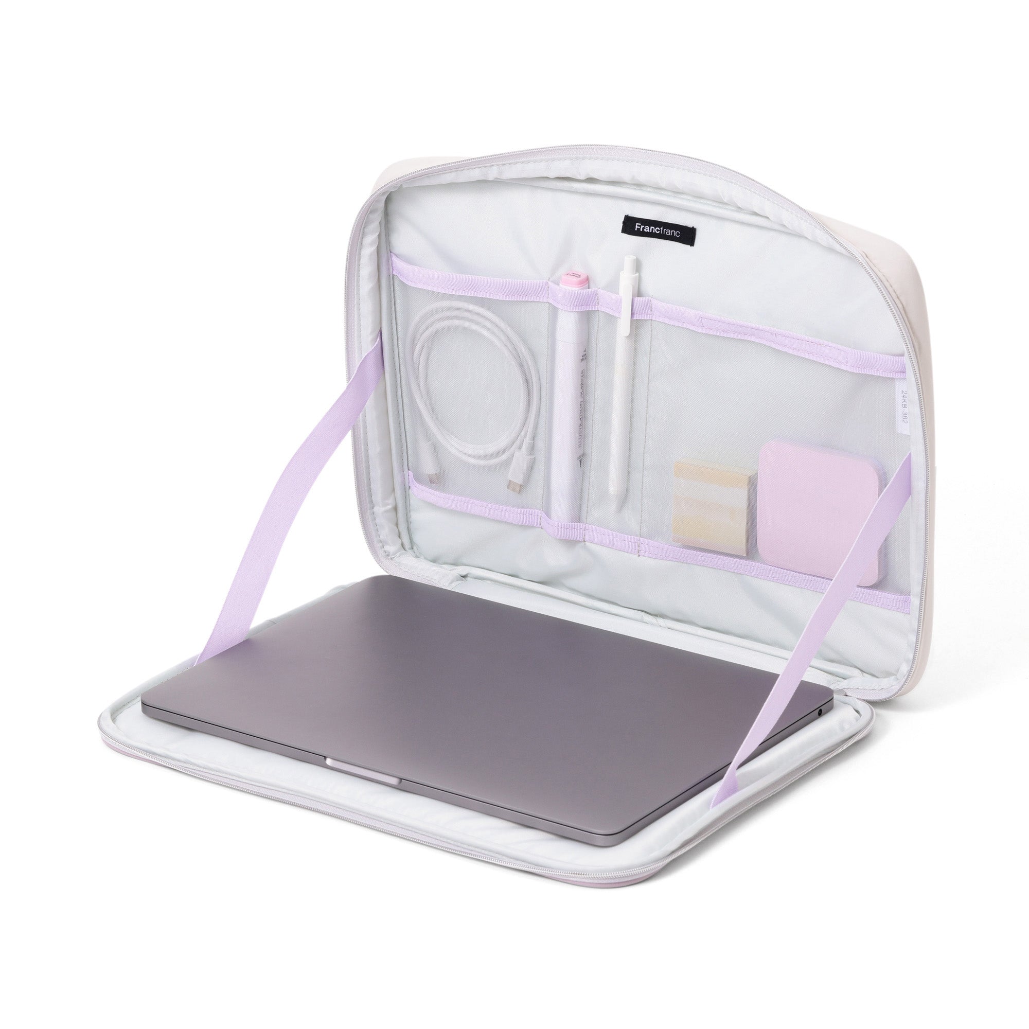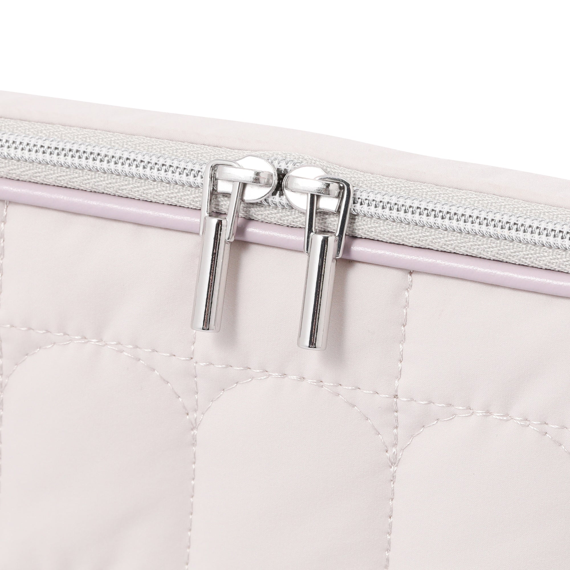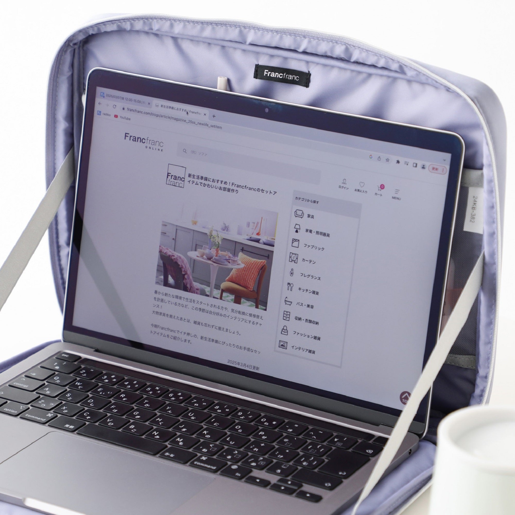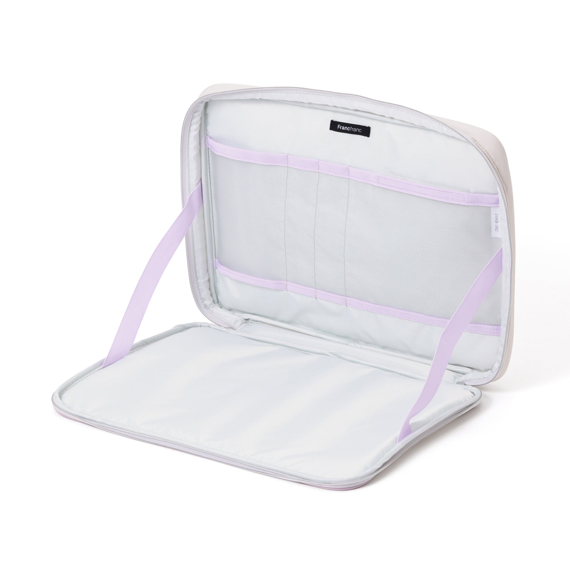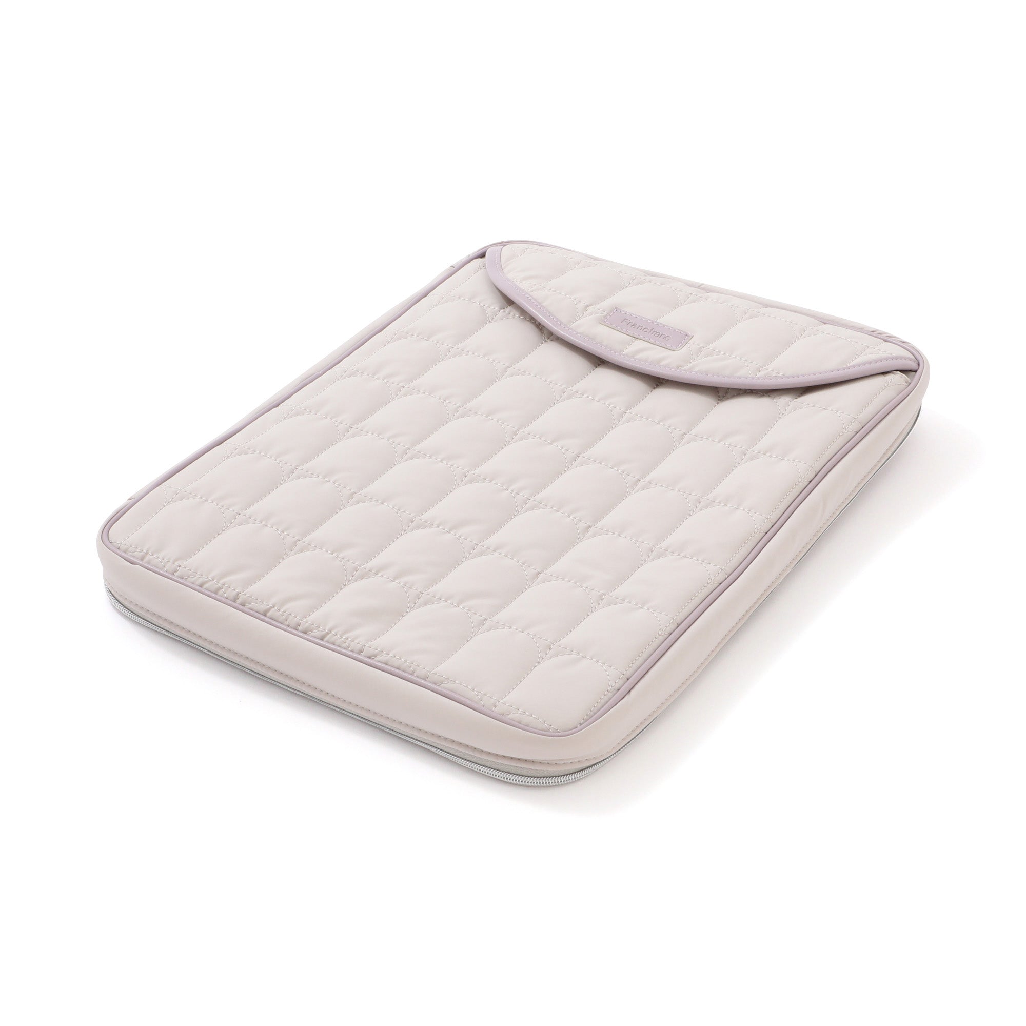 アーチ模様のキルトがトレンドライクなパソコンケースです。外ポケットにはマウスや充電器、スマホなどが収納可能です。横向きに開けばそのまま上にPCを置いて使用することが可能です。取外し可能なショルダーが付いているので、持ち運びにも便利です。バイカラーで、トレンド感ありつつも取り入れやすいカラーリングです。※付属のショルダー紐をご使用の際は、本体の引き手の位置が真上にあることをご確認のうえ、ご使用ください。